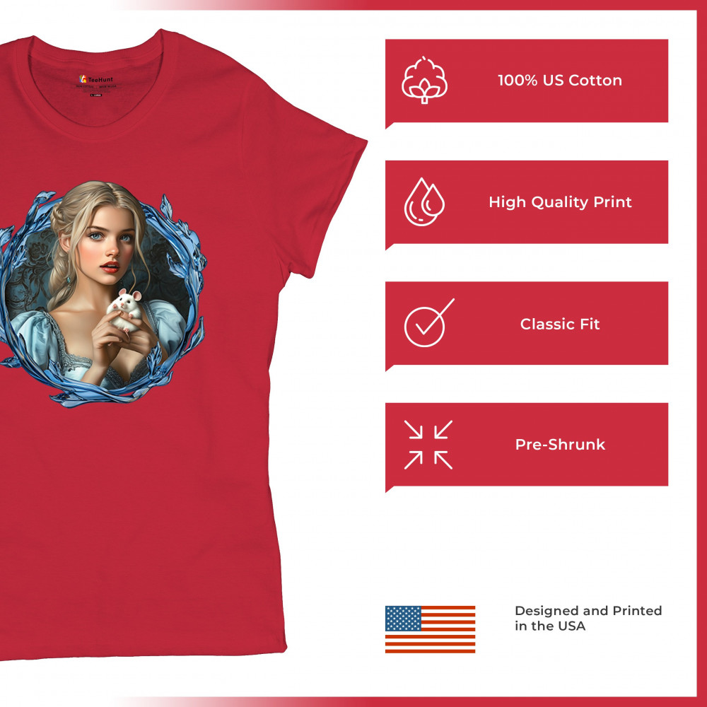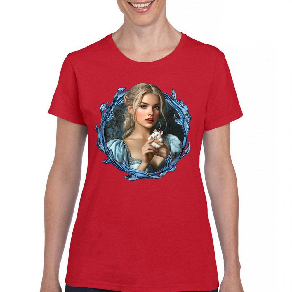 A whimsical design inspired by fairytales and Cinderella magic, featuring a blonde girl in a blue dress holding a white mouse. The icy blue leaf frame evokes enchantment and transformation. With soft, vintage tones and a dreamy feel, it’s a charming tribute to kindness, fantasy, animal companionship, and gentle storytelling magic.