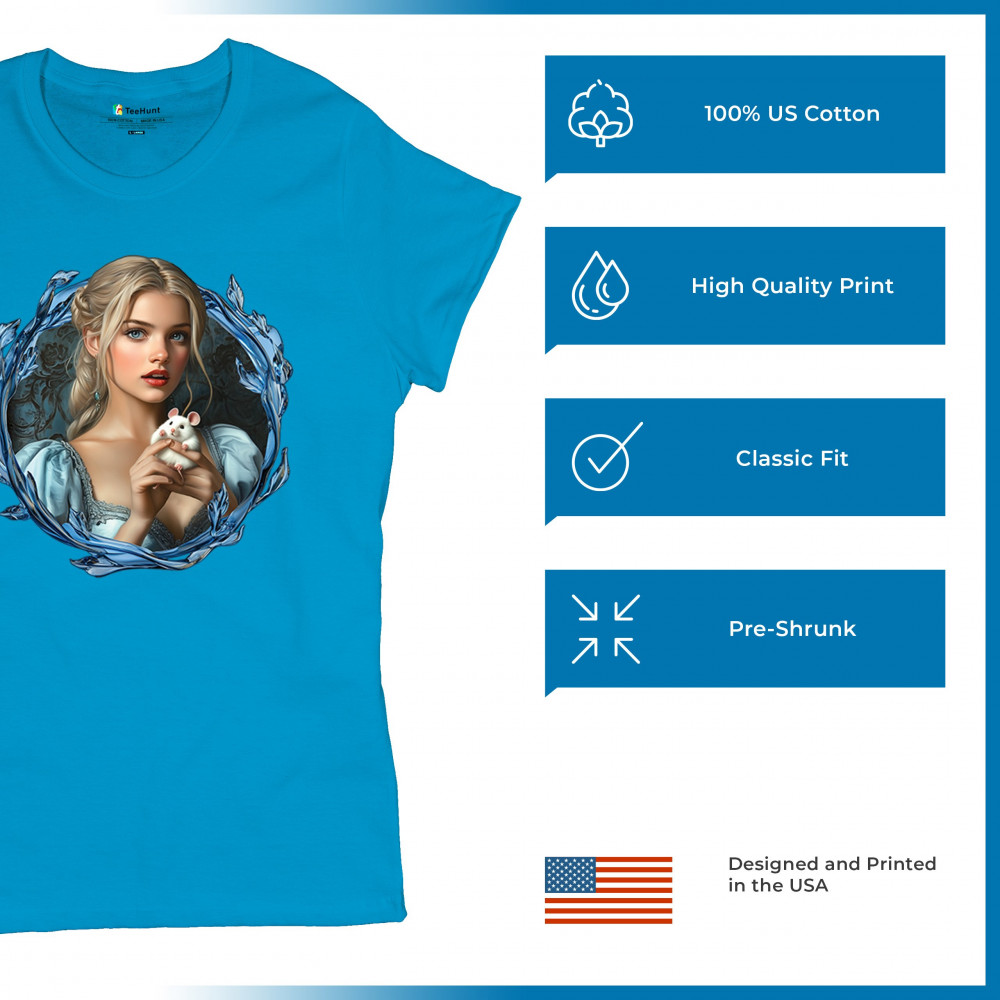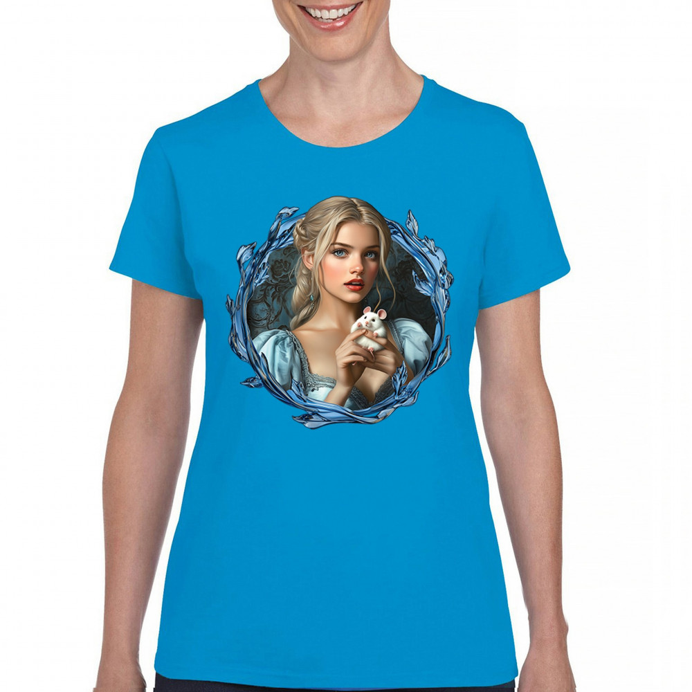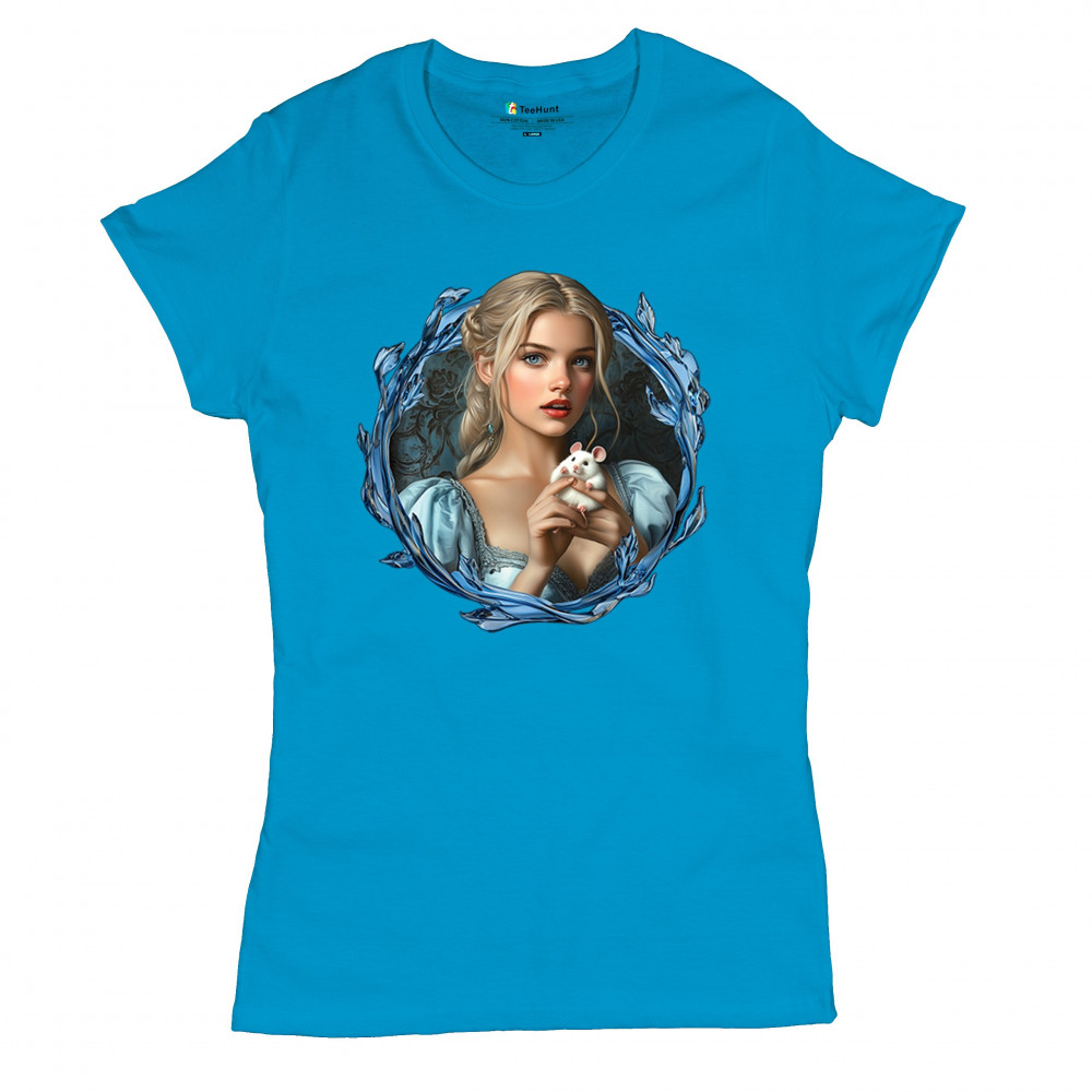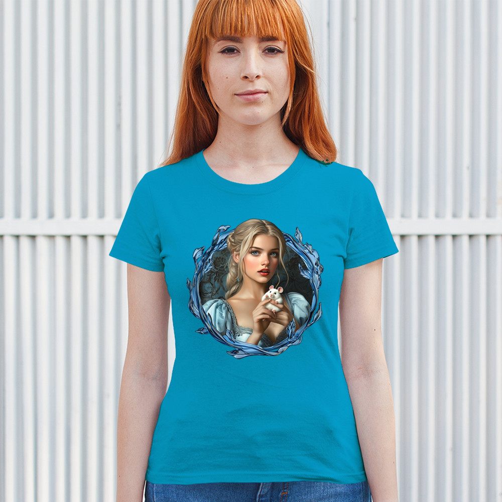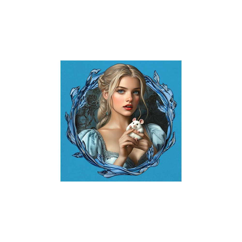 A whimsical design inspired by fairytales and Cinderella magic, featuring a blonde girl in a blue dress holding a white mouse. The icy blue leaf frame evokes enchantment and transformation. With soft, vintage tones and a dreamy feel, it’s a charming tribute to kindness, fantasy, animal companionship, and gentle storytelling magic.