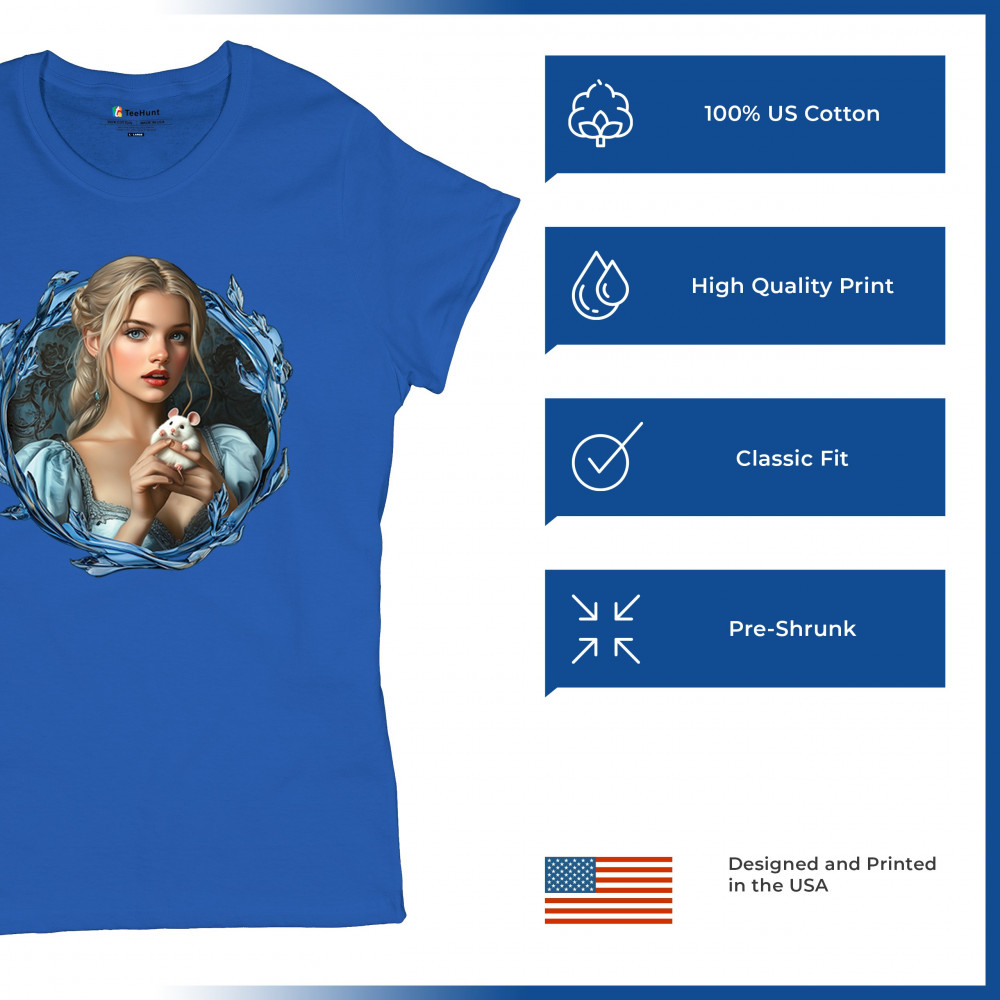 Fairytale design of blonde girl with white mouse in blue leaf frame. Inspired by Cinderella themes of kindness, fantasy, and transformation.