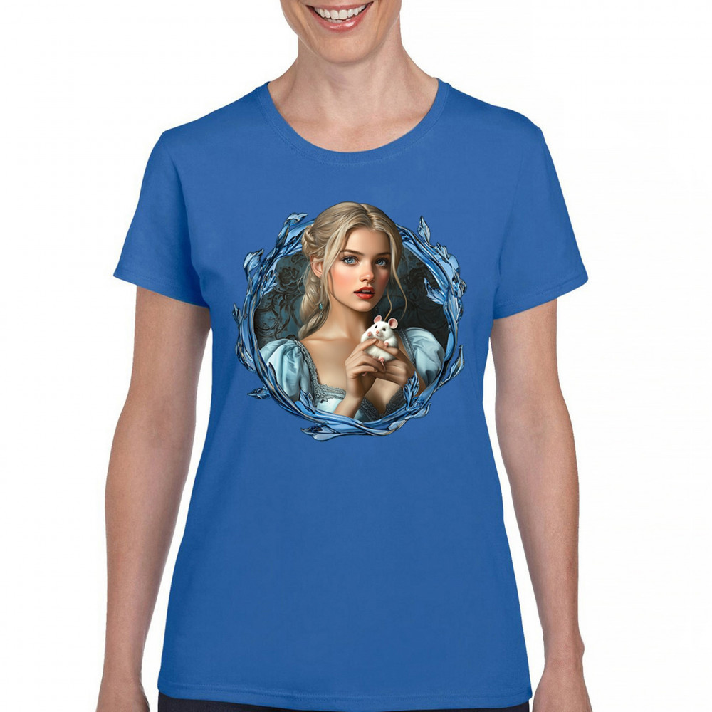 A whimsical design inspired by fairytales and Cinderella magic, featuring a blonde girl in a blue dress holding a white mouse. The icy blue leaf frame evokes enchantment and transformation. With soft, vintage tones and a dreamy feel, it’s a charming tribute to kindness, fantasy, animal companionship, and gentle storytelling magic.