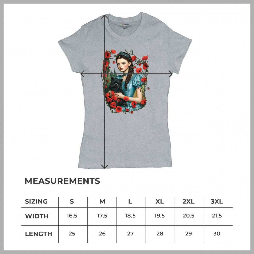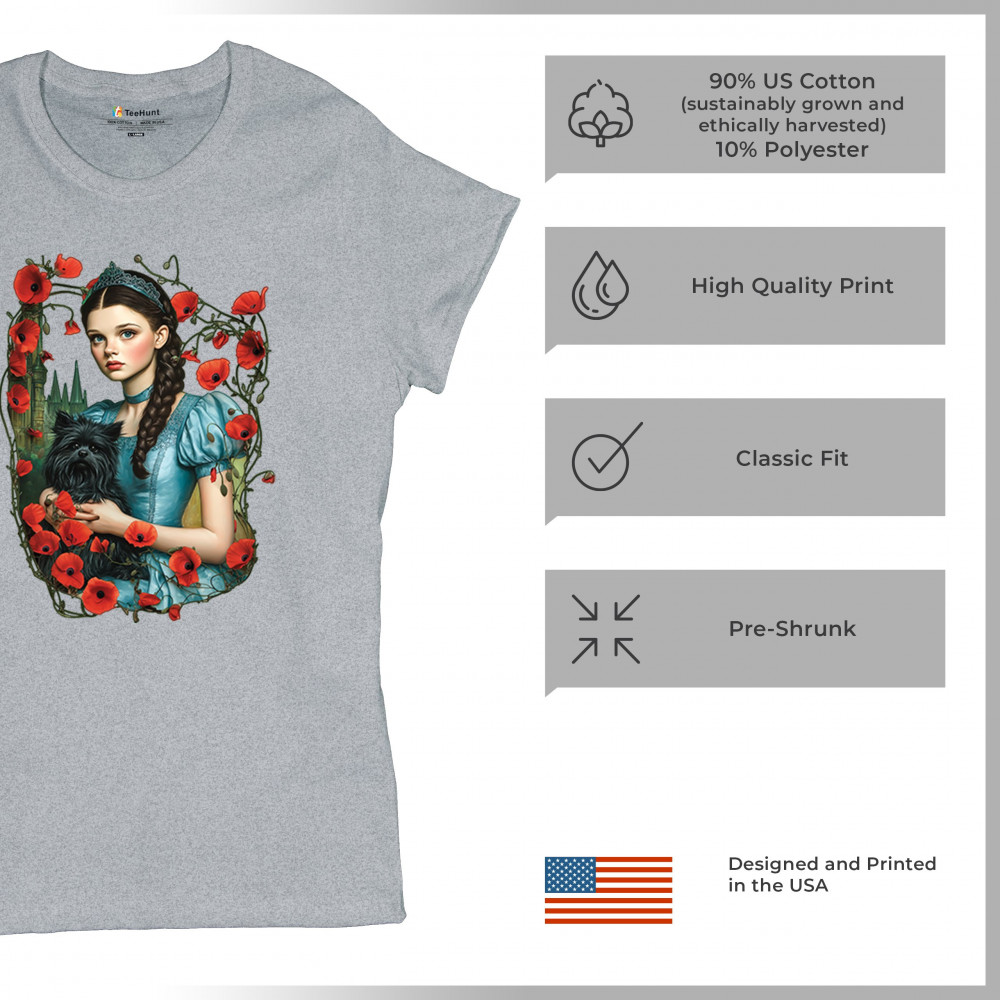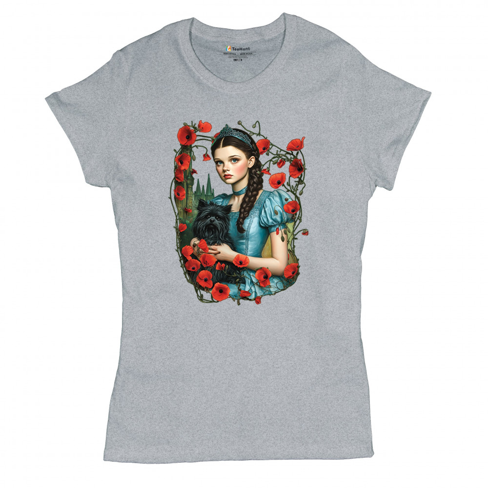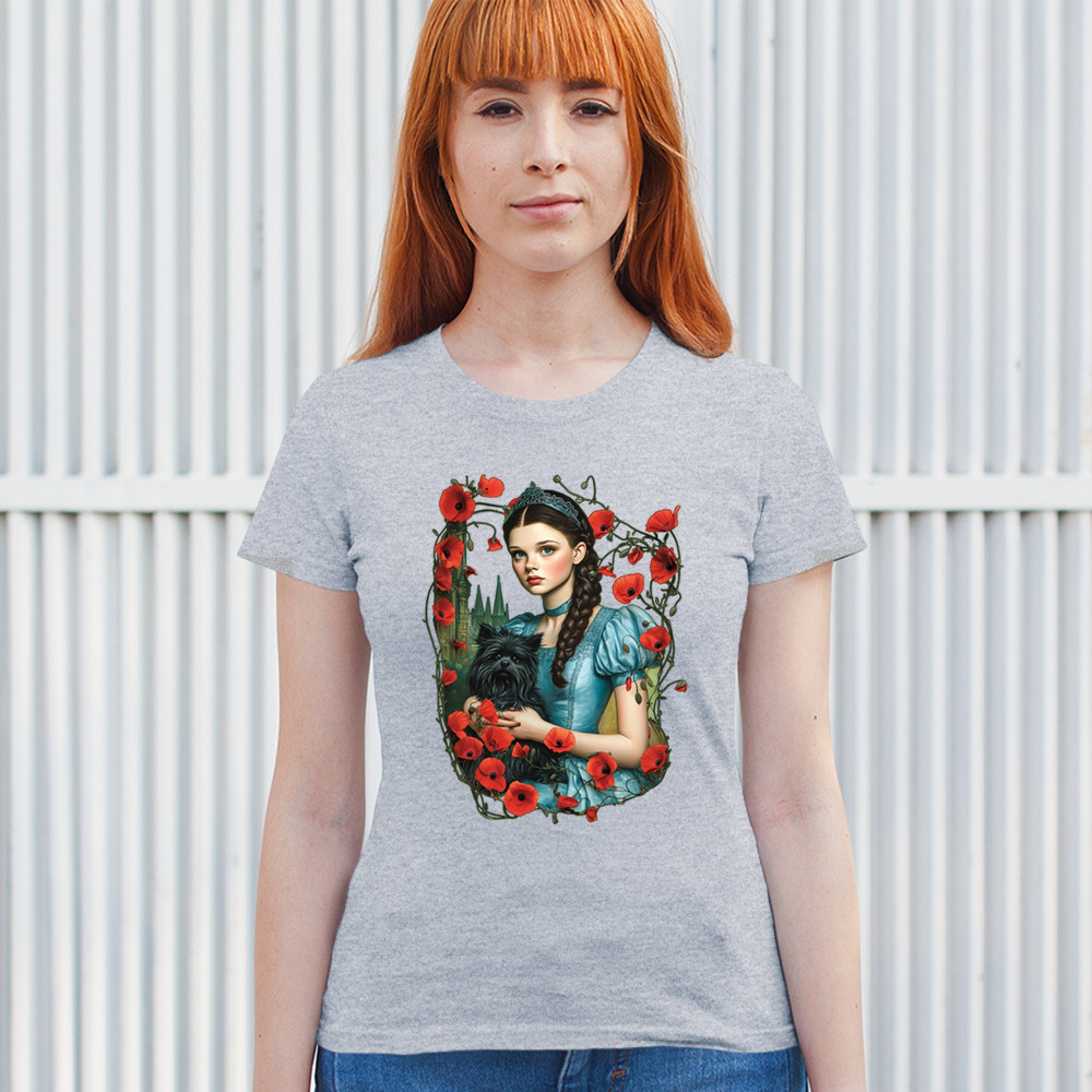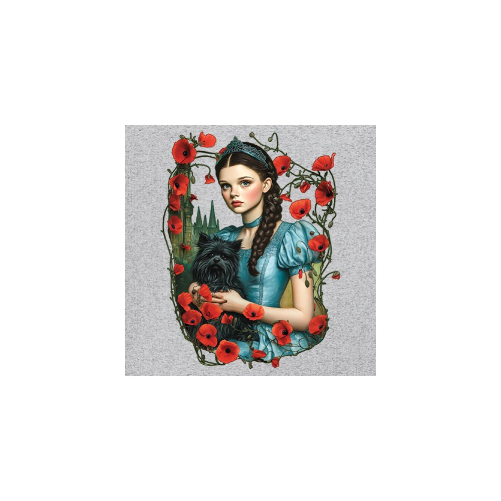 A charming design inspired by dark fairytales, featuring a girl in a blue dress holding her black dog amidst blooming red poppies. A distant castle and vintage styling channel Wizard of Oz fantasy with a gothic twist. Ideal for dreamers, nostalgic collectors, and lovers of whimsical storybook art filled with magic and memory.