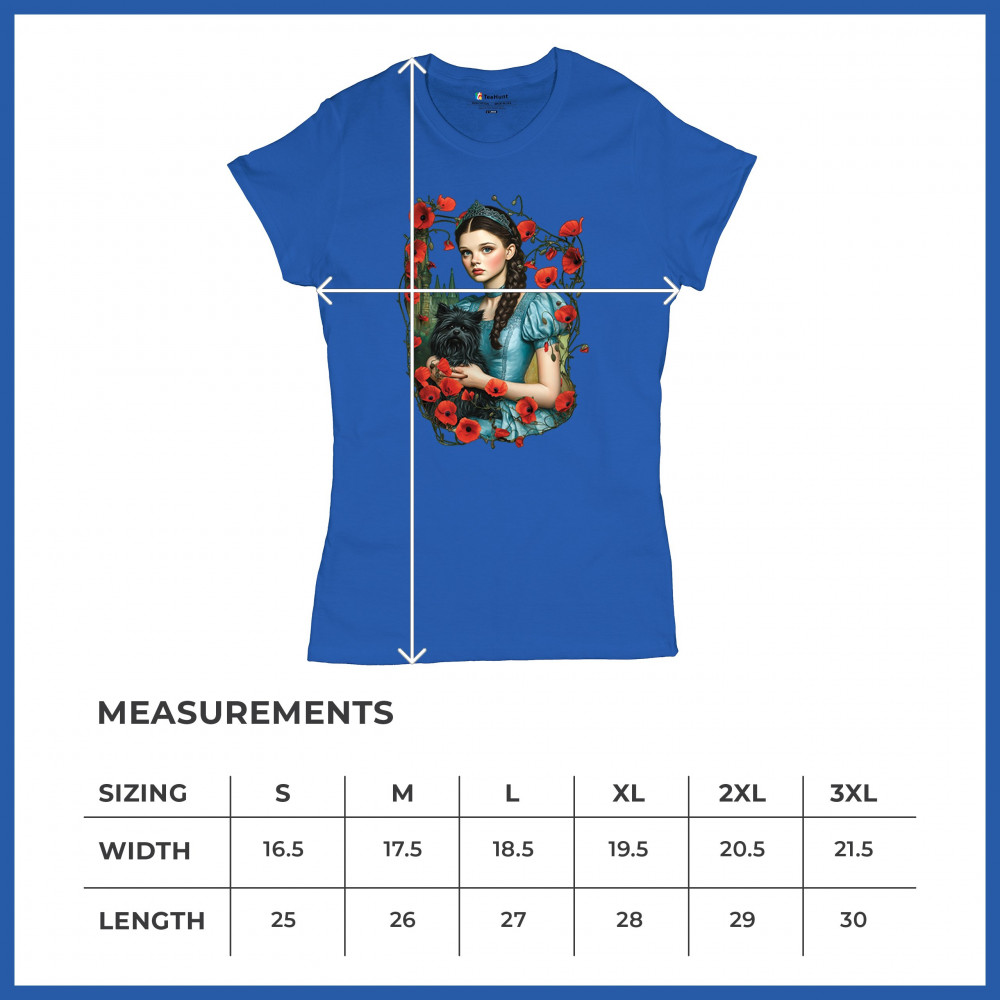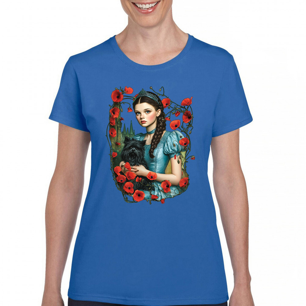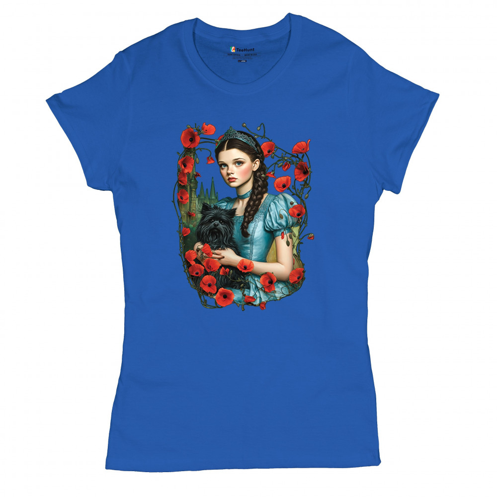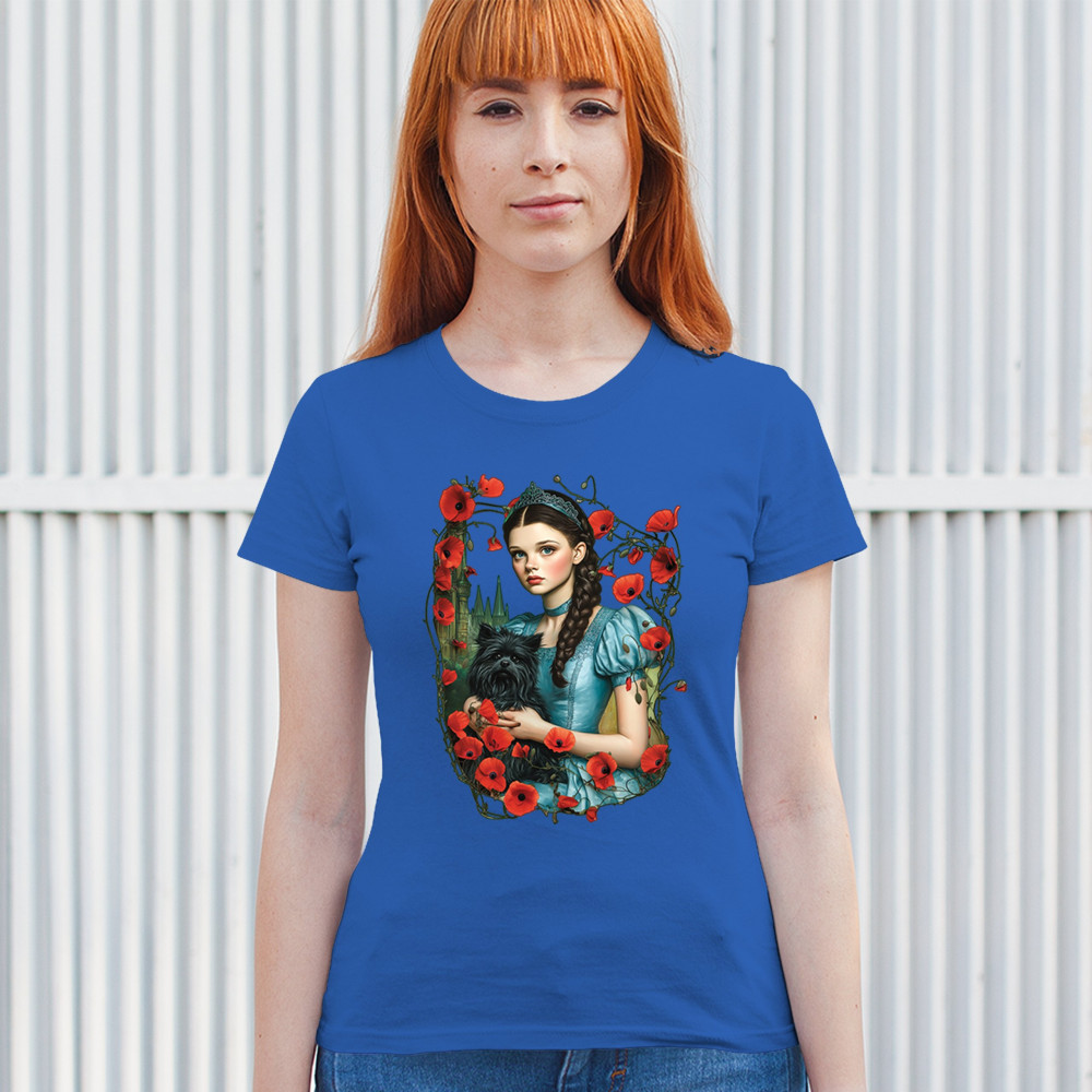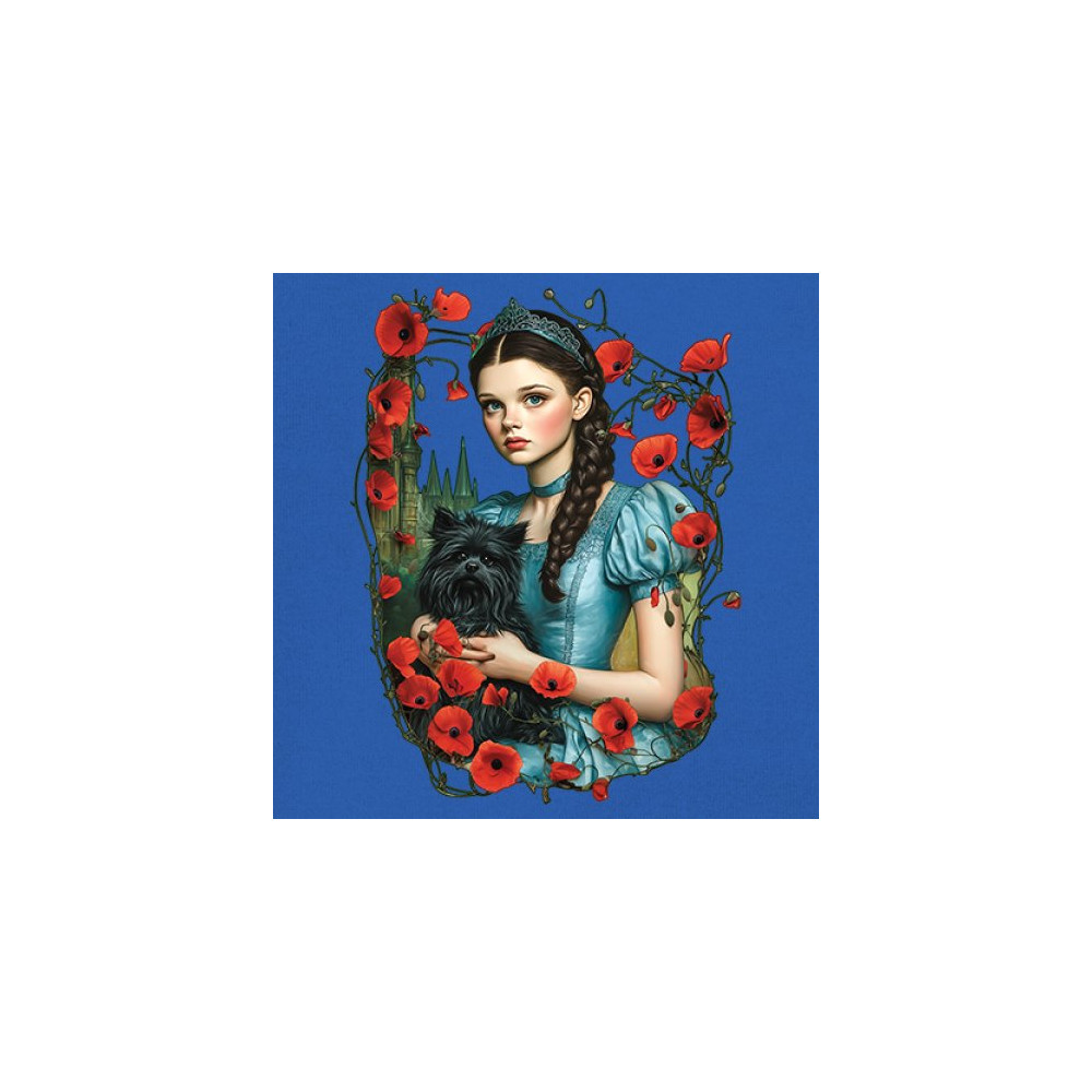 A charming design inspired by dark fairytales, featuring a girl in a blue dress holding her black dog amidst blooming red poppies. A distant castle and vintage styling channel Wizard of Oz fantasy with a gothic twist. Ideal for dreamers, nostalgic collectors, and lovers of whimsical storybook art filled with magic and memory.