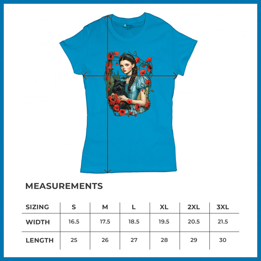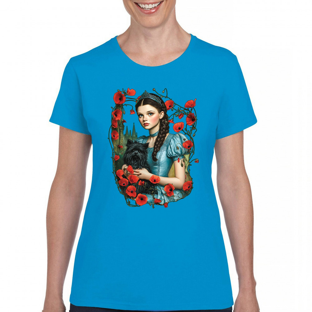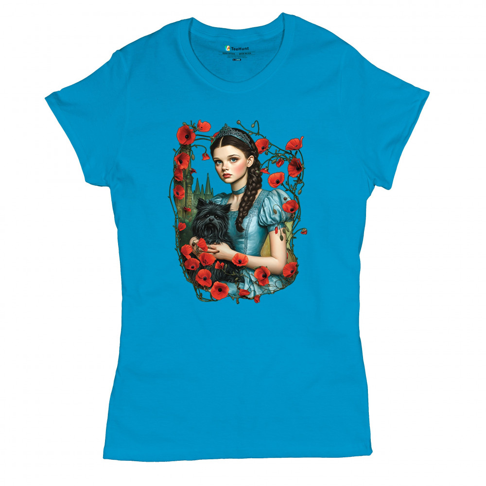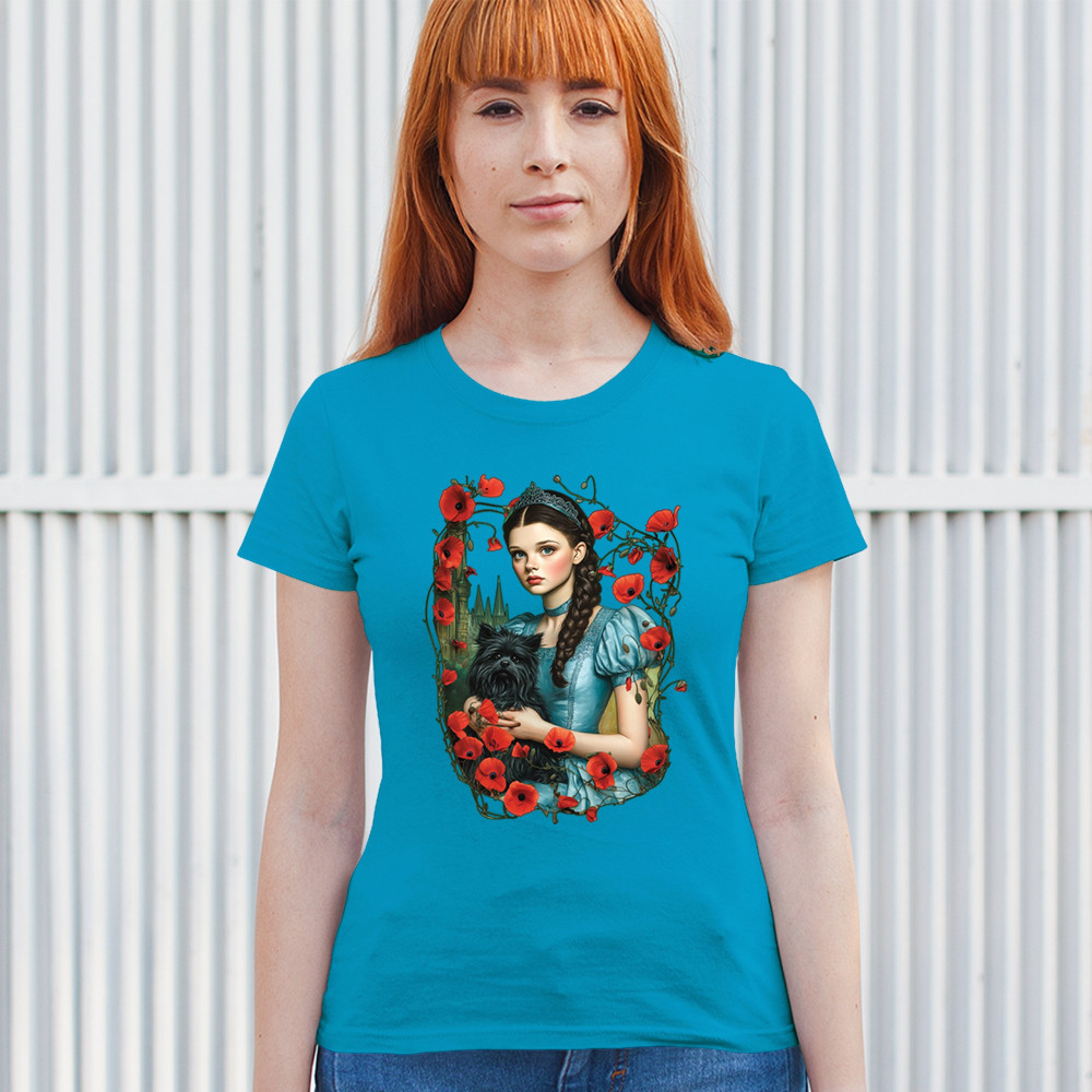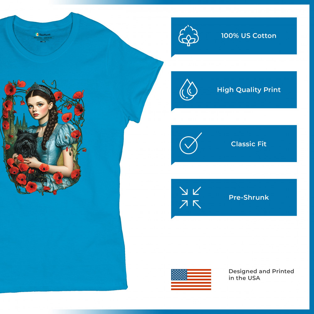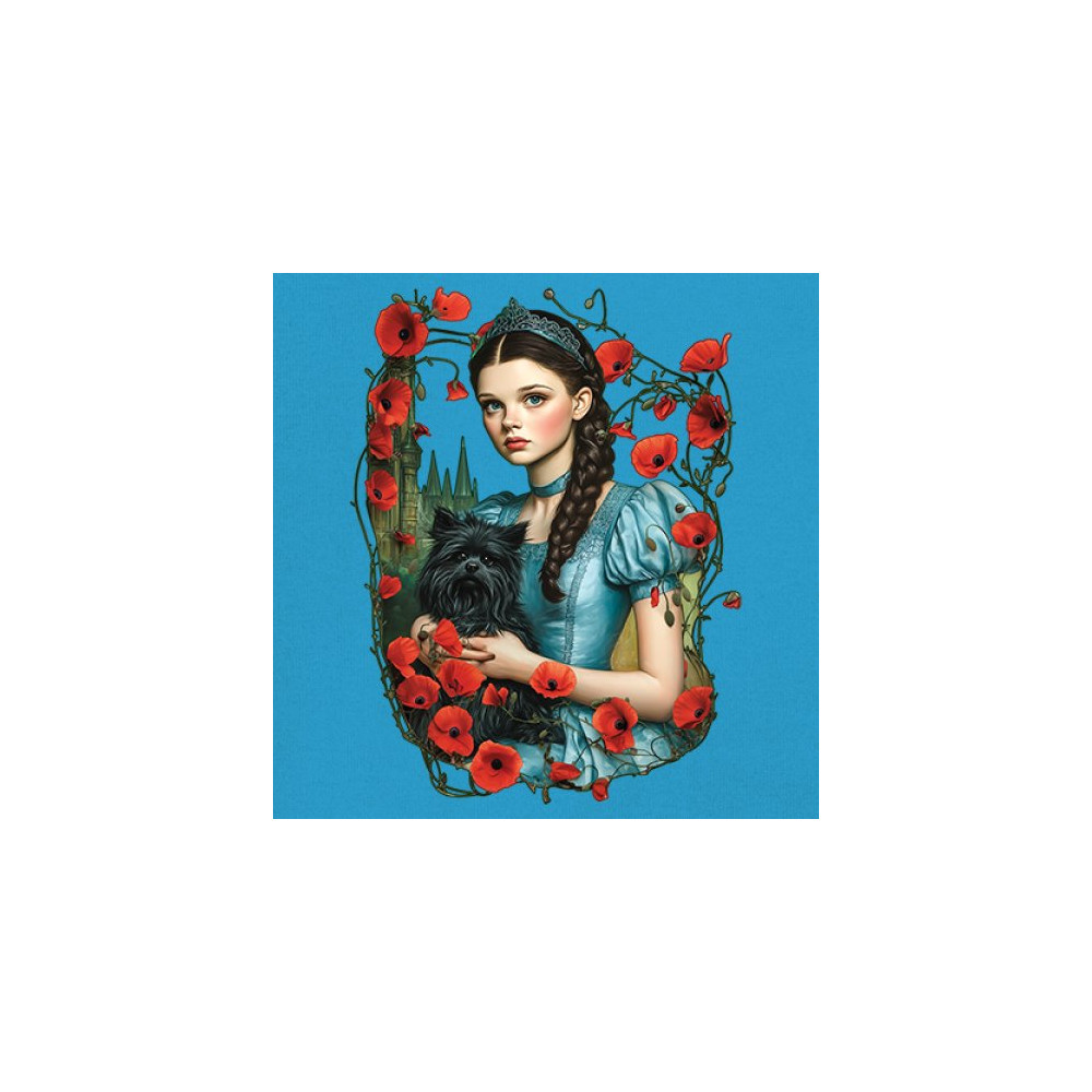 A charming design inspired by dark fairytales, featuring a girl in a blue dress holding her black dog amidst blooming red poppies. A distant castle and vintage styling channel Wizard of Oz fantasy with a gothic twist. Ideal for dreamers, nostalgic collectors, and lovers of whimsical storybook art filled with magic and memory.