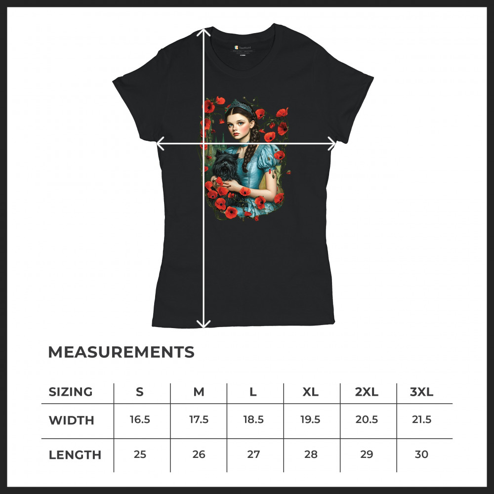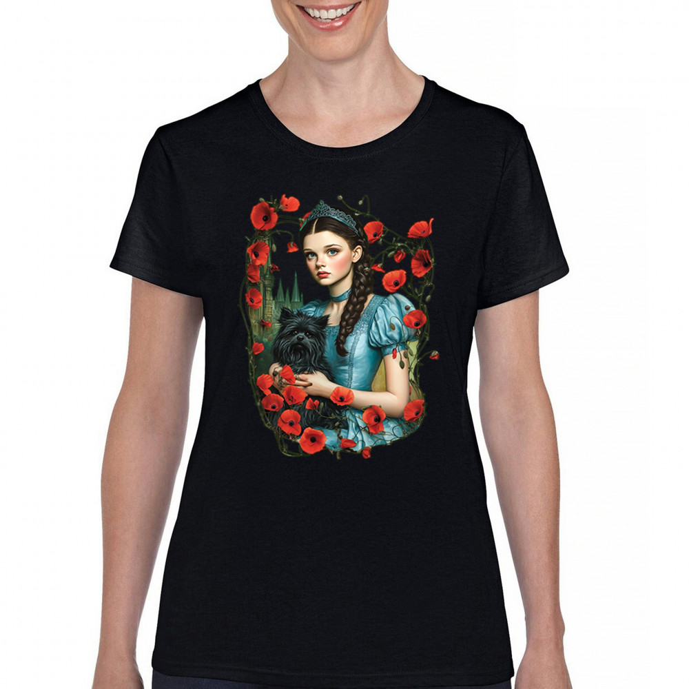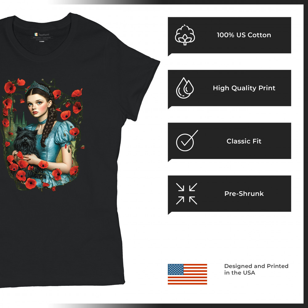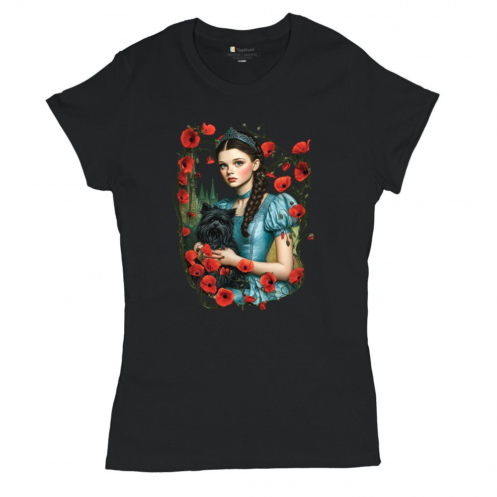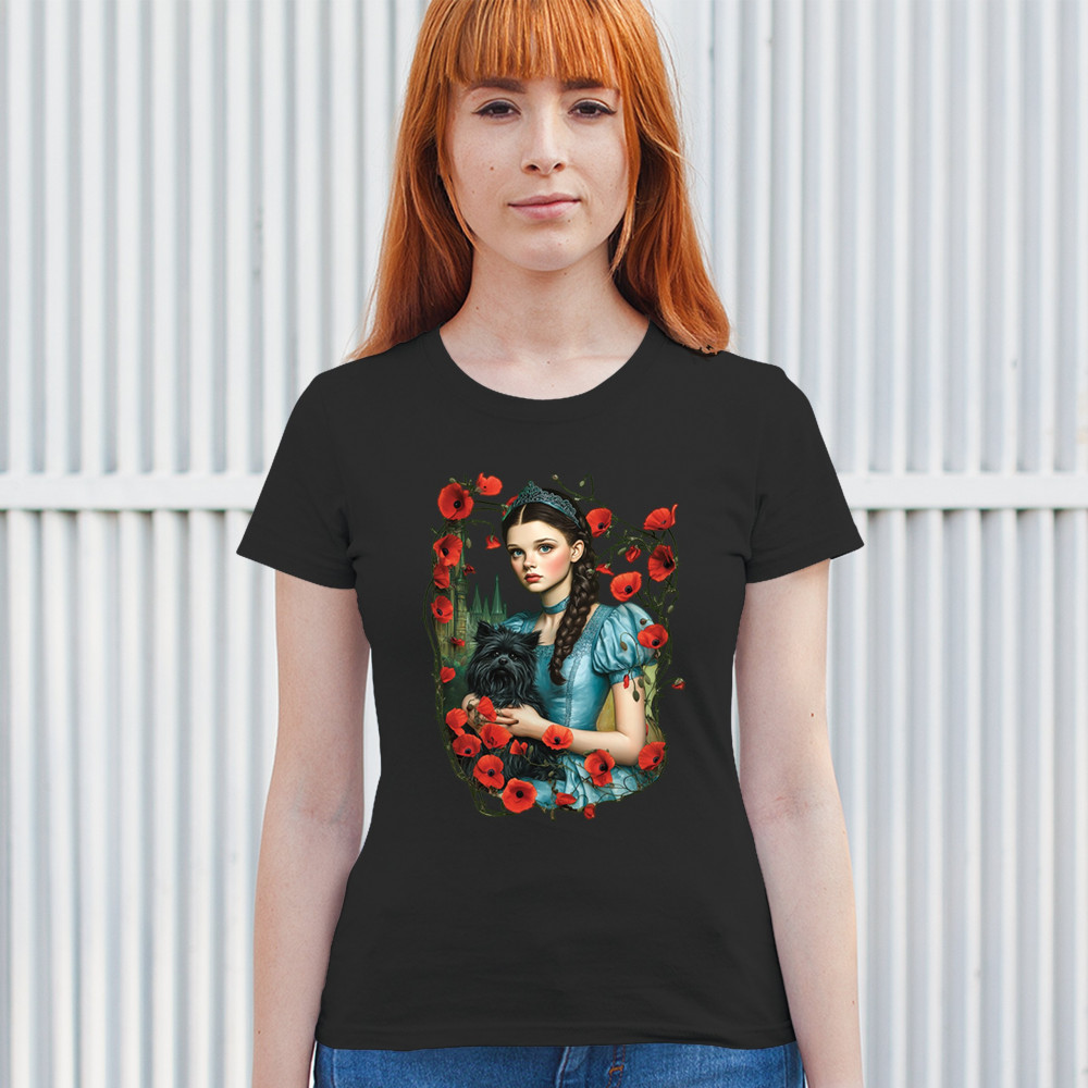 A charming design inspired by dark fairytales, featuring a girl in a blue dress holding her black dog amidst blooming red poppies. A distant castle and vintage styling channel Wizard of Oz fantasy with a gothic twist. Ideal for dreamers, nostalgic collectors, and lovers of whimsical storybook art filled with magic and memory.