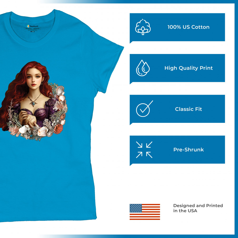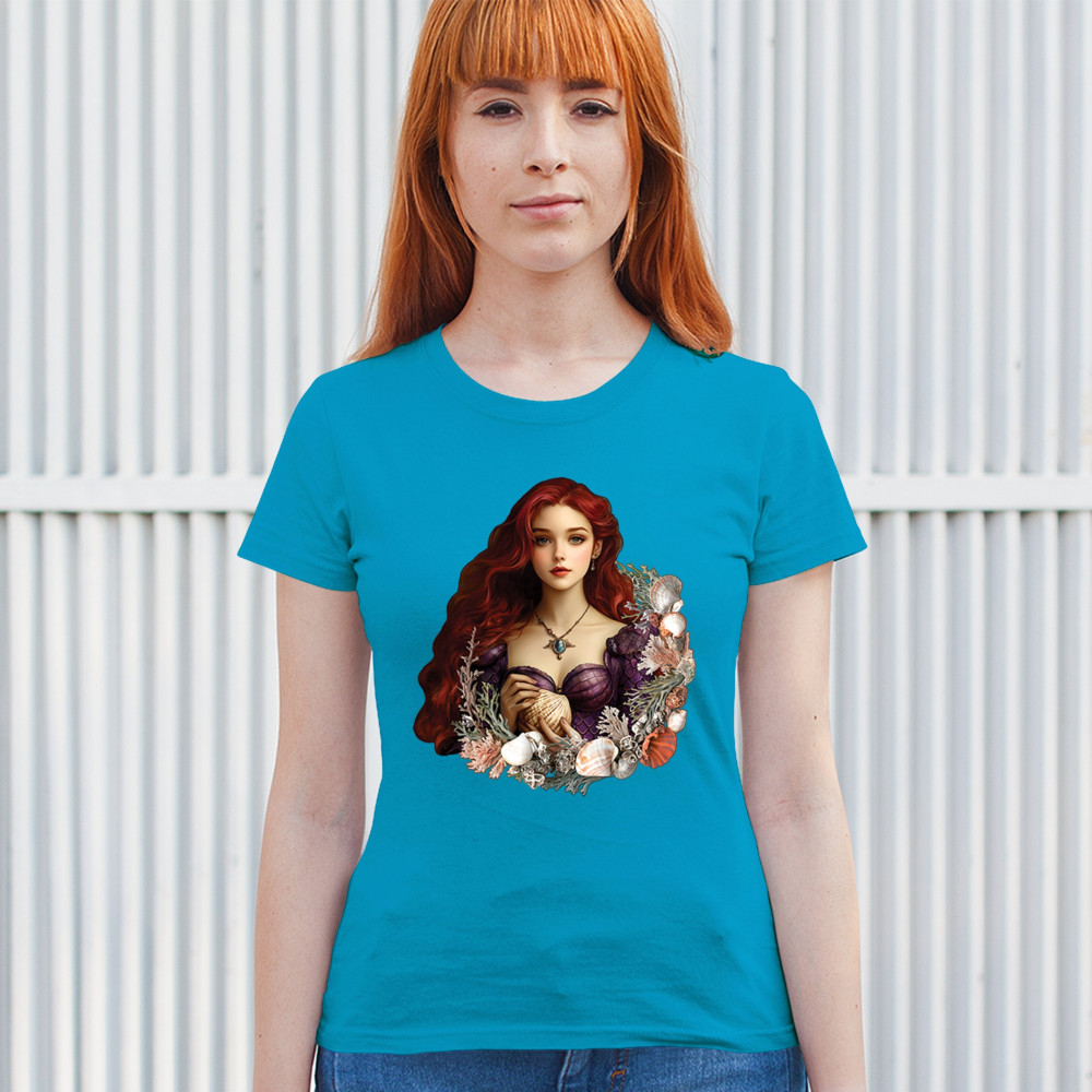 Fantasy mermaid design with red-haired girl, seashell dress, coral, and sea life. A dreamy tribute to marine magic and coastal fairytales.