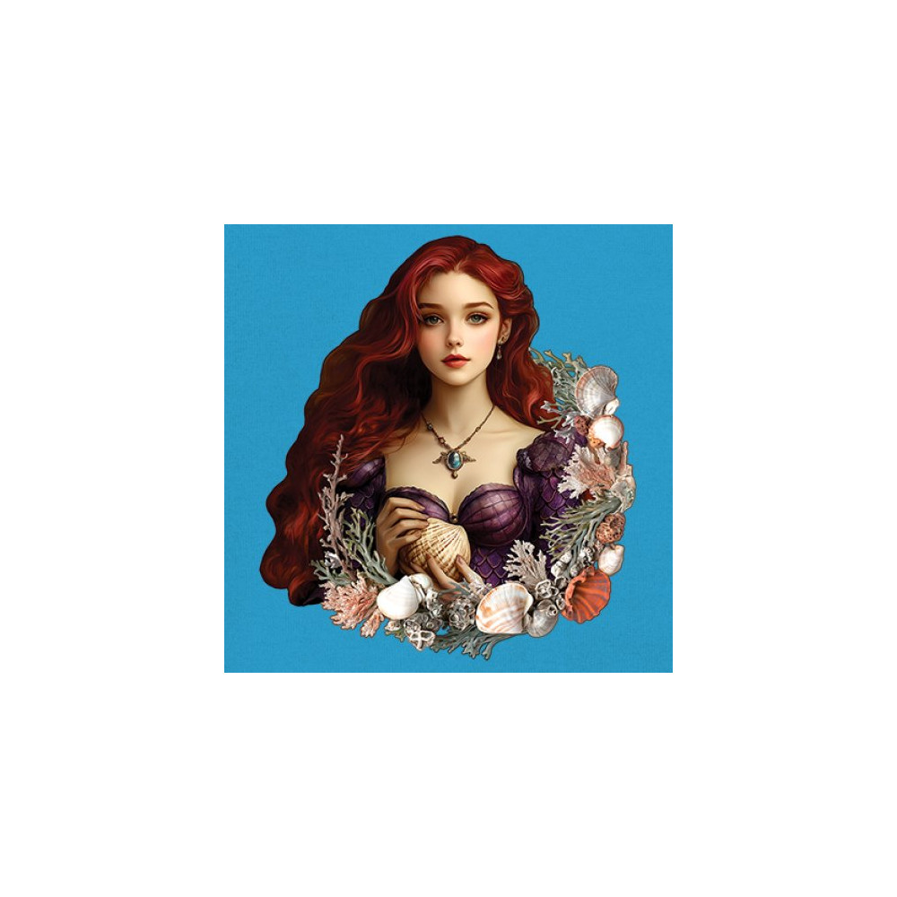 Inspired by mystical ocean themes, this design features a fantasy red-haired girl in a seashell dress, cradling a large shell. She is framed by coral, seaweed, and a shimmering array of ocean shells. With nods to classic mermaid lore and fairytale storytelling, it's perfect for fans of fantasy creatures, marine magic, and romantic ocean legends.