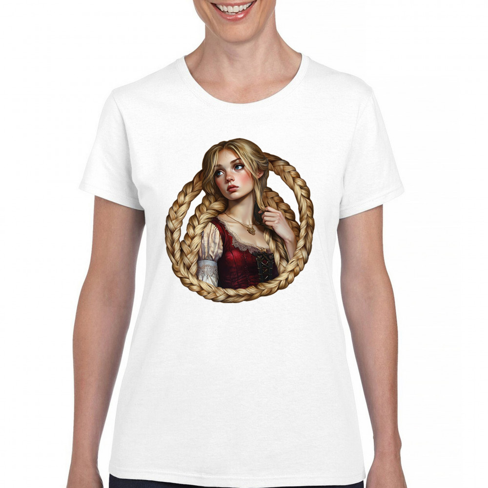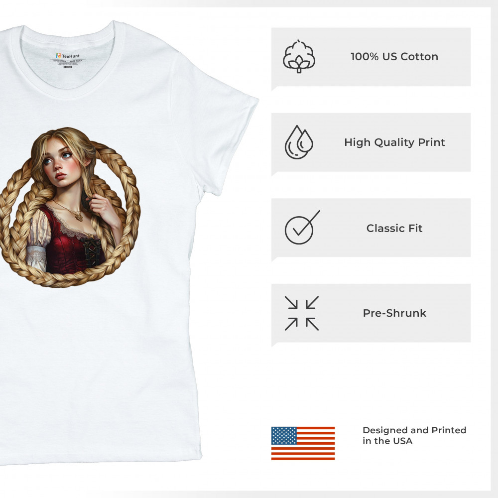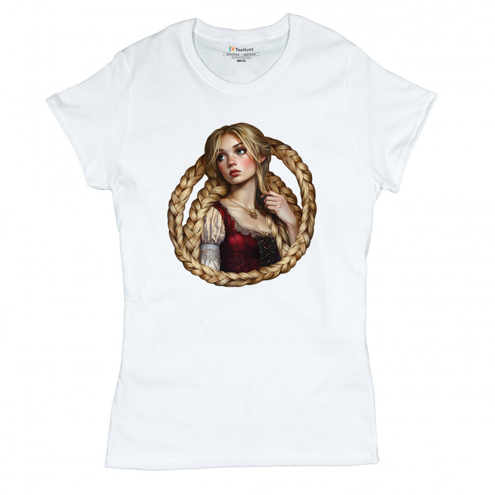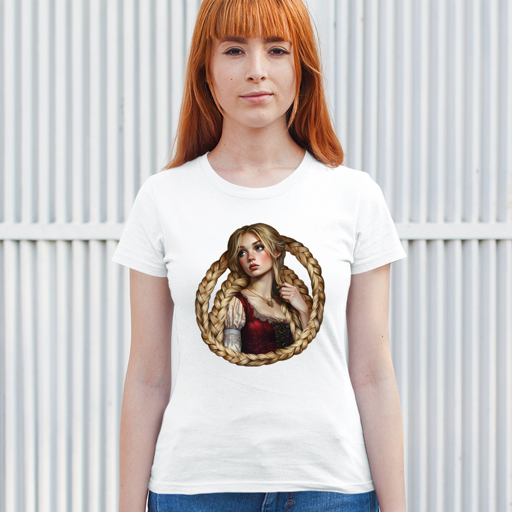 A dreamy design featuring a blonde girl with long braided hair encircling her like a frame. With vintage dress details and a wistful look, this artwork channels the essence of fairytales, romantic legends, and gentle feminine power. Ideal for fantasy lovers, folklore fans, and collectors of magical storybook themes.