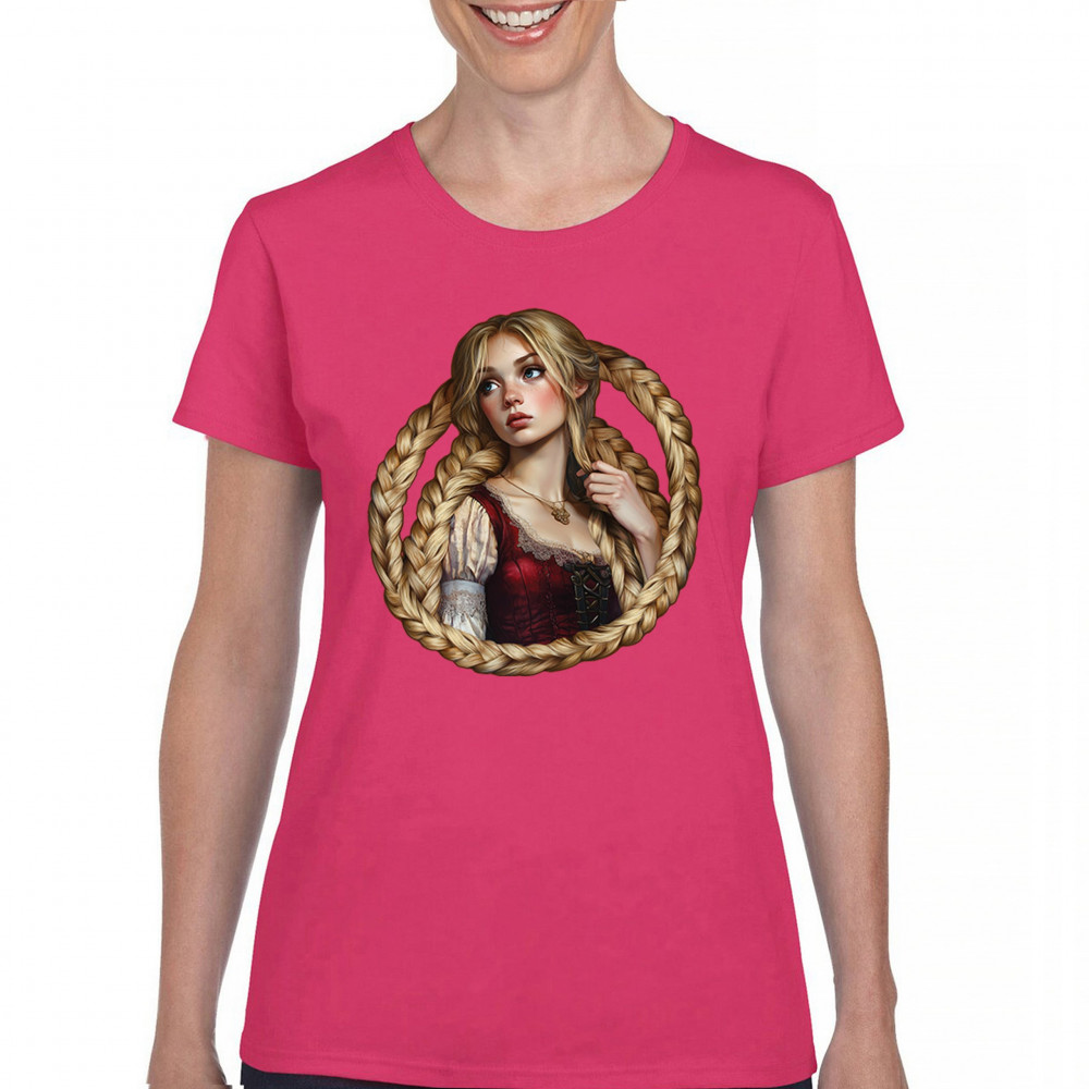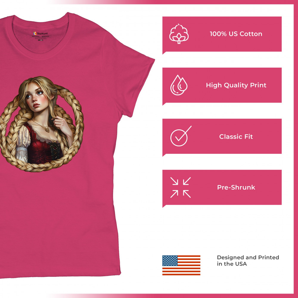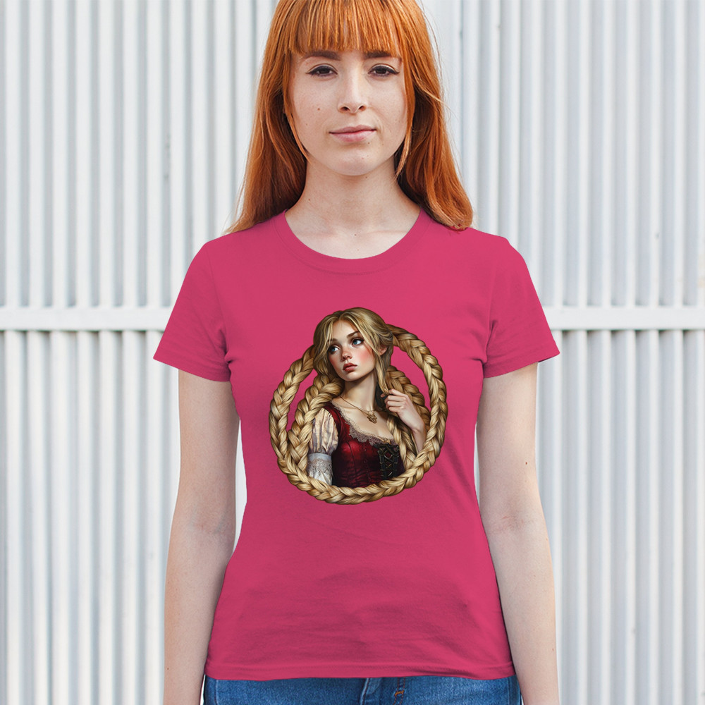 A dreamy design featuring a blonde girl with long braided hair encircling her like a frame. With vintage dress details and a wistful look, this artwork channels the essence of fairytales, romantic legends, and gentle feminine power. Ideal for fantasy lovers, folklore fans, and collectors of magical storybook themes.