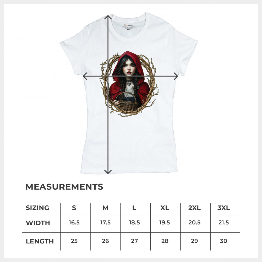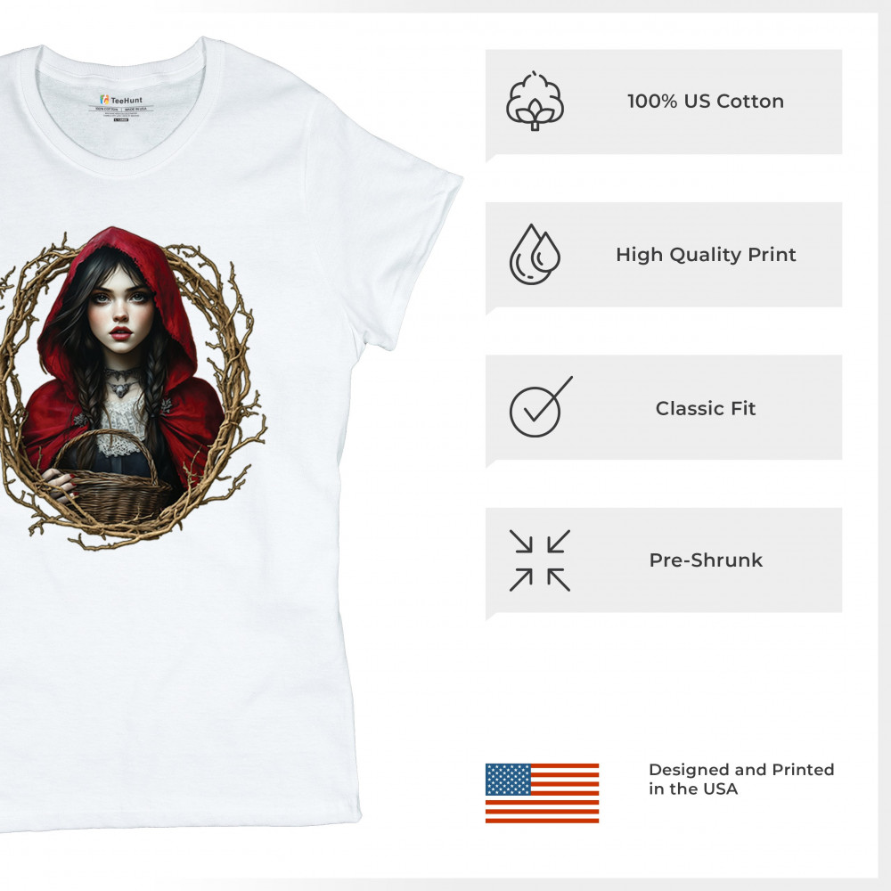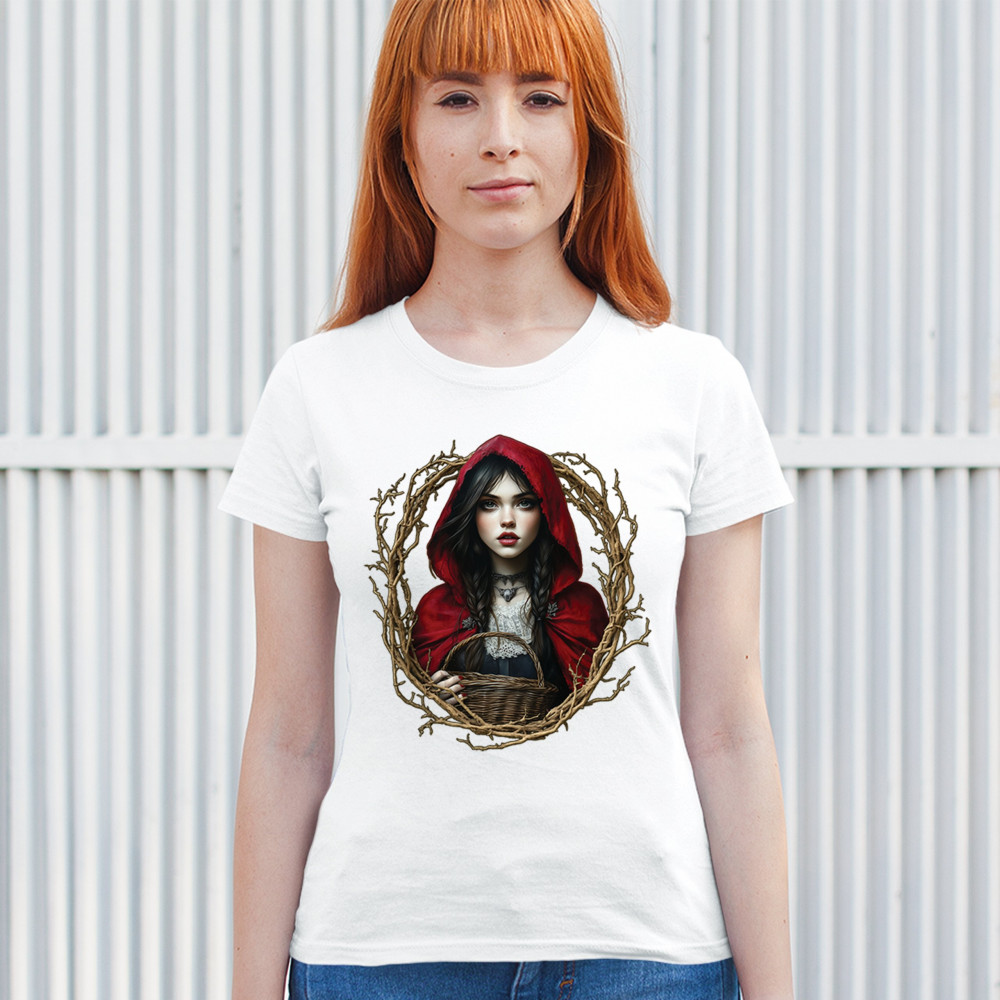 Step into a shadowy fairytale with this gothic design featuring a red-cloaked girl and twisted forest branches. Evoking themes from Red Riding Hood and folklore magic, it’s rich in fantasy, mystery, and dark aesthetic. Perfect for fantasy lovers, dark romantics, and storybook dreamers drawn to enchanted paths and eerie tales.