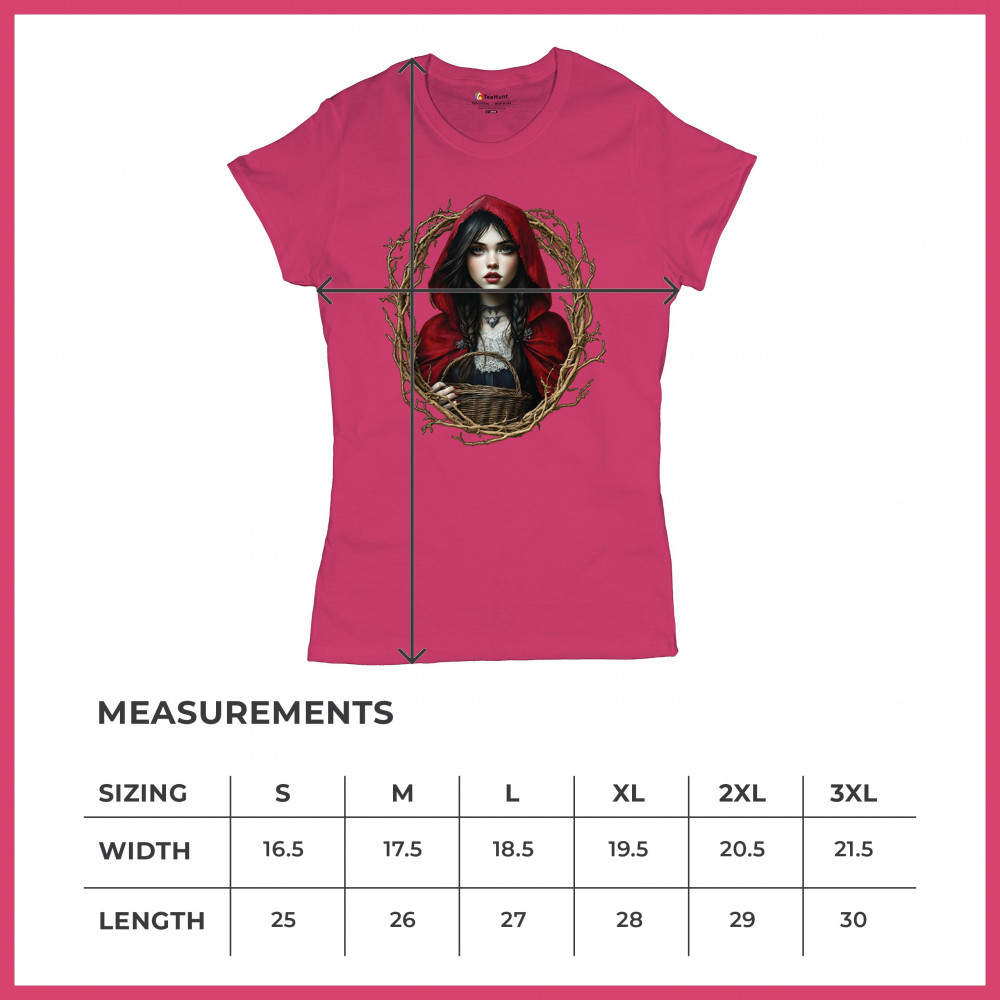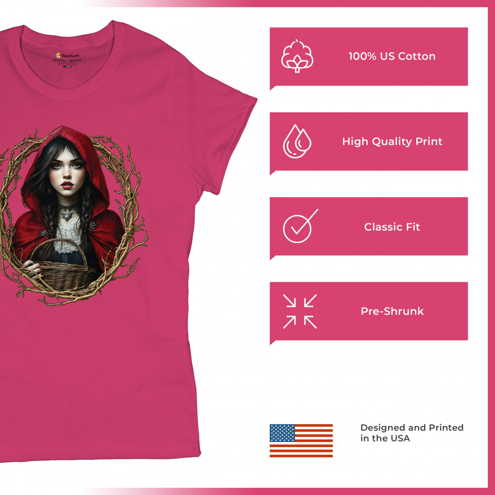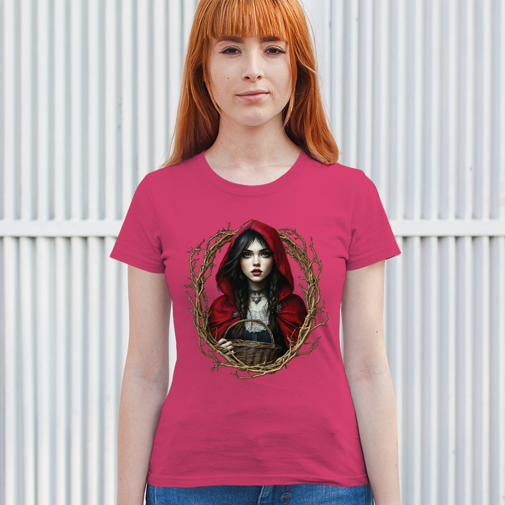 Step into a shadowy fairytale with this gothic design featuring a red-cloaked girl and twisted forest branches. Evoking themes from Red Riding Hood and folklore magic, it’s rich in fantasy, mystery, and dark aesthetic. Perfect for fantasy lovers, dark romantics, and storybook dreamers drawn to enchanted paths and eerie tales.