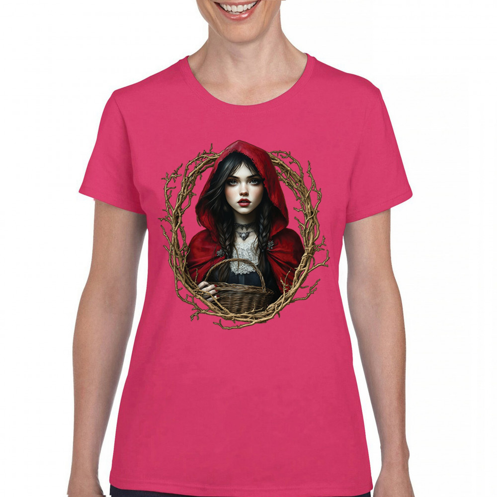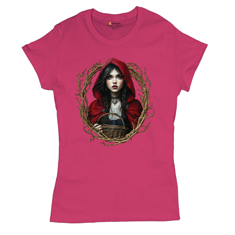 Gothic fairytale design with red cloak, forest branches, and moody magic. A dark, enchanting look for fantasy fans and folklore lovers.