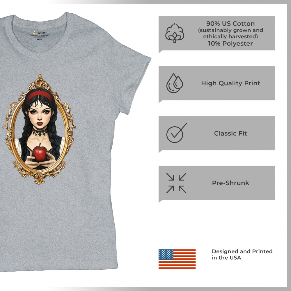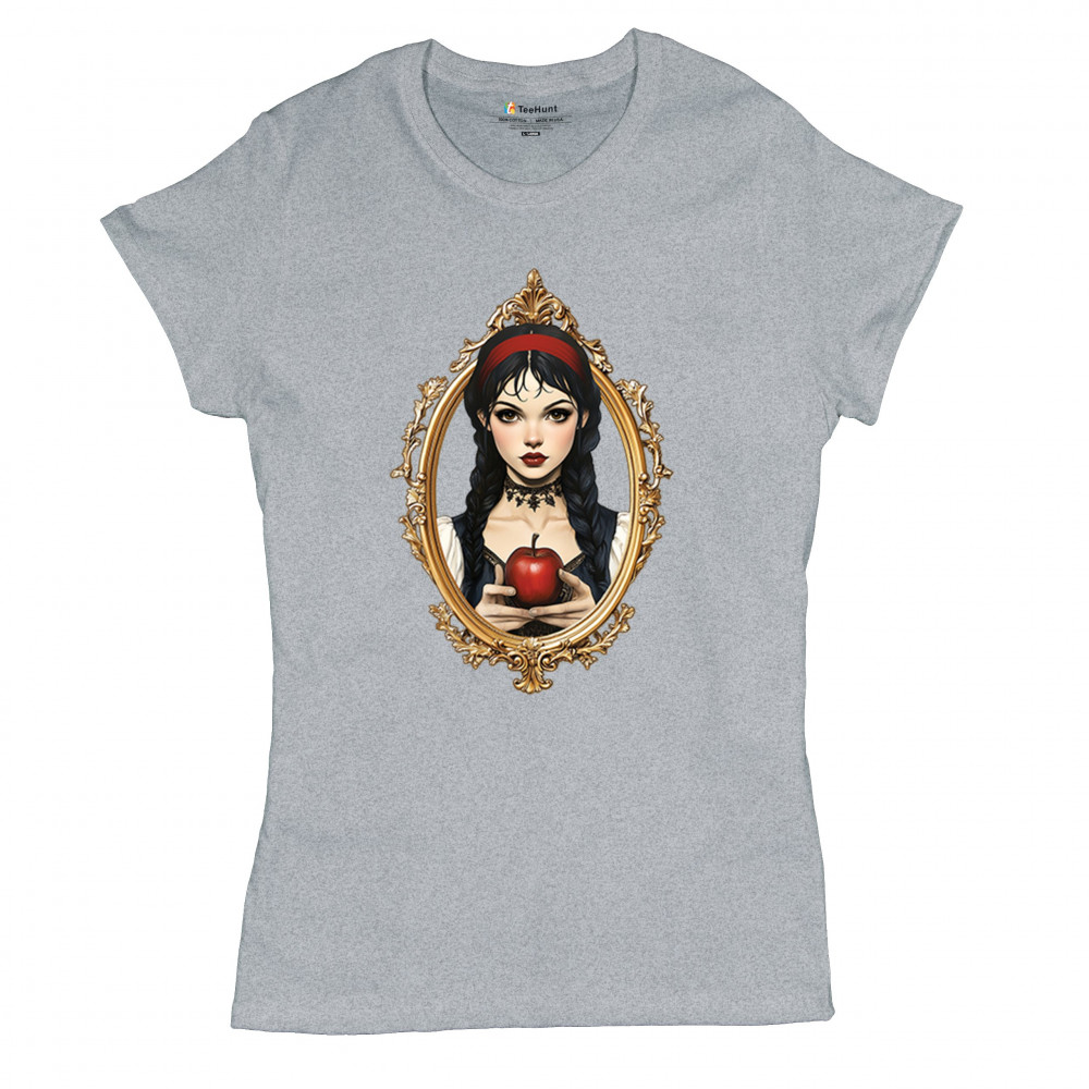 Dark fairytale design with red apple, gold frame, and Snow White vibes. A dreamy blend of fantasy, gothic style, and magical storytelling.