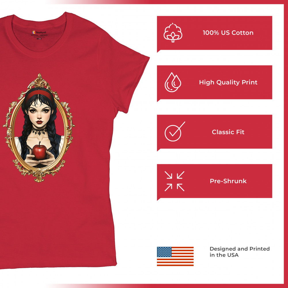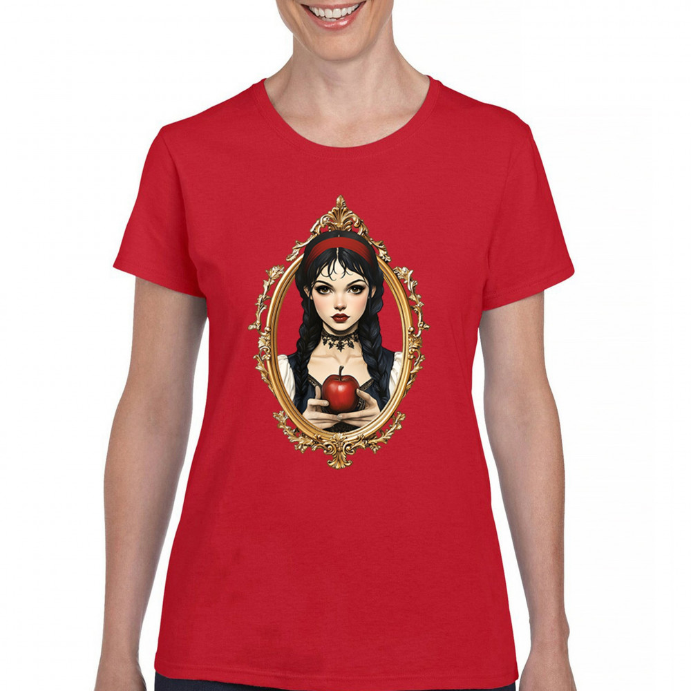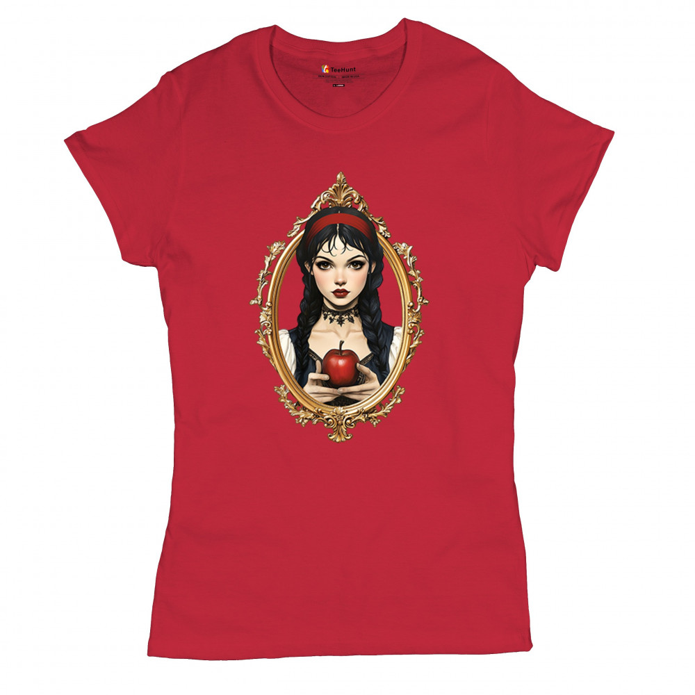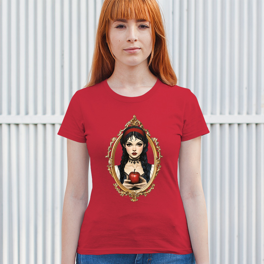 Dark fairytale design with red apple, gold frame, and Snow White vibes. A dreamy blend of fantasy, gothic style, and magical storytelling.