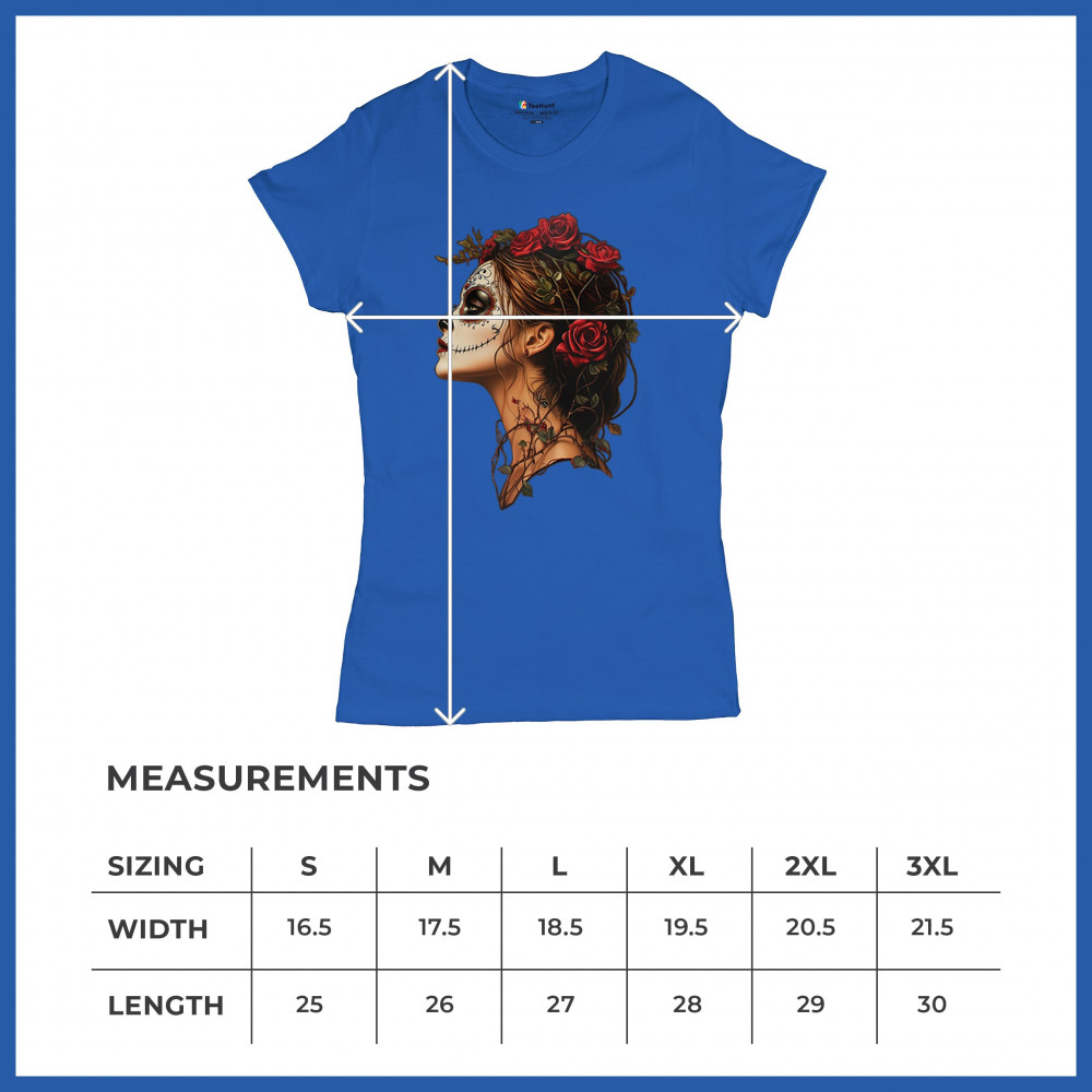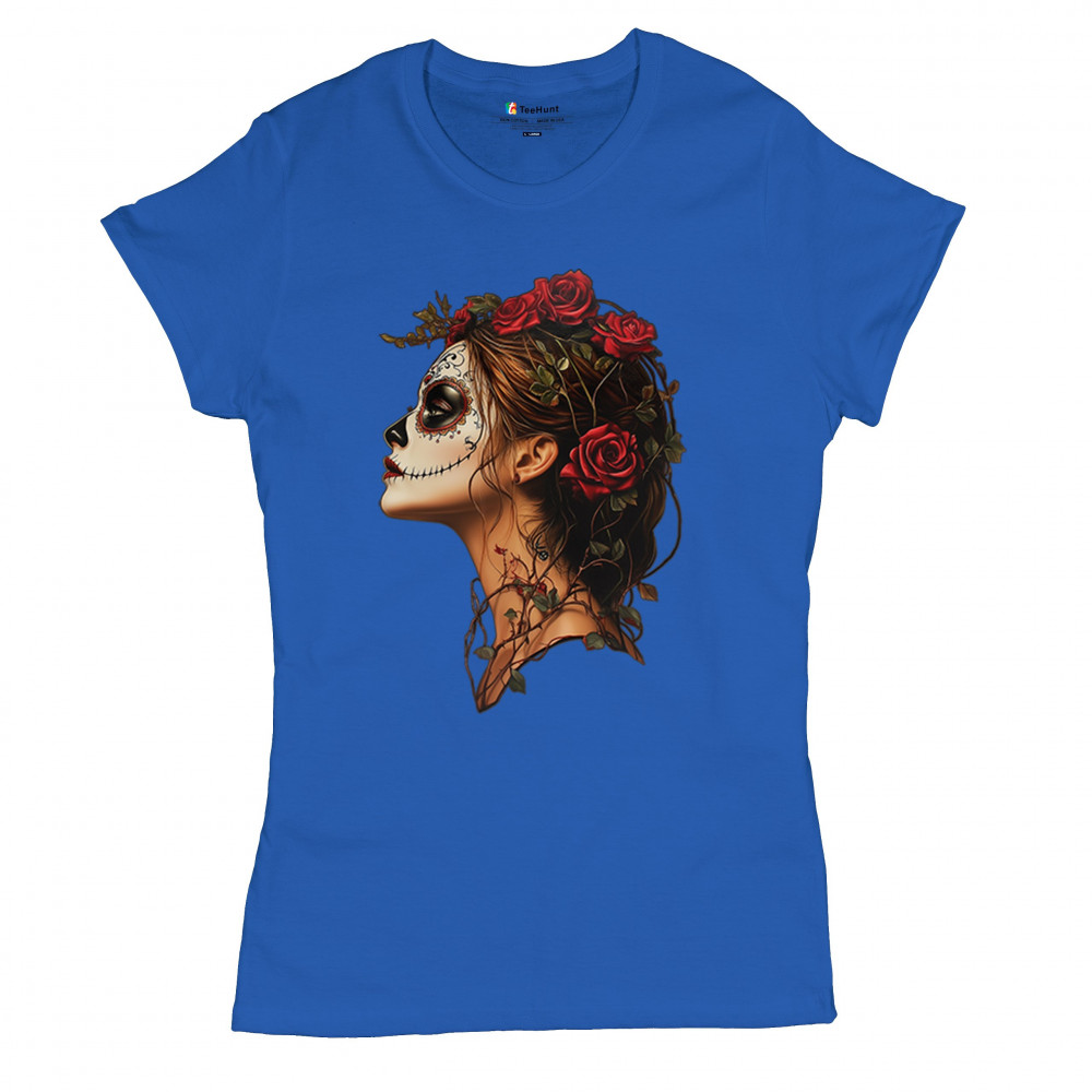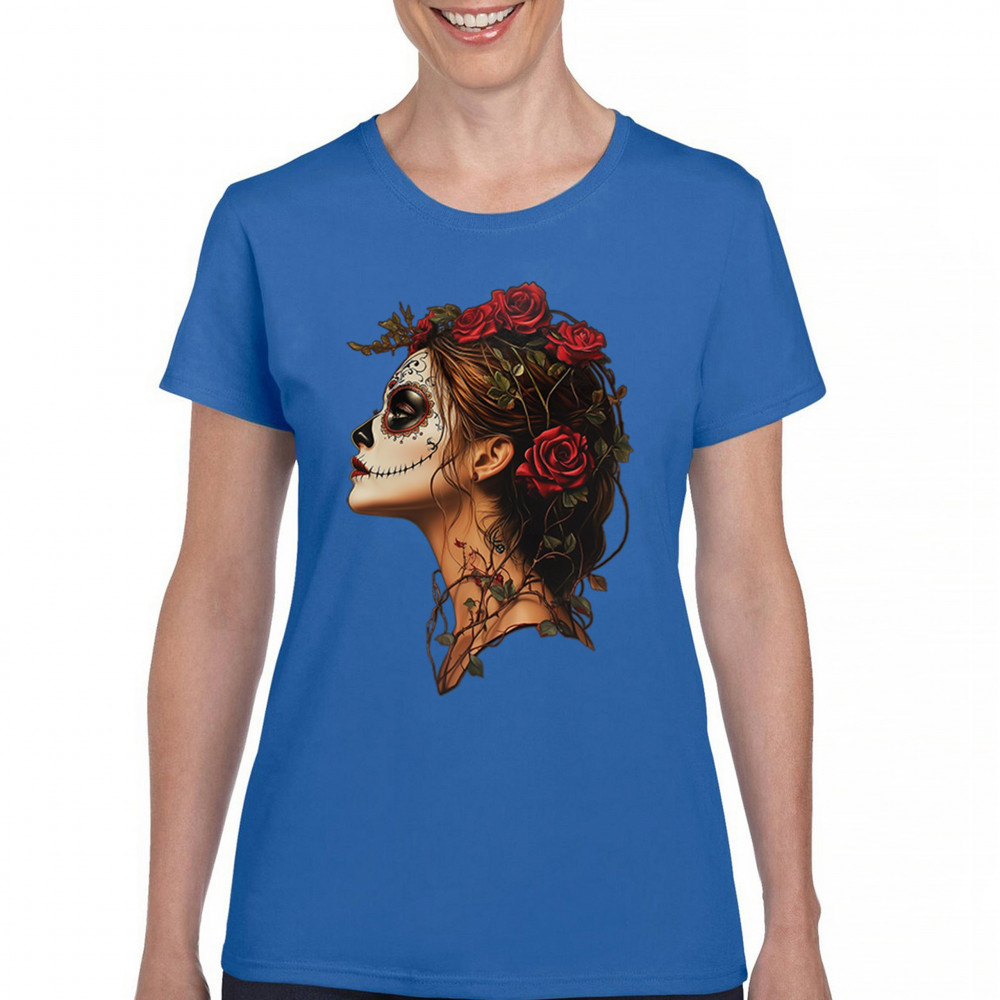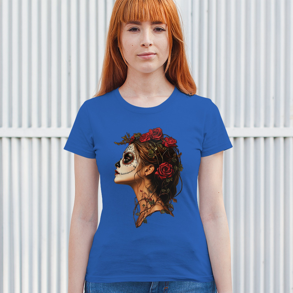 Celebrate feminine power and gothic elegance with this captivating DÃa de los Muertos design. Featuring a woman in profile with sugar skull makeup, blooming red roses, natural vines, dark hair, and symbolic floral skull art, this bold tribute captures beauty, death, and strength in one romantic, detailed visual.