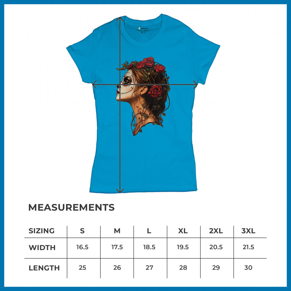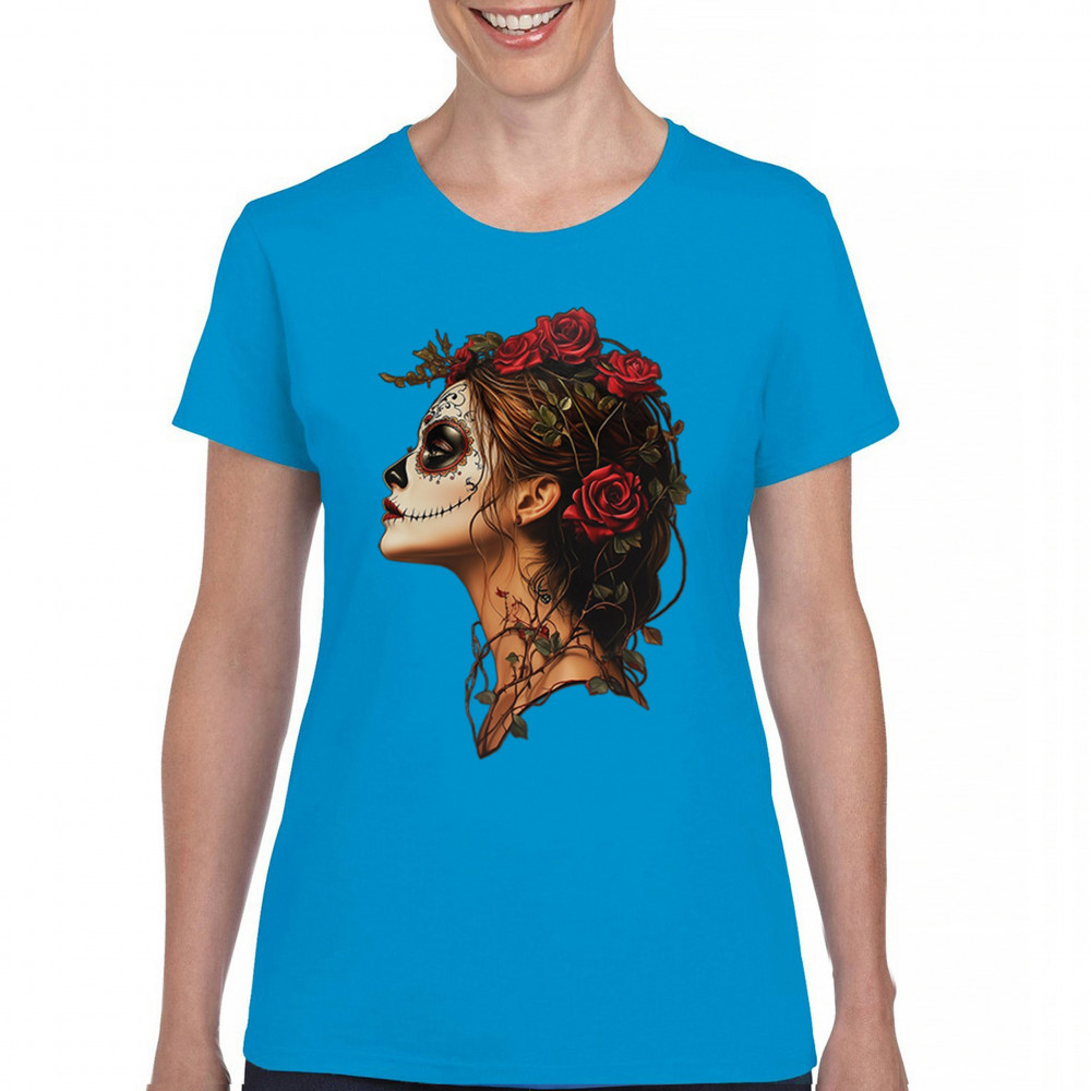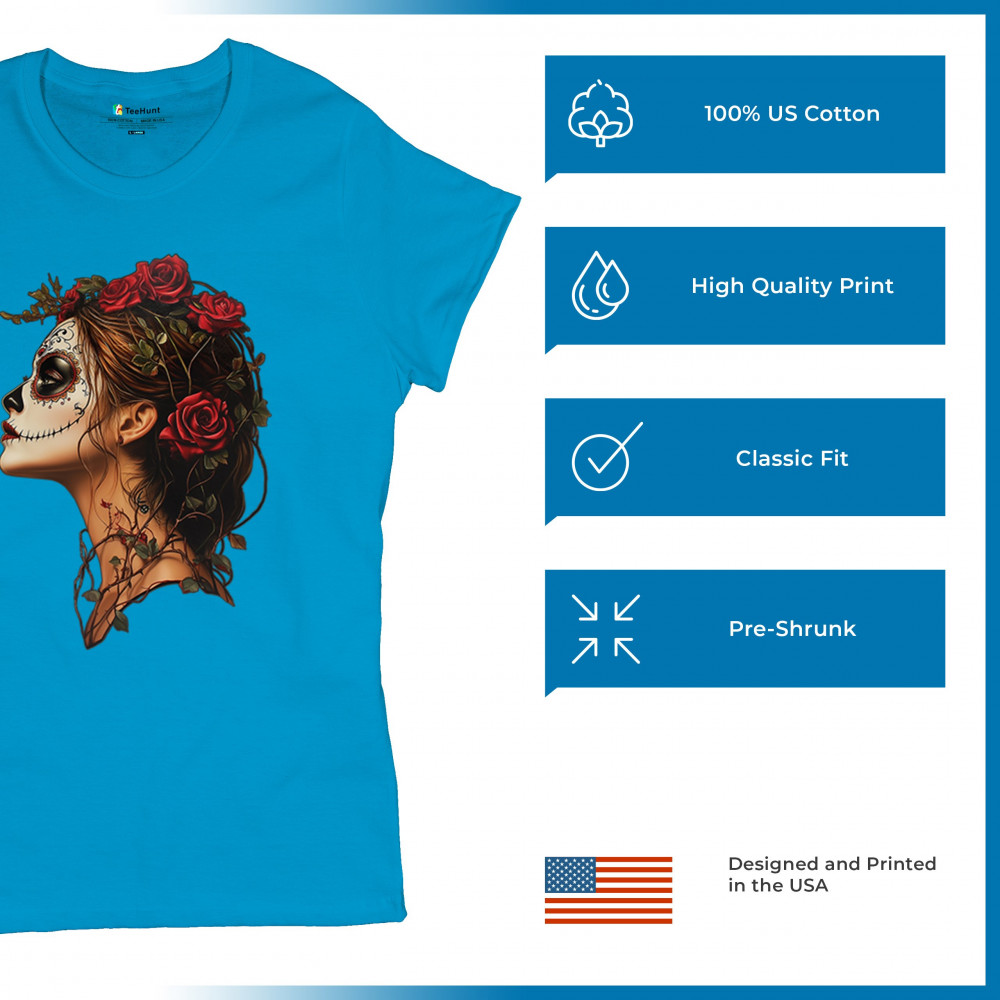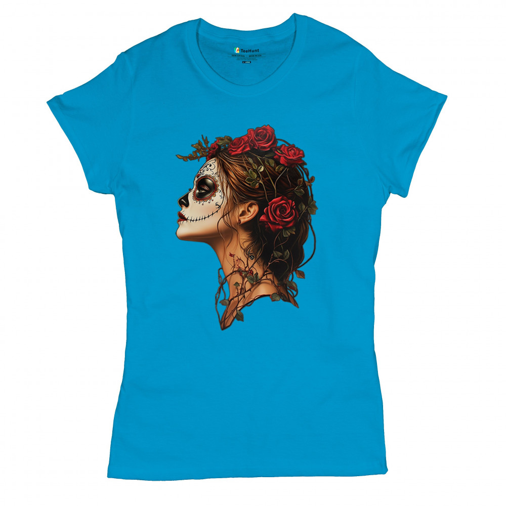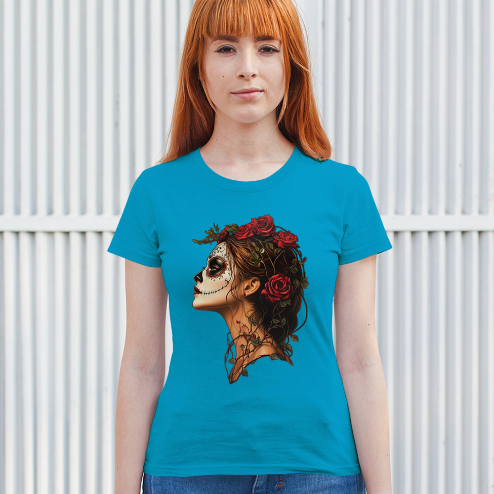 Celebrate feminine power and gothic elegance with this captivating DÃa de los Muertos design. Featuring a woman in profile with sugar skull makeup, blooming red roses, natural vines, dark hair, and symbolic floral skull art, this bold tribute captures beauty, death, and strength in one romantic, detailed visual.