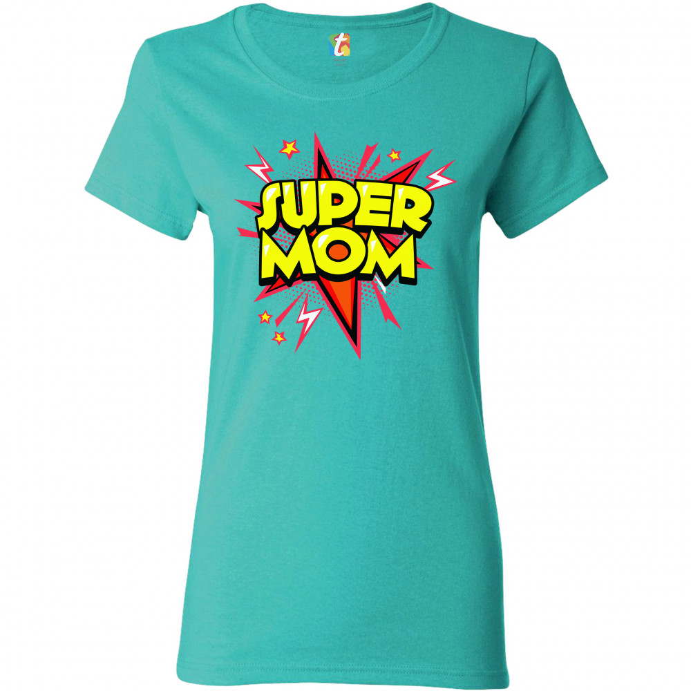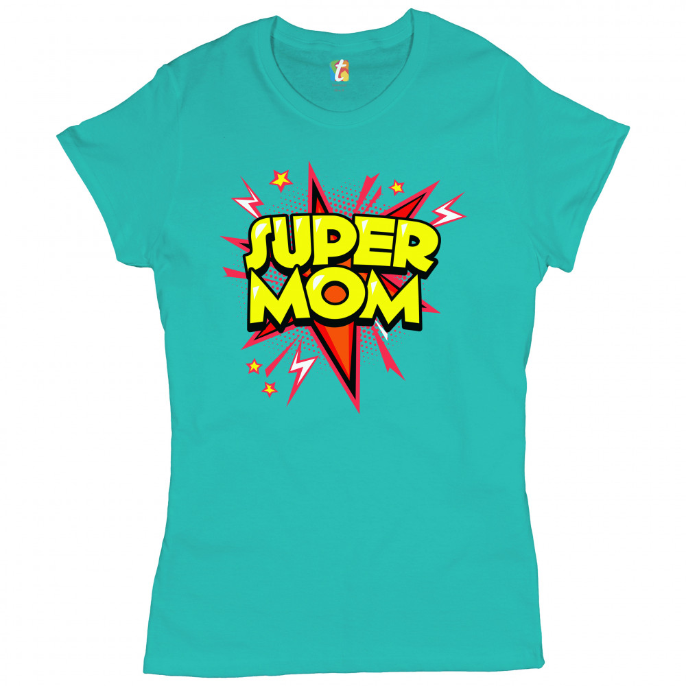 A bright print that says "super mom". Behind the words there is a cartoonish explosion with stars and lightnings flying everywhere. A great choice as a gift on Mother's Day for a loving caring mom.