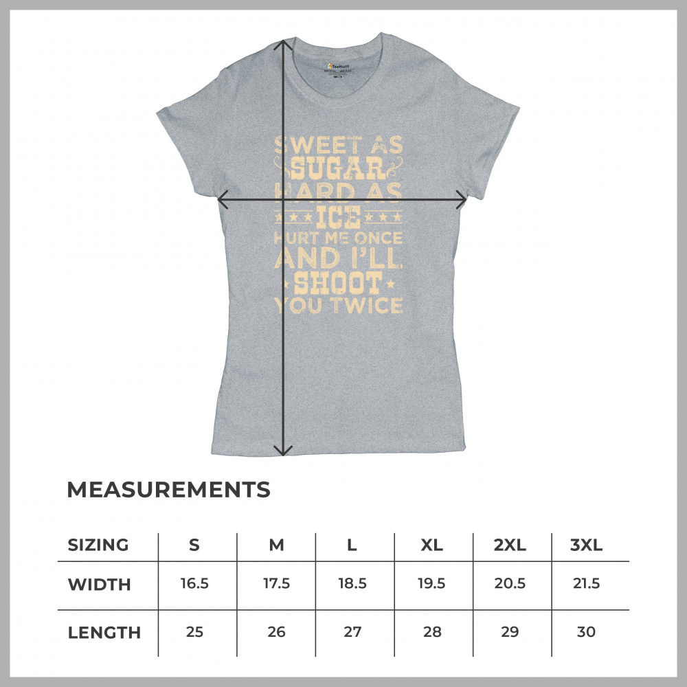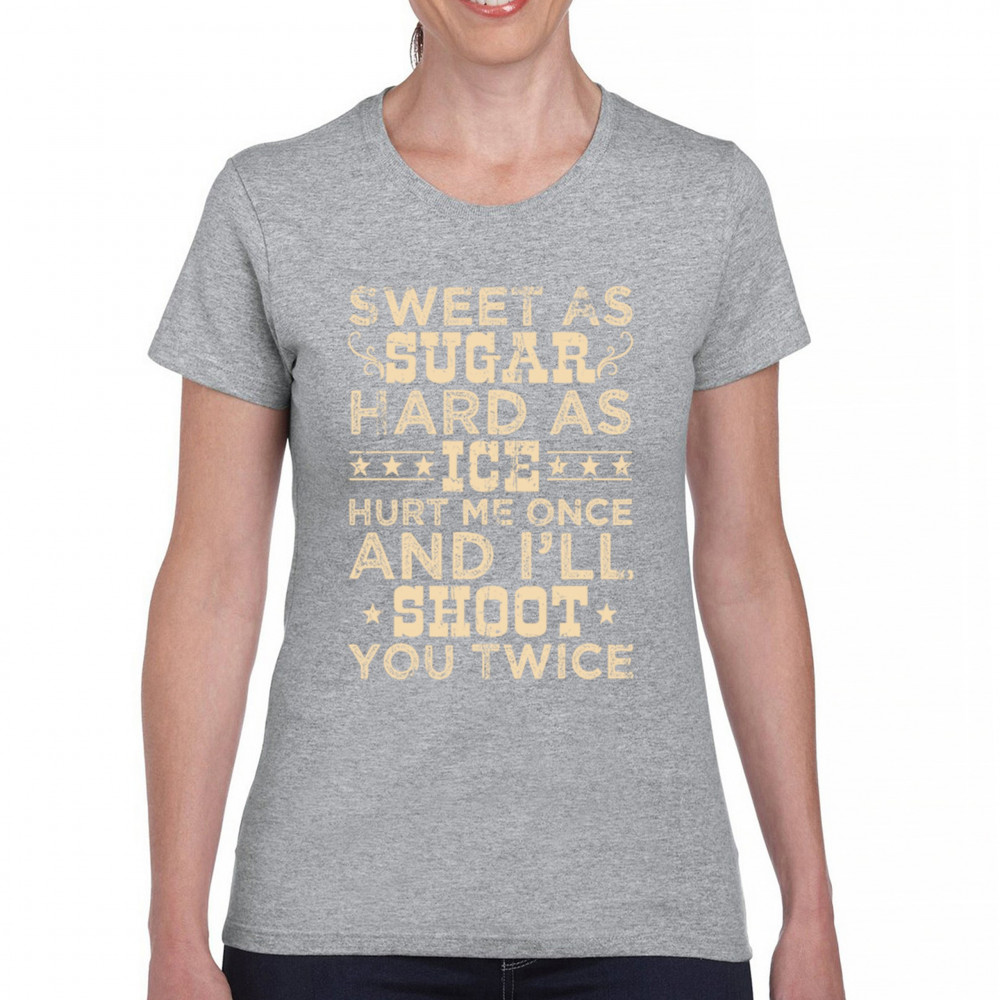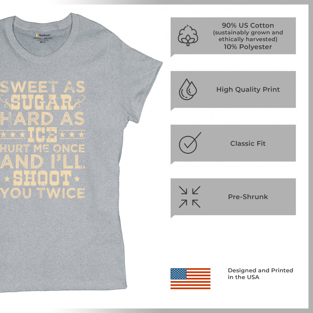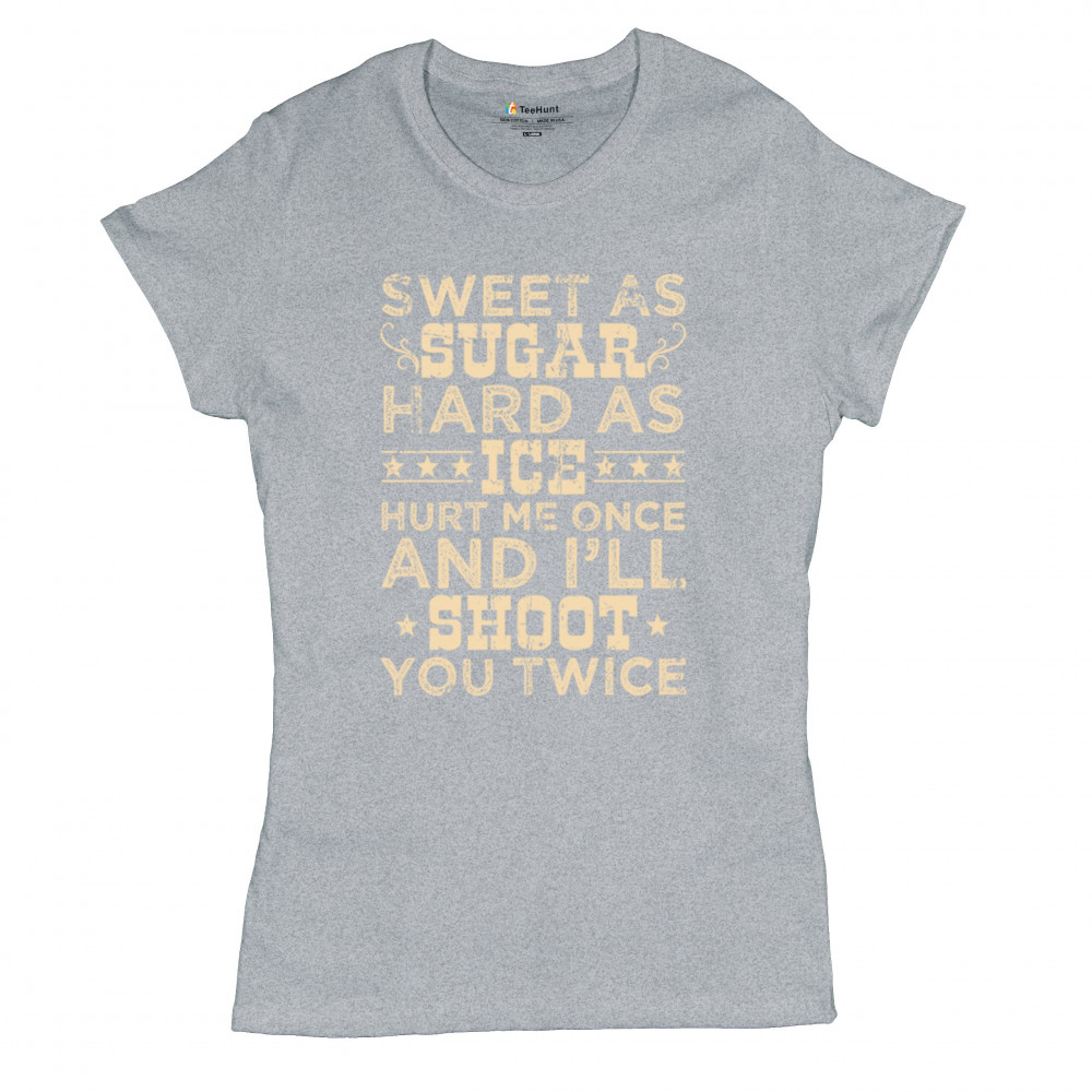 Declare your stance with this bold pro-gun design featuring the quote "Sweet as Sugar, Hard as Ice, Hurt Me Once, I’ll Shoot You Twice." Made for patriots, firearm enthusiasts, military supporters, and defenders of the Constitution. The design blends American pride, 2nd Amendment power, and personal grit in one fierce statement of freedom and justice.