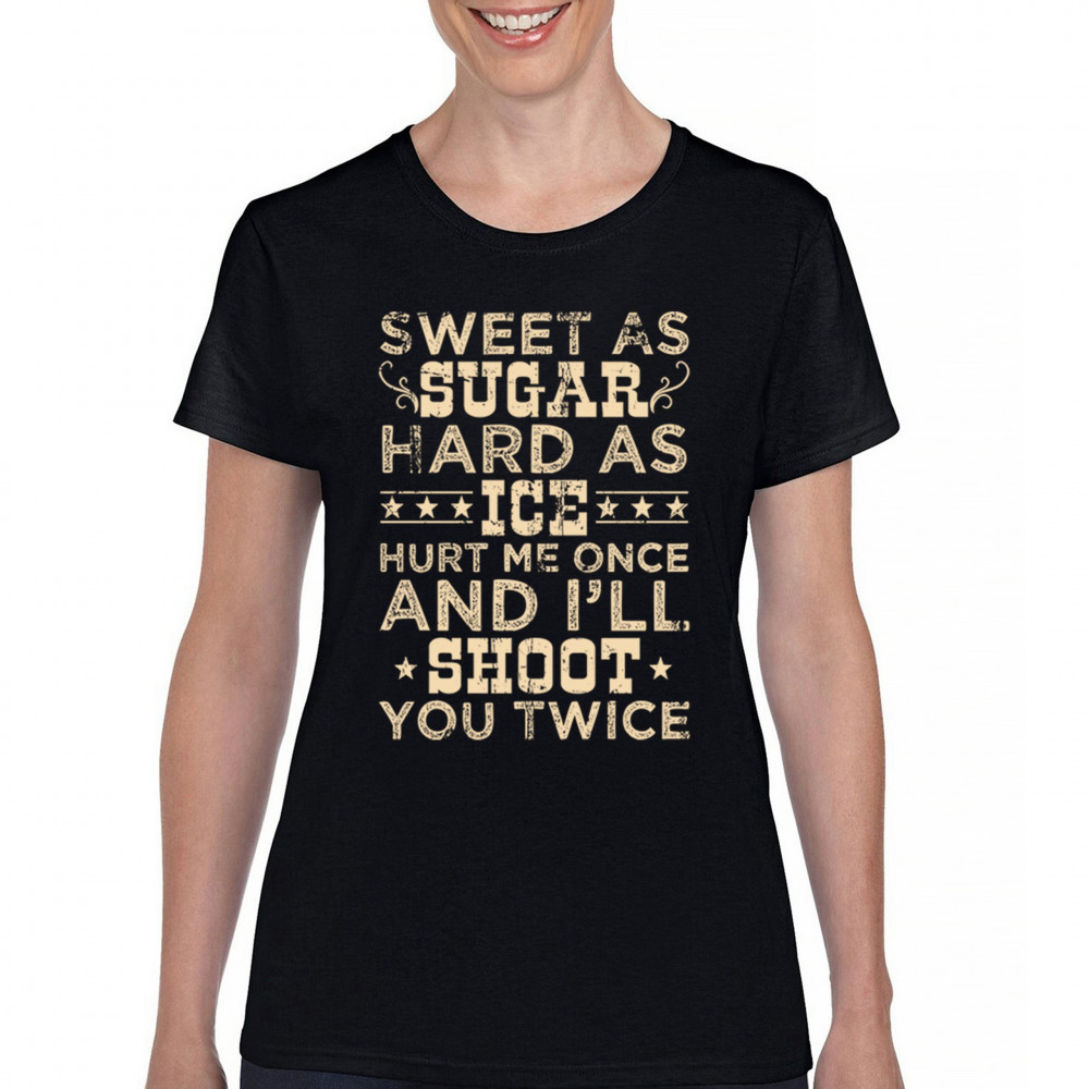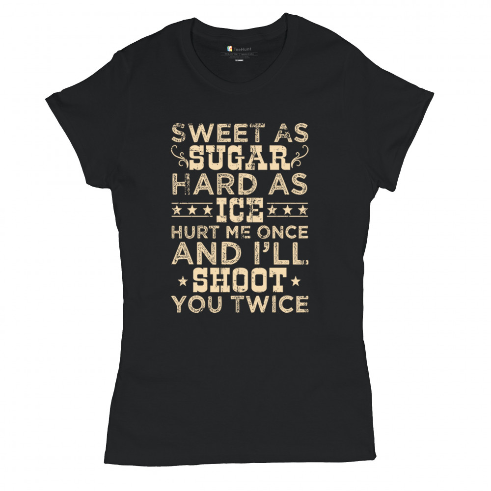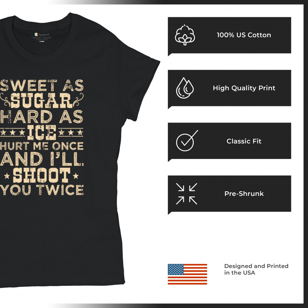 Declare your stance with this bold pro-gun design featuring the quote "Sweet as Sugar, Hard as Ice, Hurt Me Once, I’ll Shoot You Twice." Made for patriots, firearm enthusiasts, military supporters, and defenders of the Constitution. The design blends American pride, 2nd Amendment power, and personal grit in one fierce statement of freedom and justice.