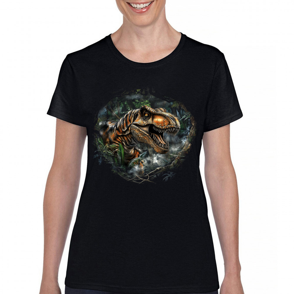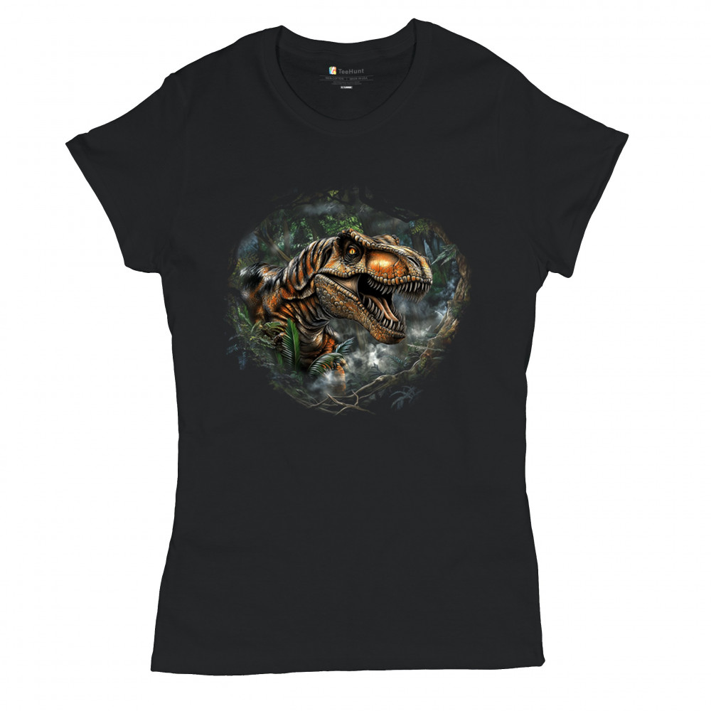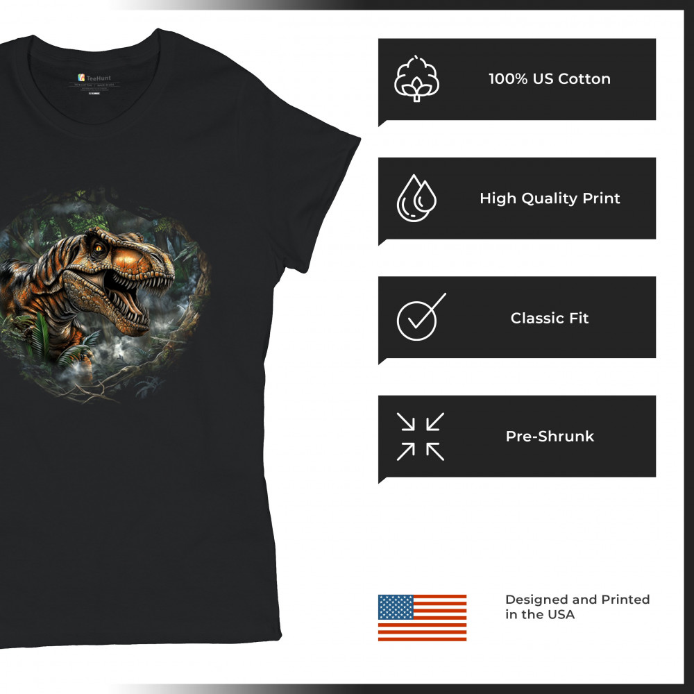 Step into the Jurassic jungle with this electrifying t rex design. With sharp teeth, rugged scales, and mist swirling through lush greenery, this tyrannosaurus roars to life. Perfect for dinosaur fans, fossil lovers, and nature explorers. Wear it to museums, theme parks, or wherever ancient beasts still rule the imagination.