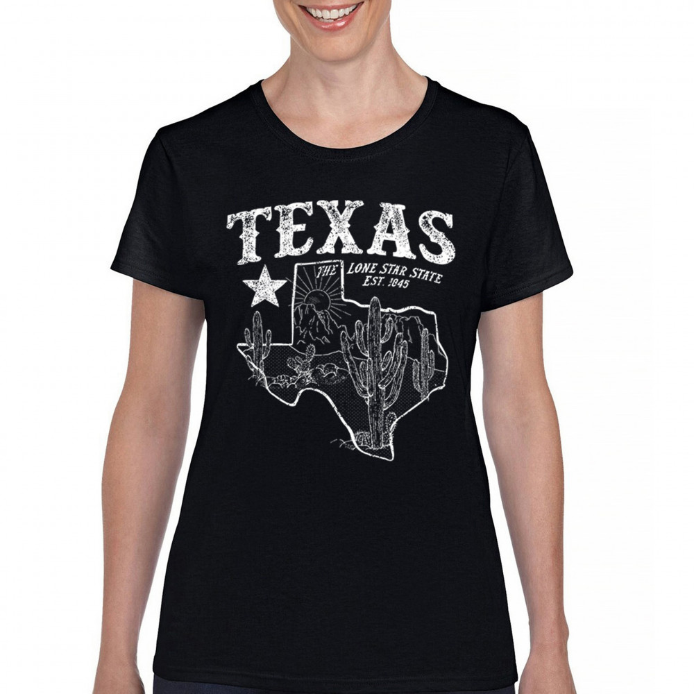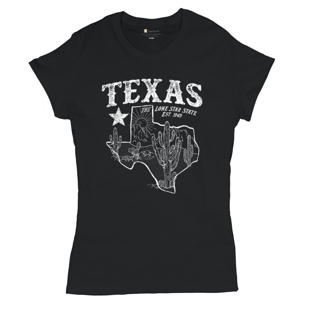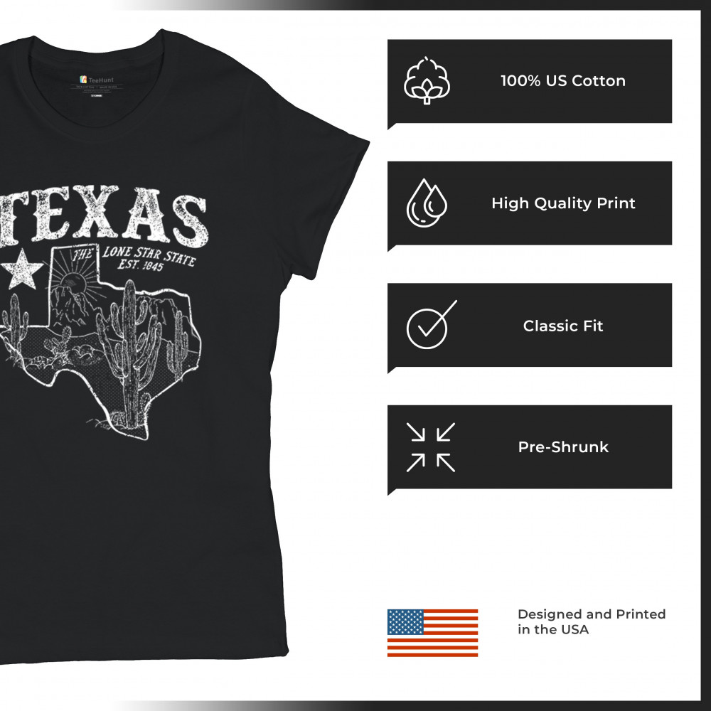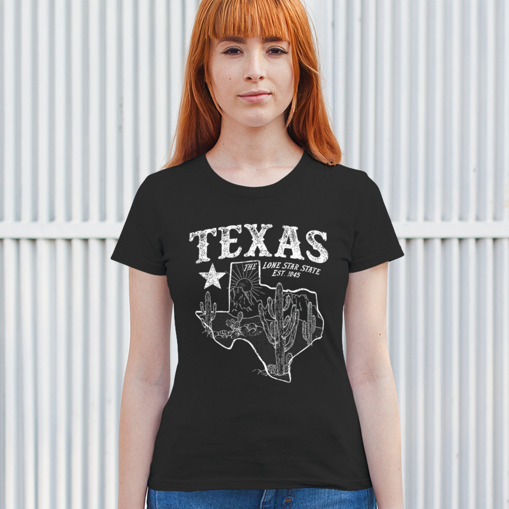 Vintage Texas pride design with cactus, mountains, Lone Star symbol, and 1845 tribute—perfect for rodeos and western events.