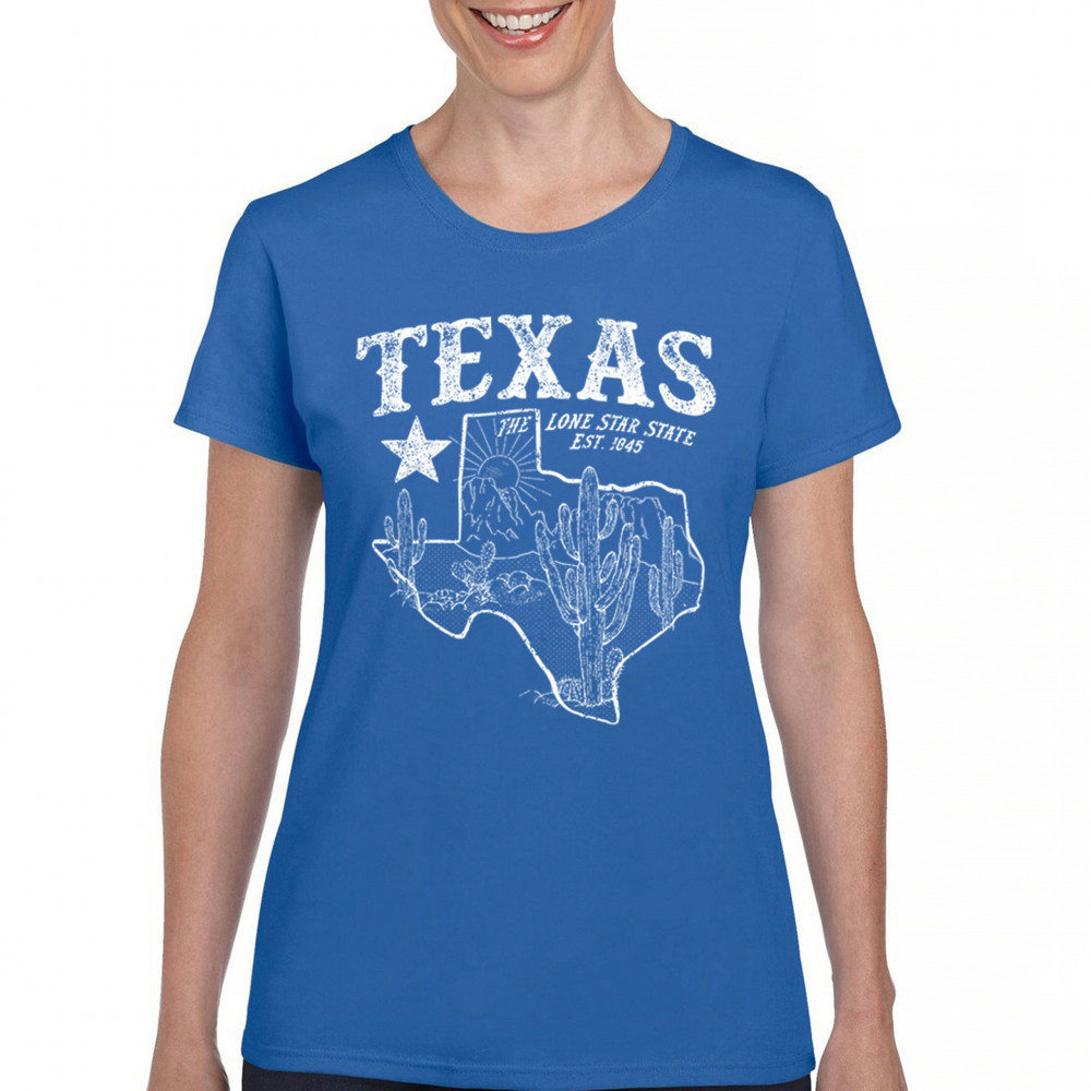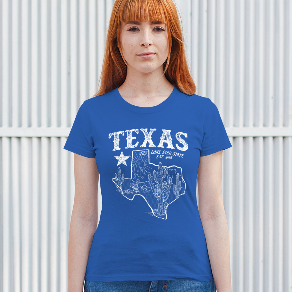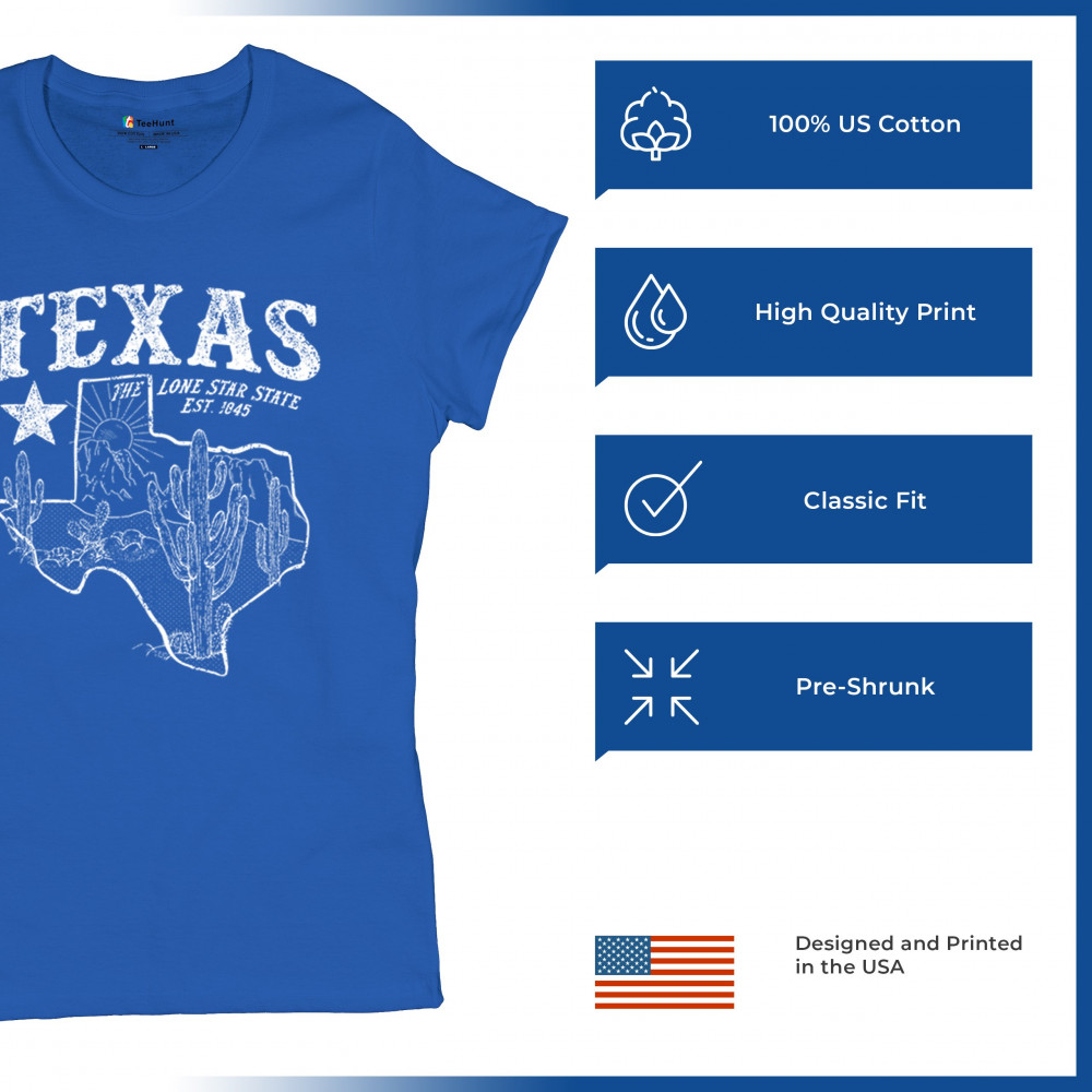 Vintage Texas pride design with cactus, mountains, Lone Star symbol, and 1845 tribute—perfect for rodeos and western events.