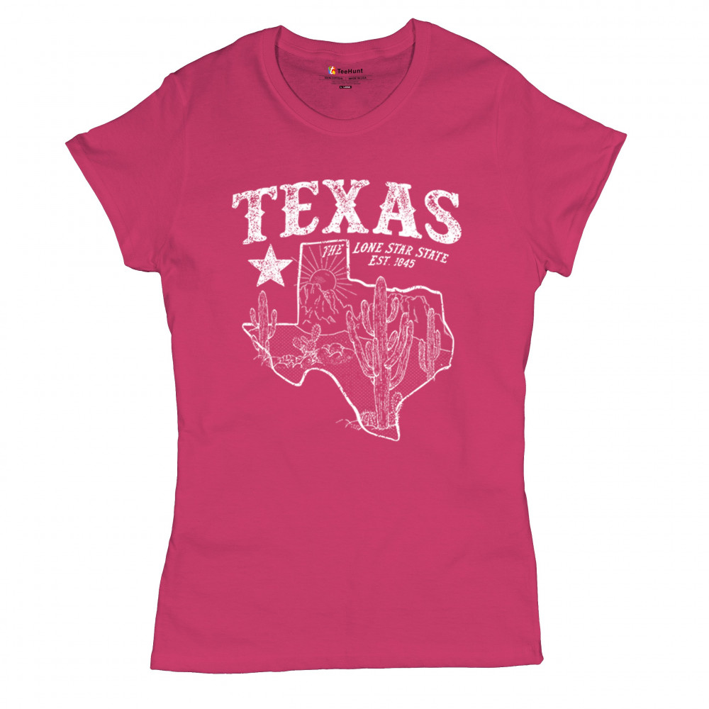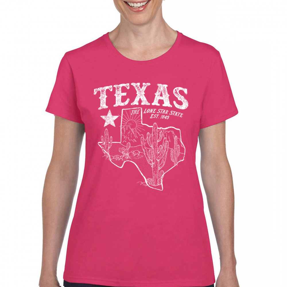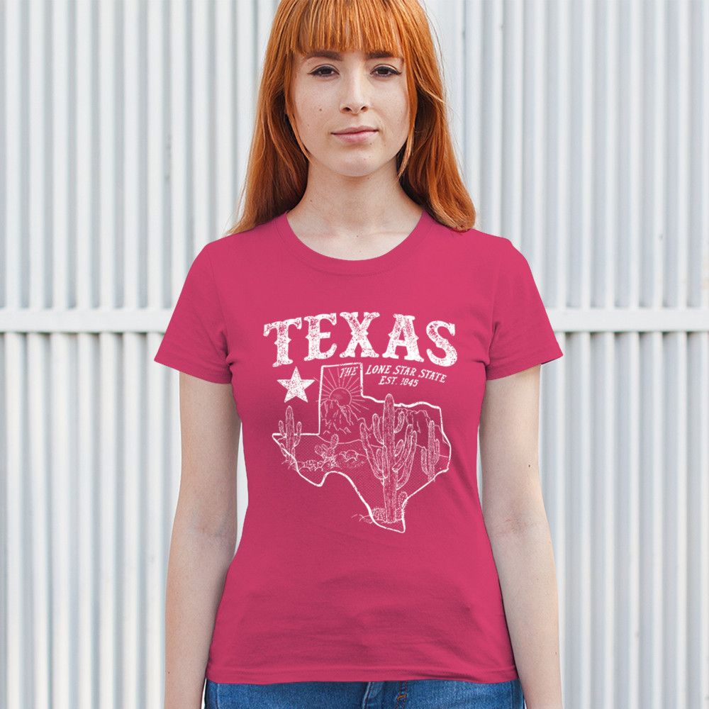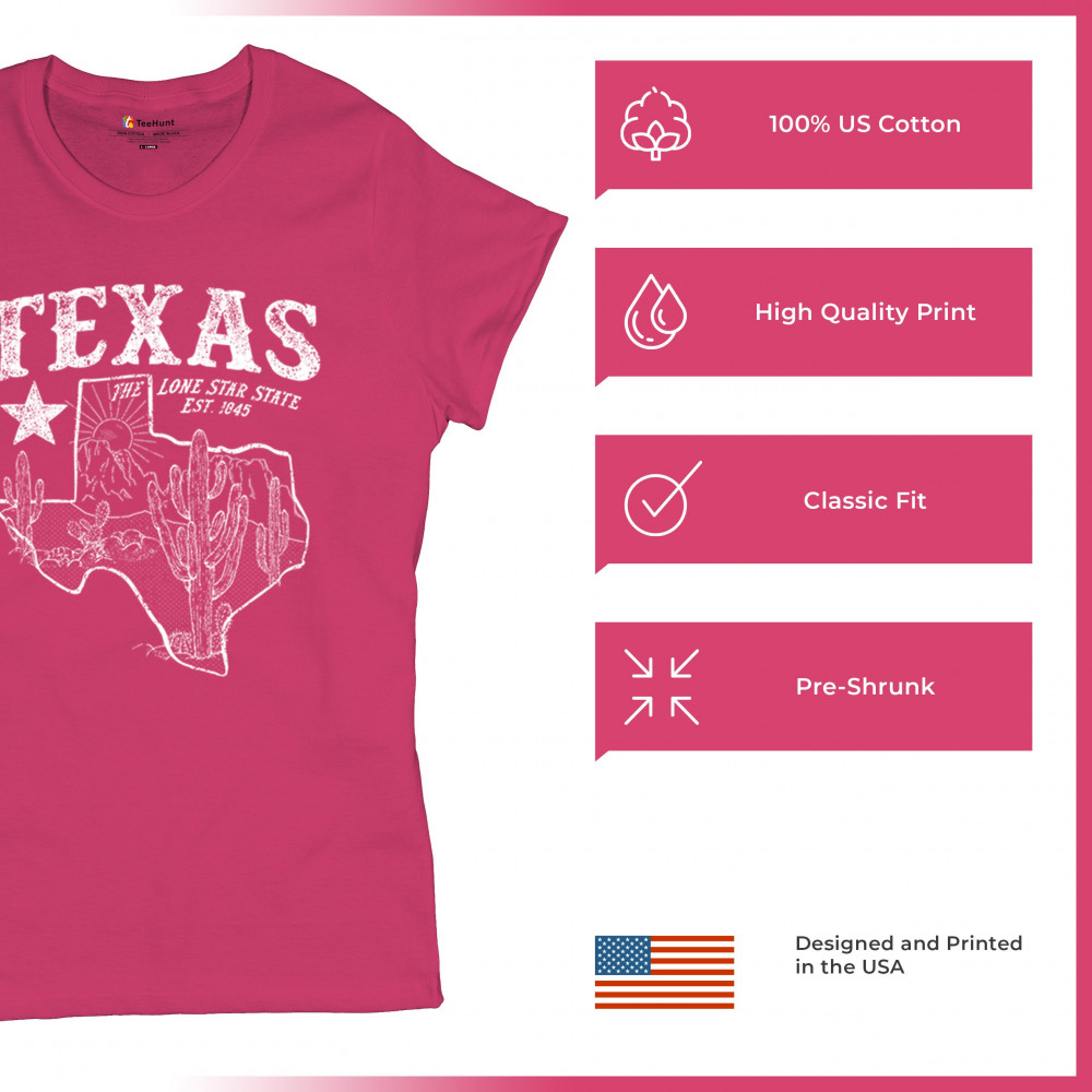 Vintage Texas pride design with cactus, mountains, Lone Star symbol, and 1845 tribute—perfect for rodeos and western events.