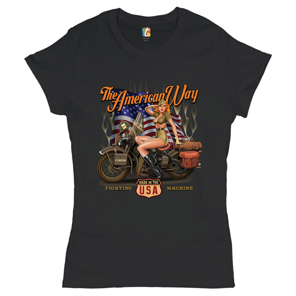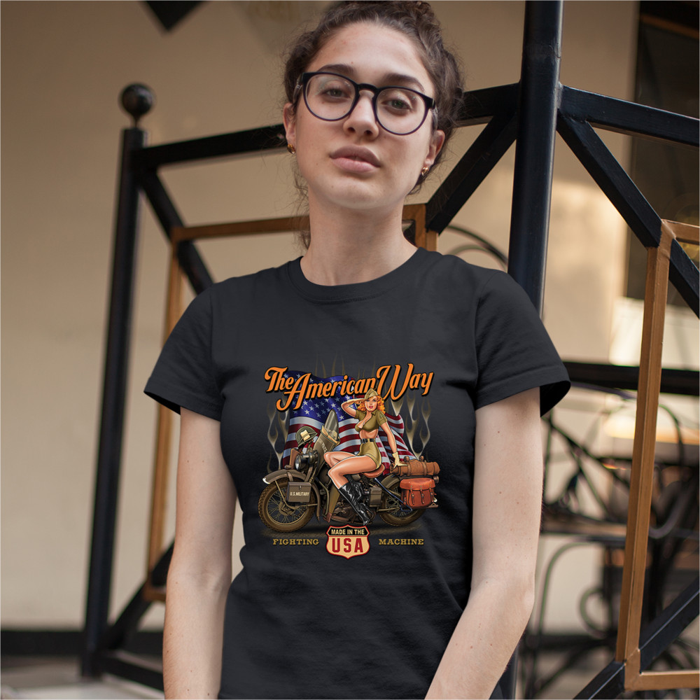 A print featuring a beautiful pin-up girl in leather boots sitting on a U.S. military motorcycle. There is the American Flag in the background and the words "The American Way" above it. At the bottom of the picture there is a shield which says: "made in the USA". "Fighting Machine" is written under the motorcycle's wheels. A great choice for a motorcycle enthusiast.