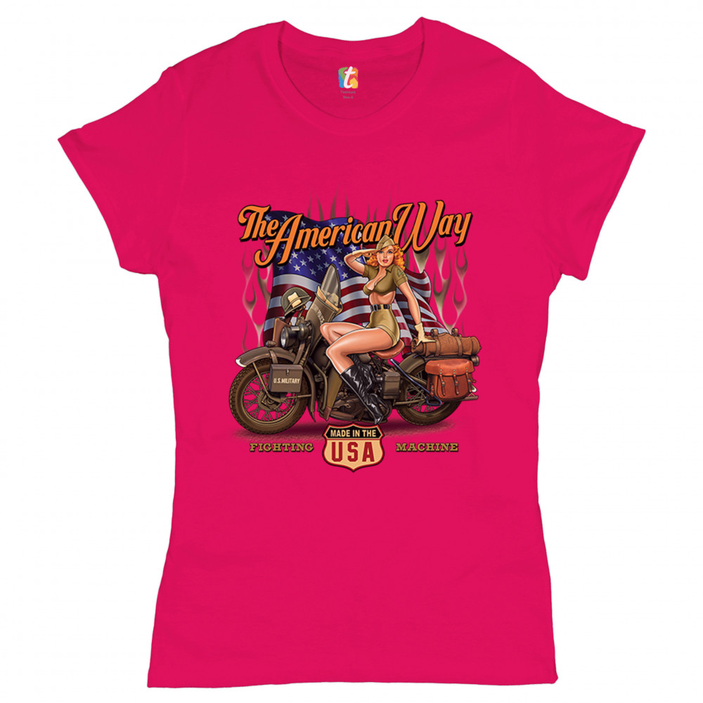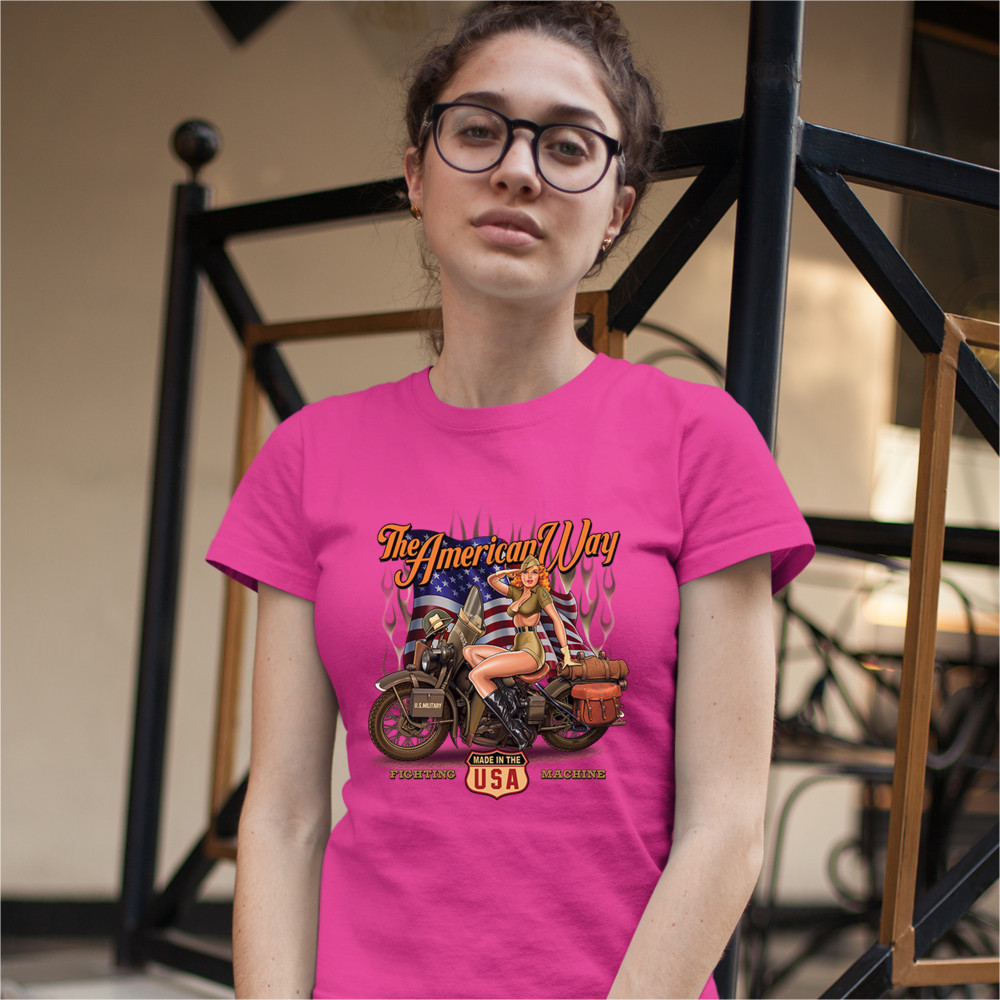 A print featuring a beautiful pin-up girl in leather boots sitting on a U.S. military motorcycle. There is the American Flag in the background and the words "The American Way" above it. At the bottom of the picture there is a shield which says: "made in the USA". "Fighting Machine" is written under the motorcycle's wheels. A great choice for a motorcycle enthusiast.