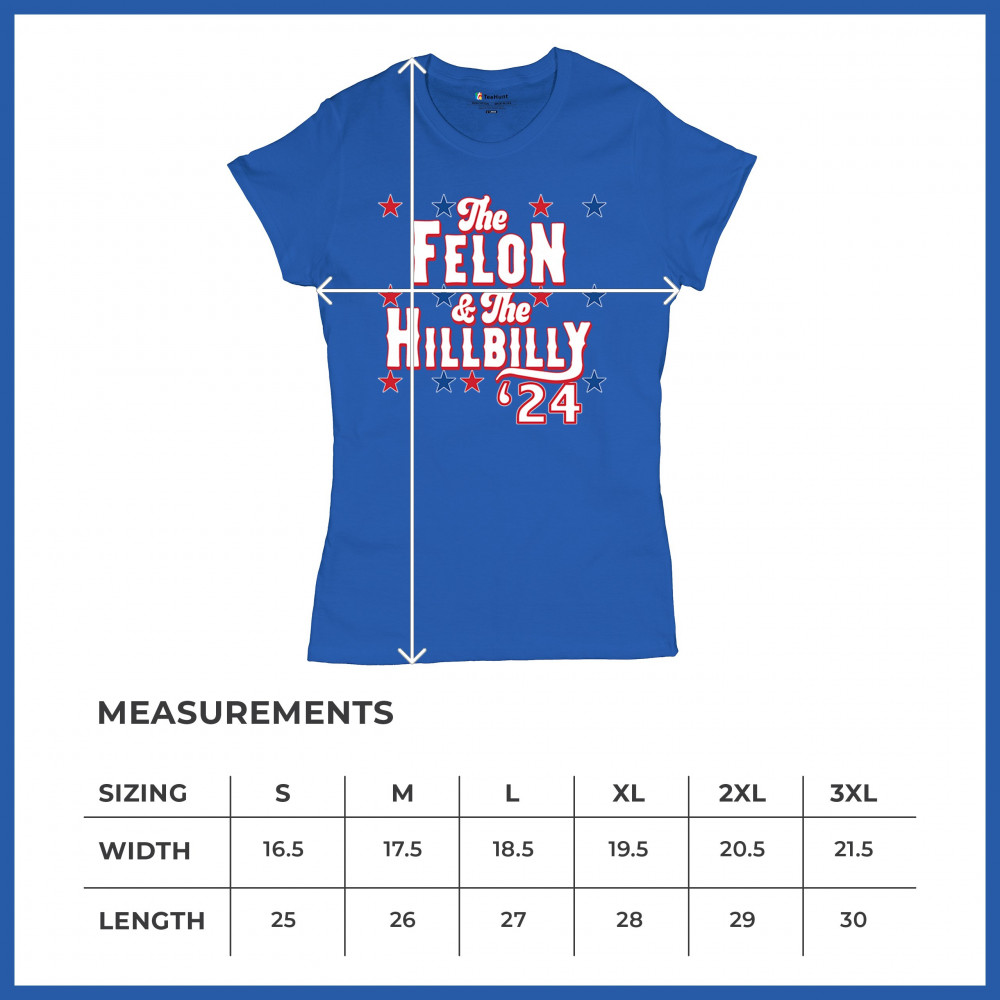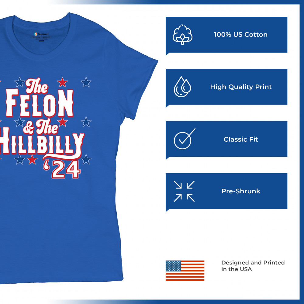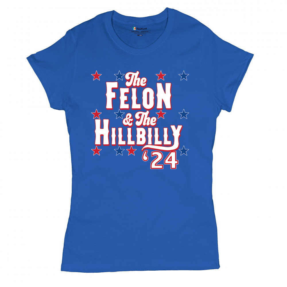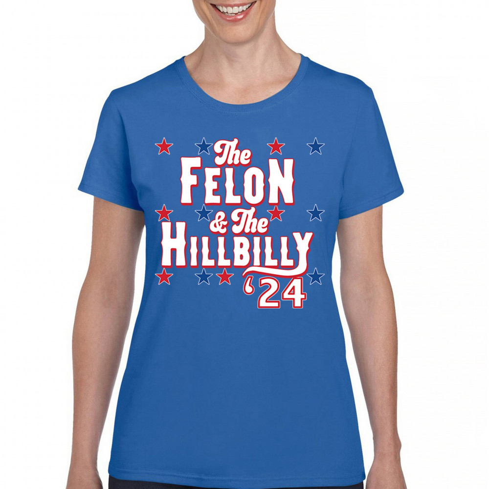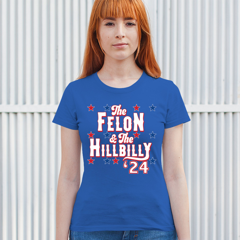 Humorous pro-Trump and Vance design for the 2024 election. "The Felon & The Hillbilly '24" captures conservative pride and humor in one bold statement.