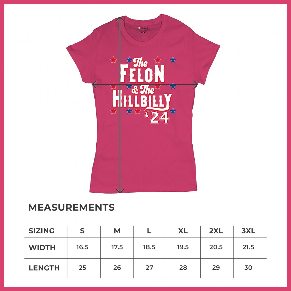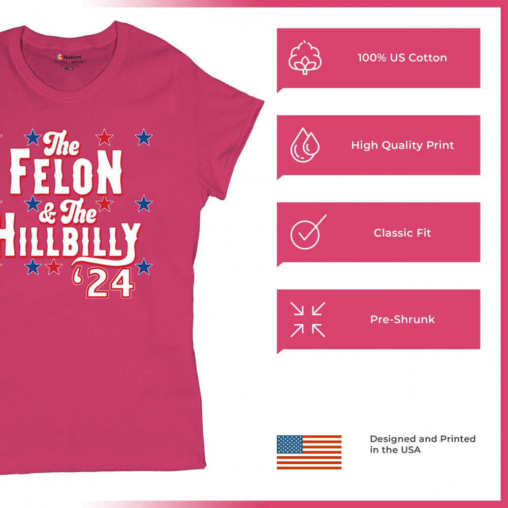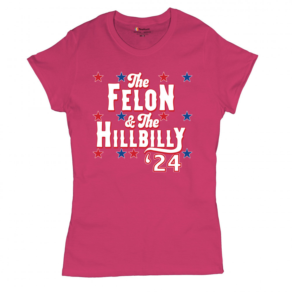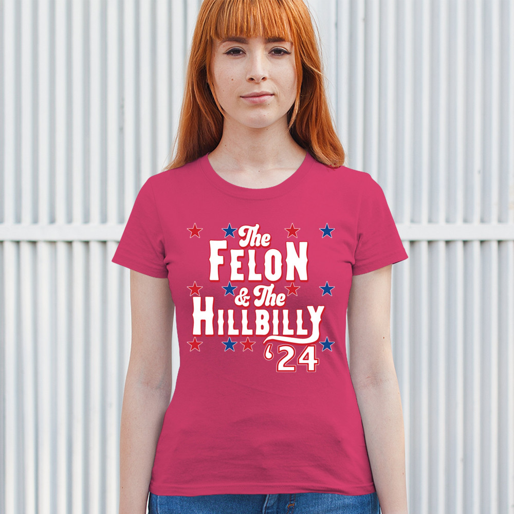 Humorous pro-Trump and Vance design for the 2024 election. "The Felon & The Hillbilly '24" captures conservative pride and humor in one bold statement.
