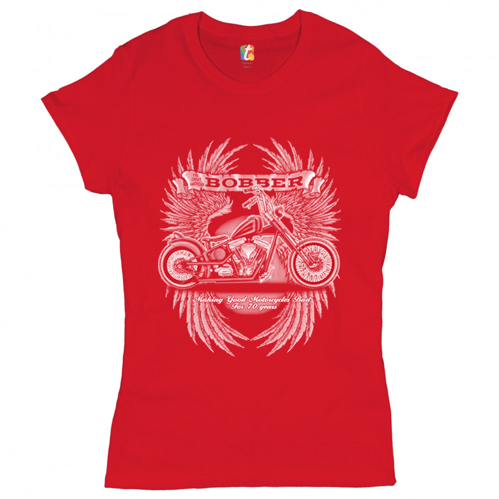 A print featuring a bobber motorcycle and a pair of wings in the background. At the top there is a stripe with "The great American bobber" written on it. At the bottom the print says: "making good motorcycles bad for 70 years". A great choice for a motorc