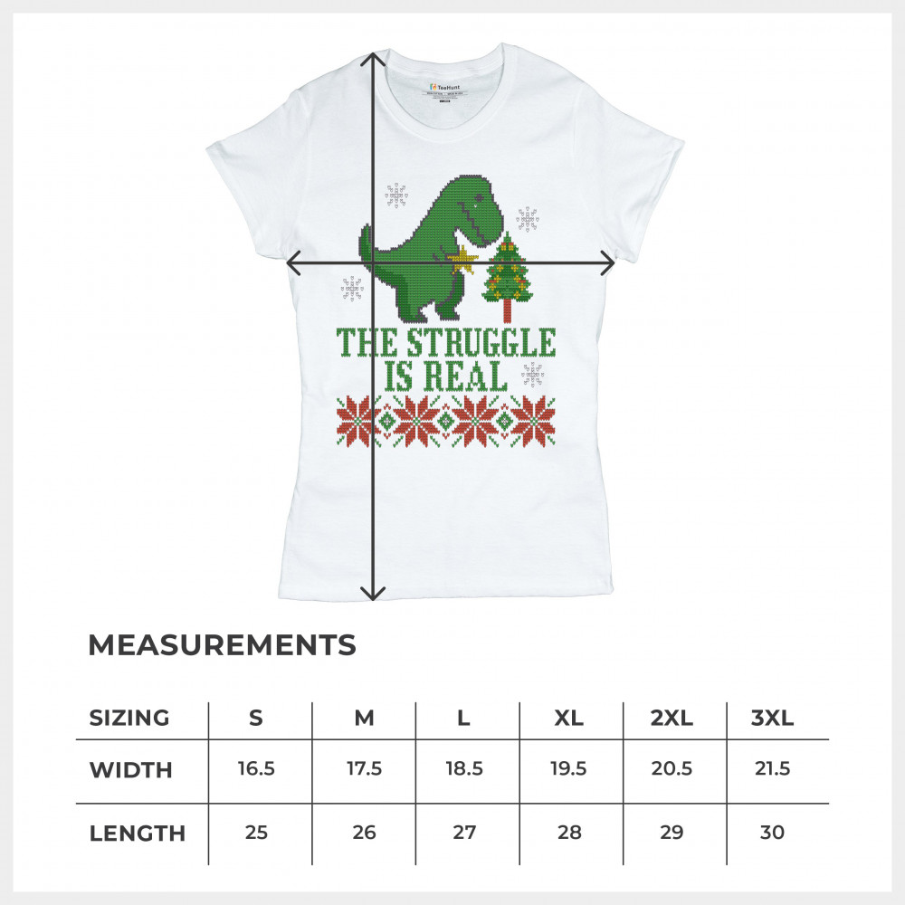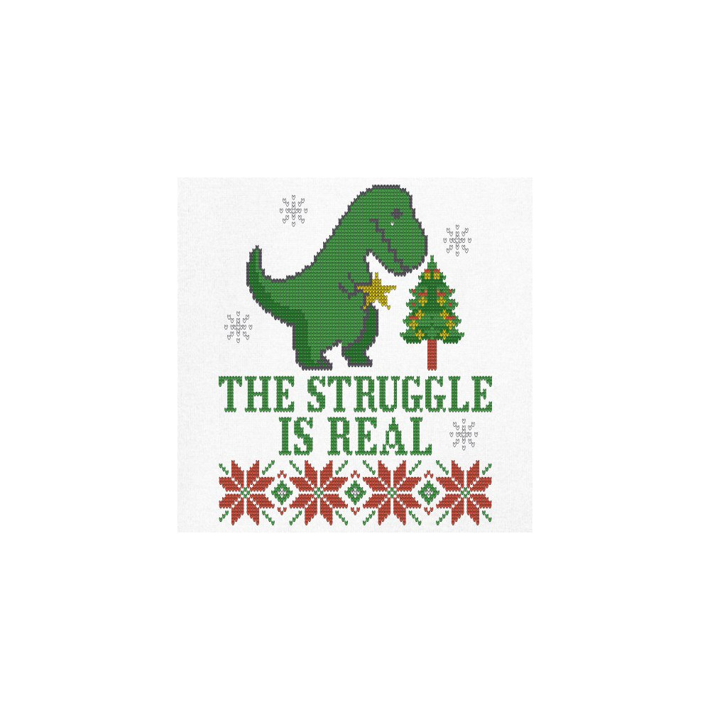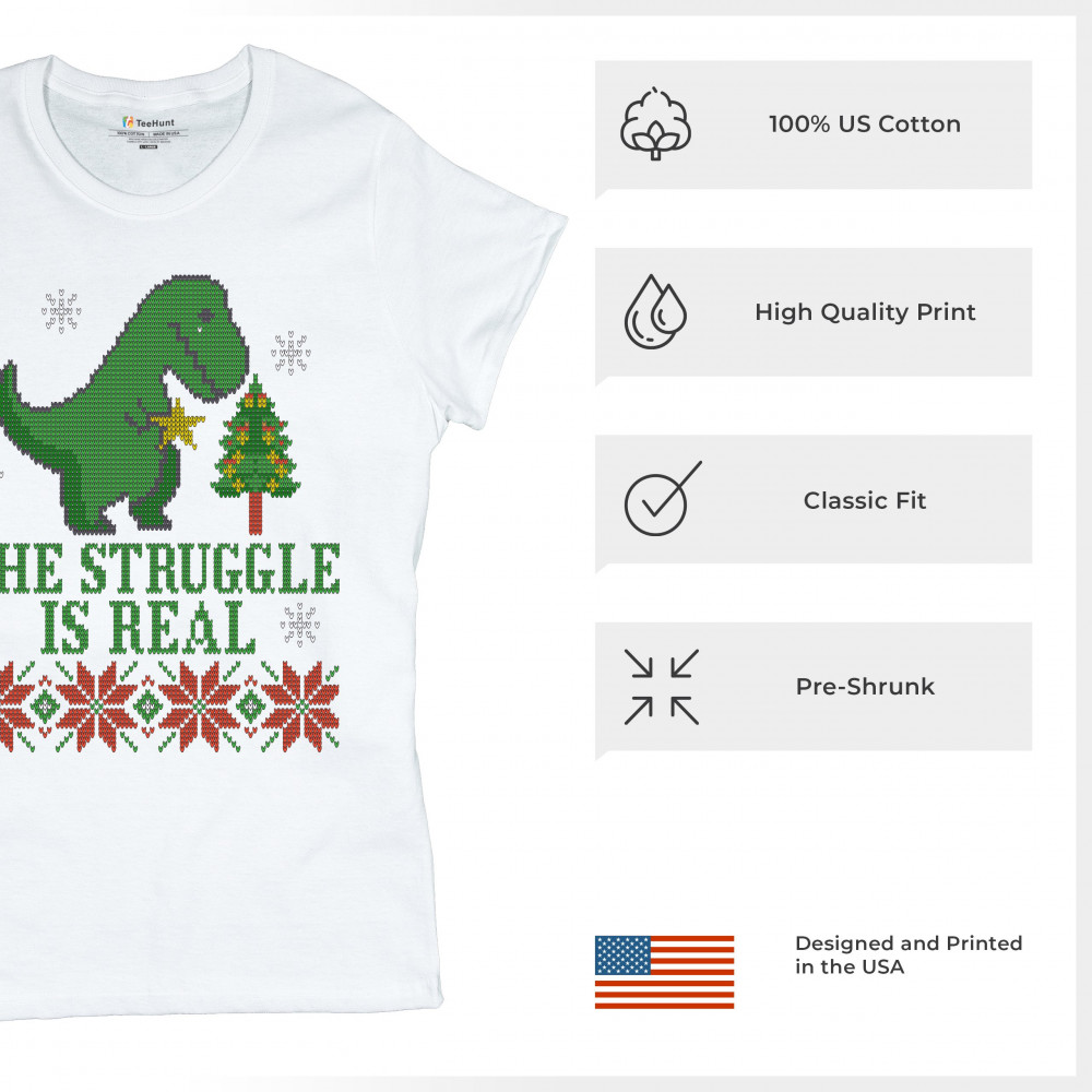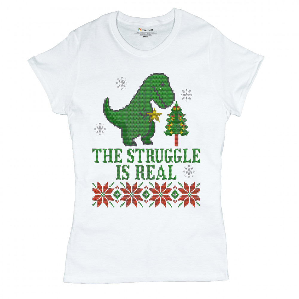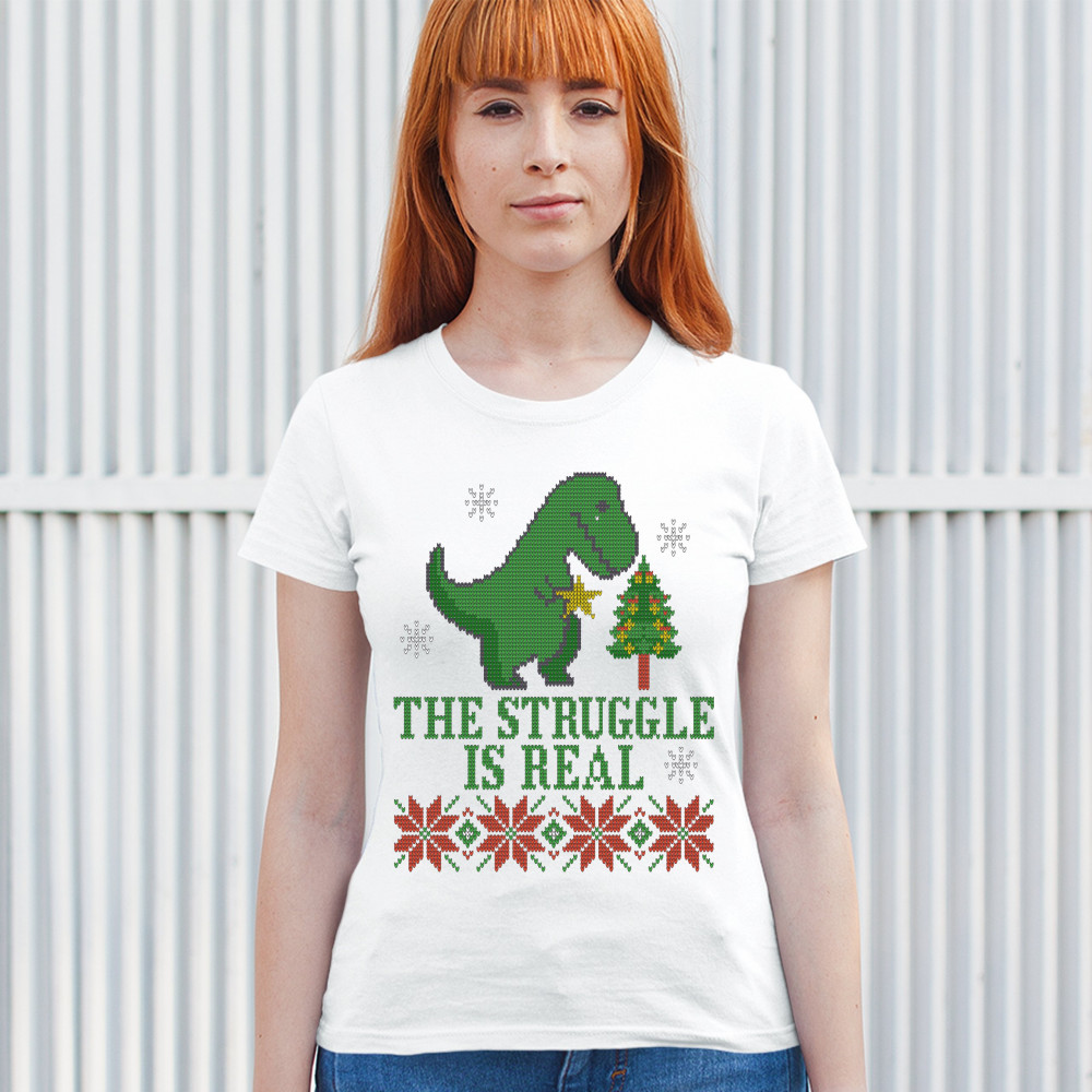 A funny print saying: "The Struggle Is Real" and featuring a sad tyrannosaurus rex holding a toy star in it's short hands standing by a Christmas tree. The print is decorated as an ugly sweater. Amazing choice to make people smile and spread positive vibe