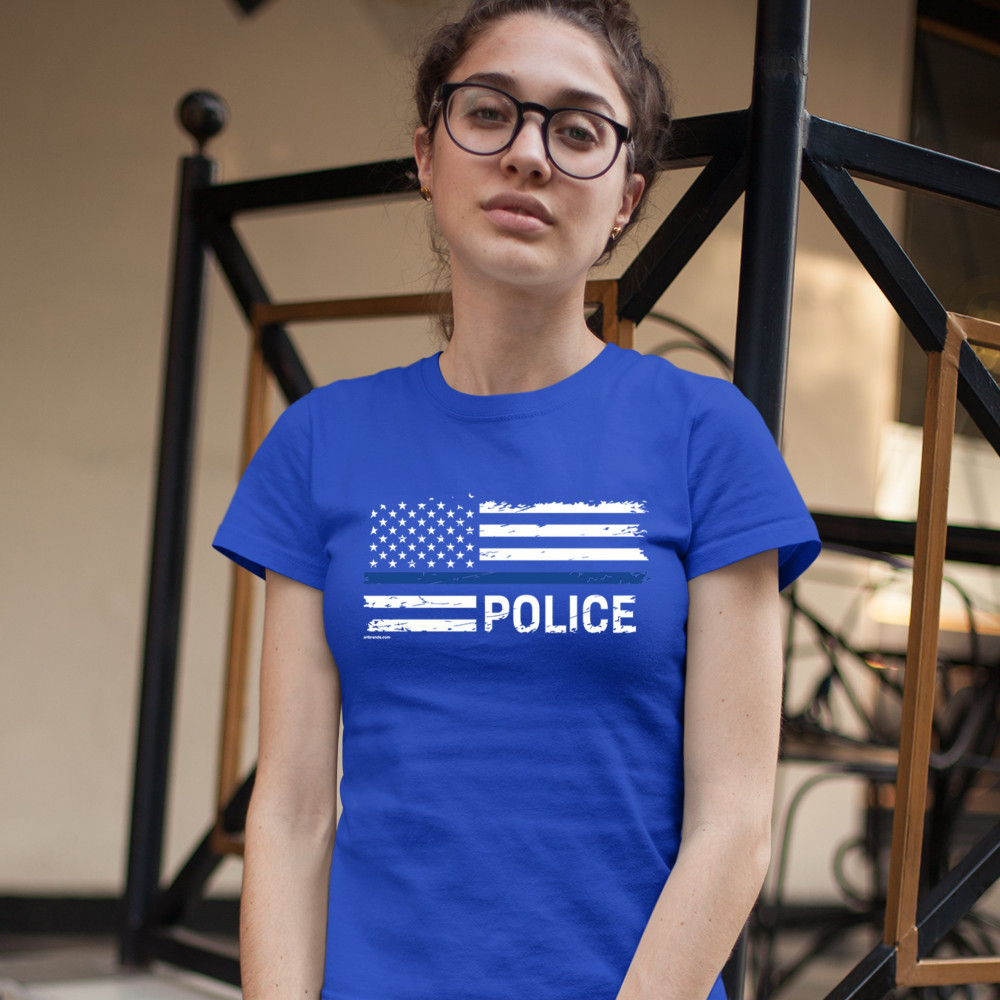 THIN BLUE LINE AMERICAN FLAG t-shirt police law enforcement women's tee royal blue