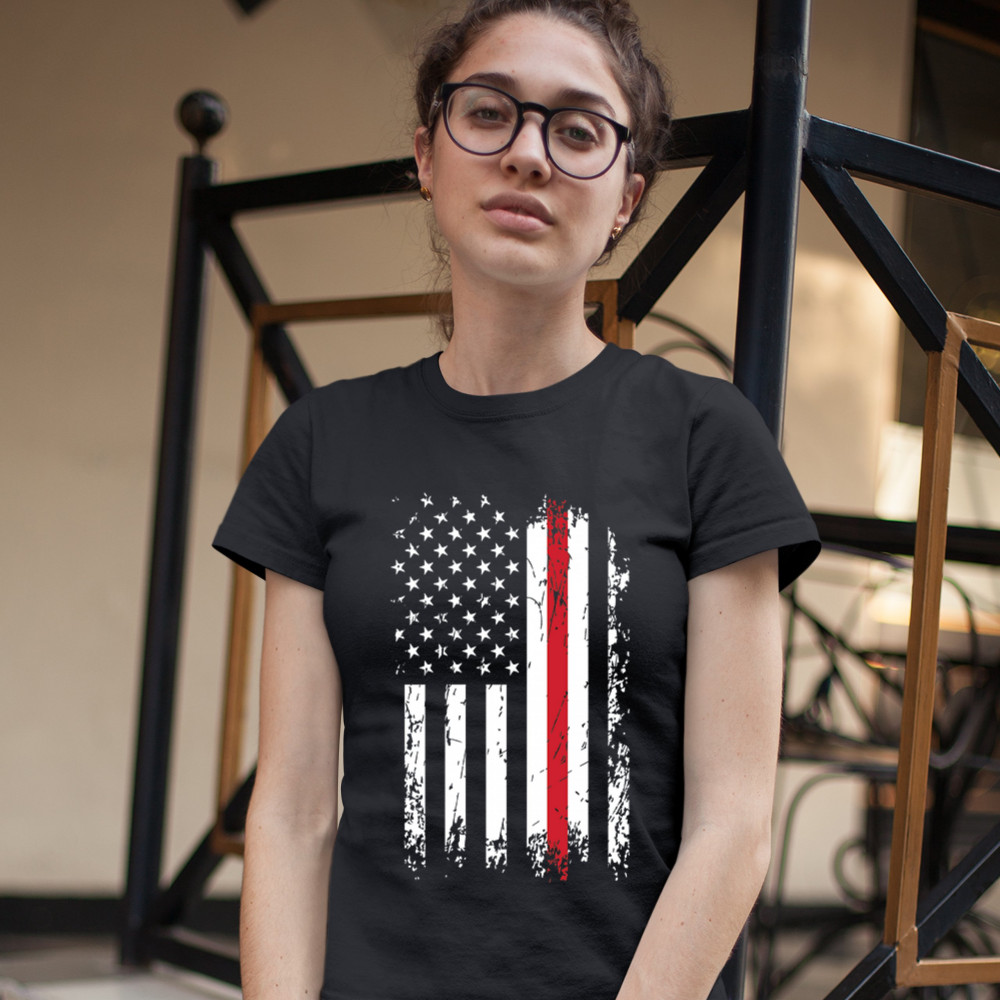 THIN RED LINE t-shirt american flag firefighter fire department women's tee black