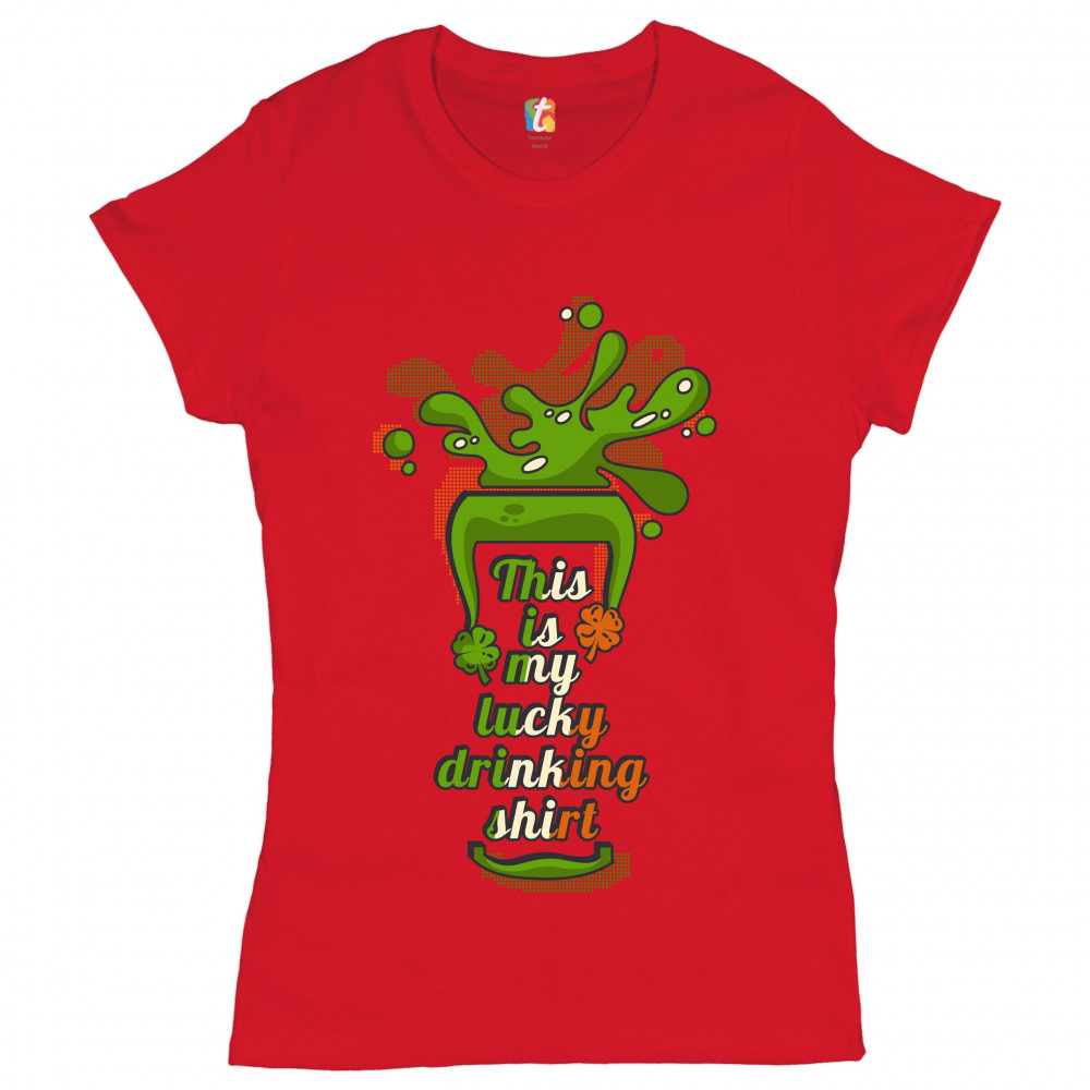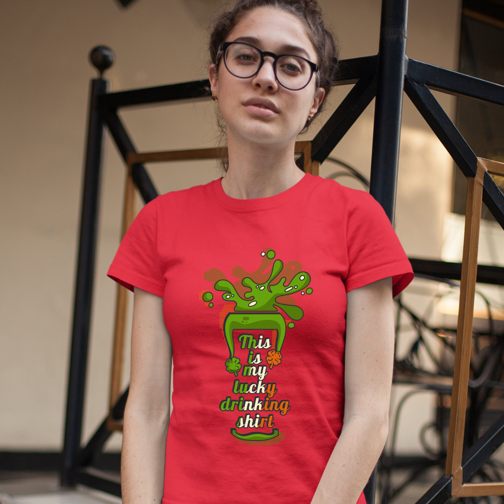 A print featuring a silhouette of a glass with beer spilling out of it. Inside the glass there is a text: "This is my lucky drinking shirt" in the colors of the flag of Ireland. A great choice to wear on March 17 to celebrate the St. Patrick's Day and sho