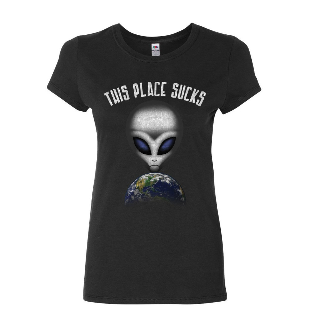 THIS PLACE SUCKS women's t-shirt funny ufo alien space universe earth shirt black