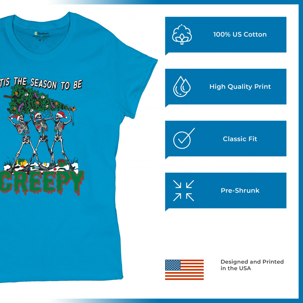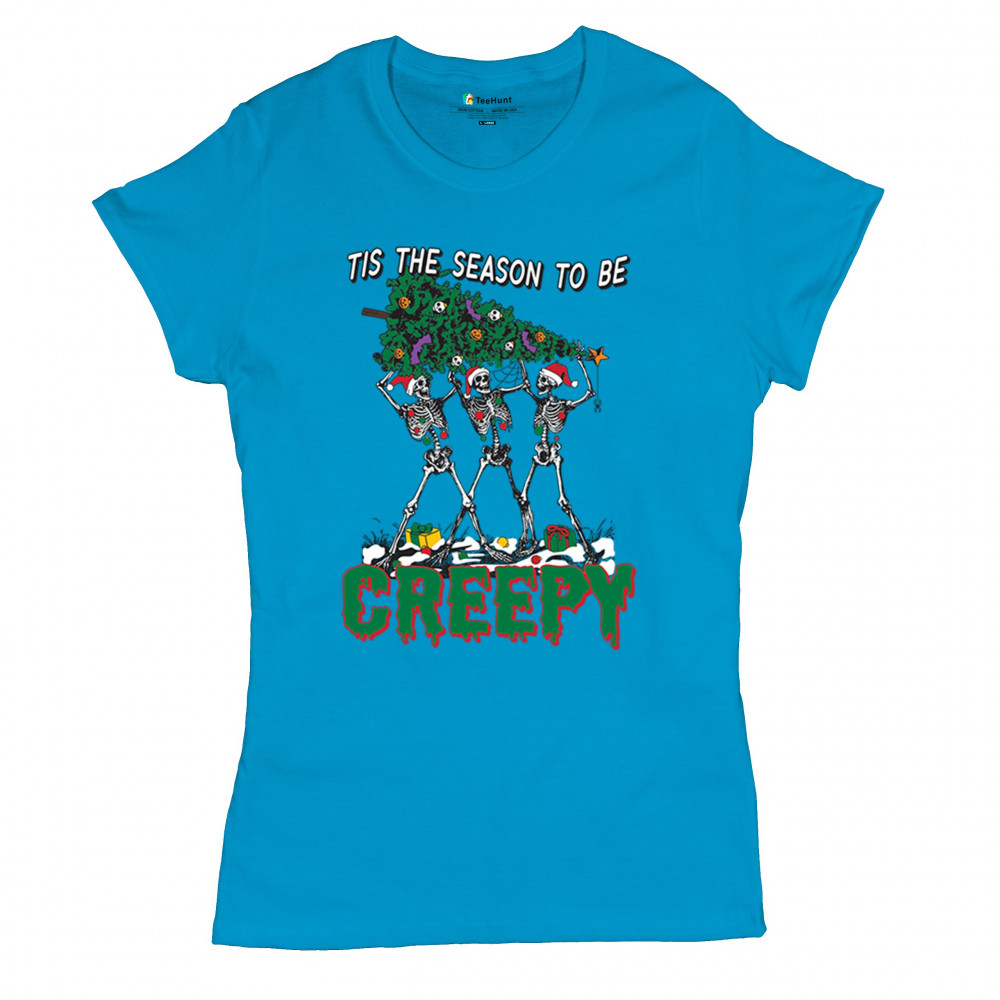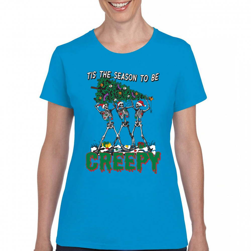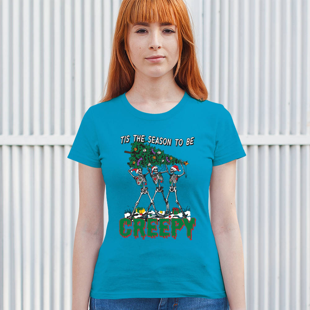 "Tis the Season to Be Creepy" combines holiday cheer with a hauntingly fun twist. This creative design features skeletons donning Santa hats as they carry a spooky Christmas tree decorated with eerie ornaments. Perfect for holiday gatherings, Secret Santa gifts, or themed parties, this design celebrates the festive and the macabre. Embrace the jolliest and creepiest bunch this season with this standout apparel.