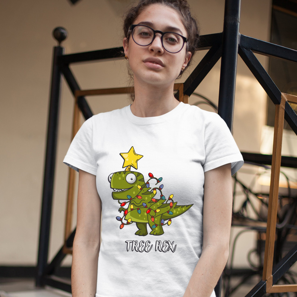A print saying: "tree rex". The print features an adorable Tyrannosaurus Rex tangled in Christmas lights and having a star topper on it's head. Amazing choice to make people smile and spread positive vibes on Christmas Eve.
