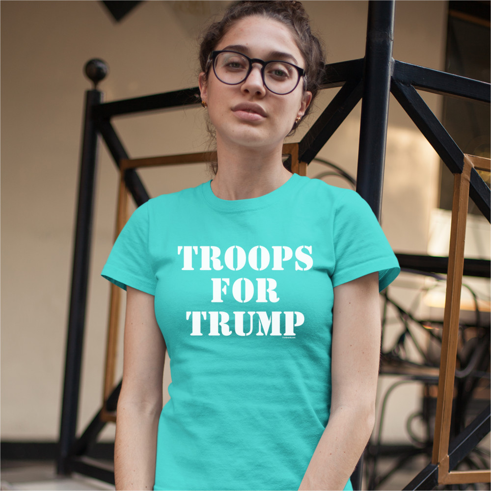 A political print saying "troops for Trump". A great choice to wear for a Trump rally or give as a gift to a Donald Trump and Mike Pence supporter before 2020 presidential elections.