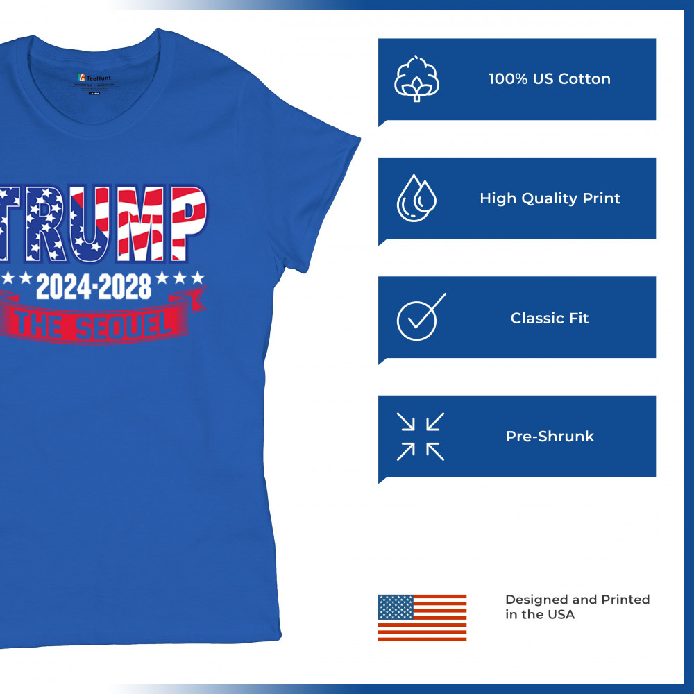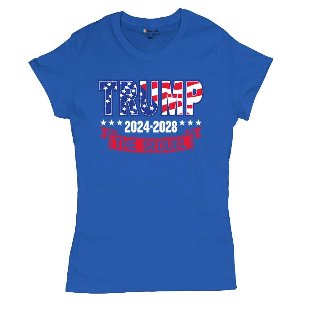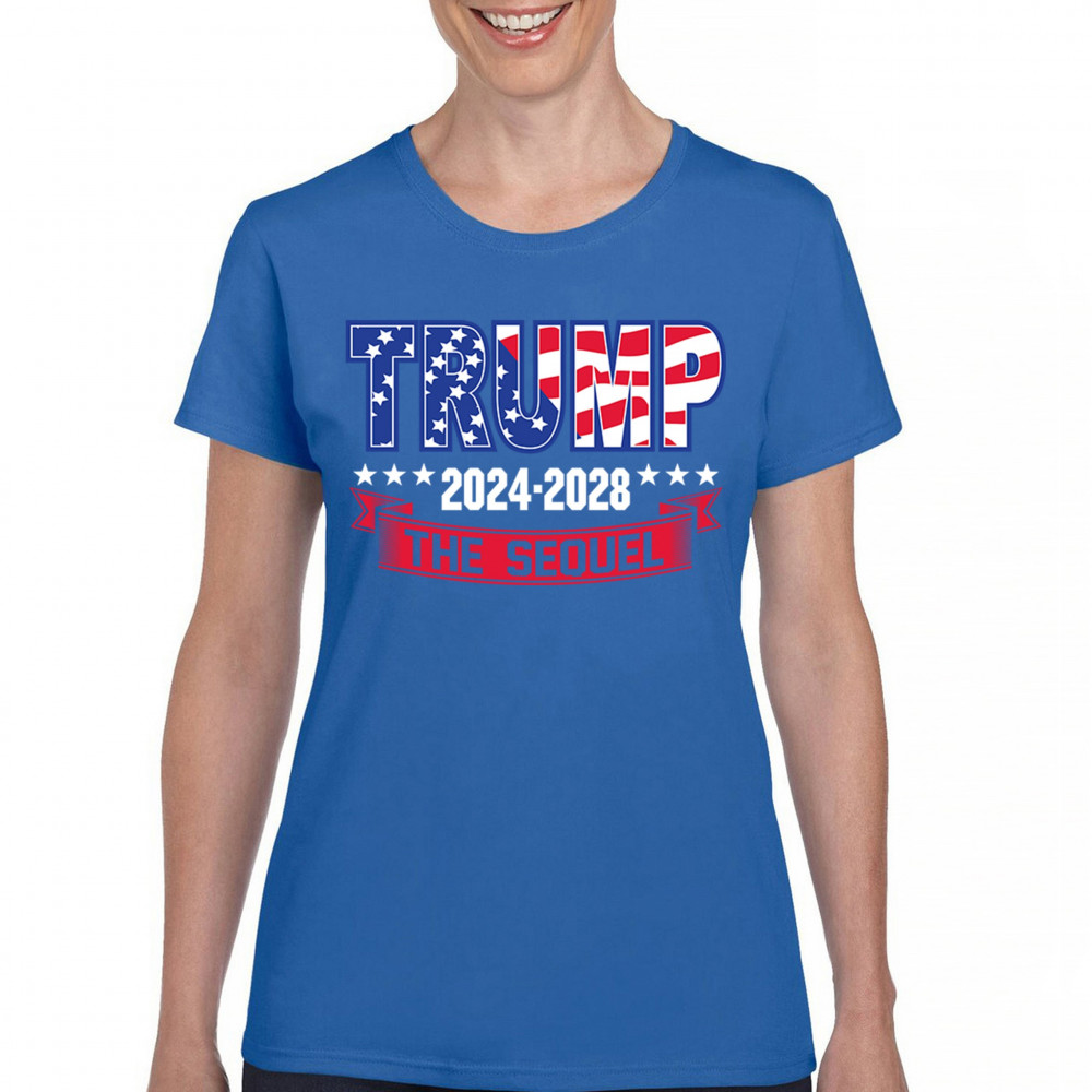 Stand with Trump for 2024-2028 in "The Sequel" design, celebrating America First, conservative values, and 4 more years of patriotic vision.