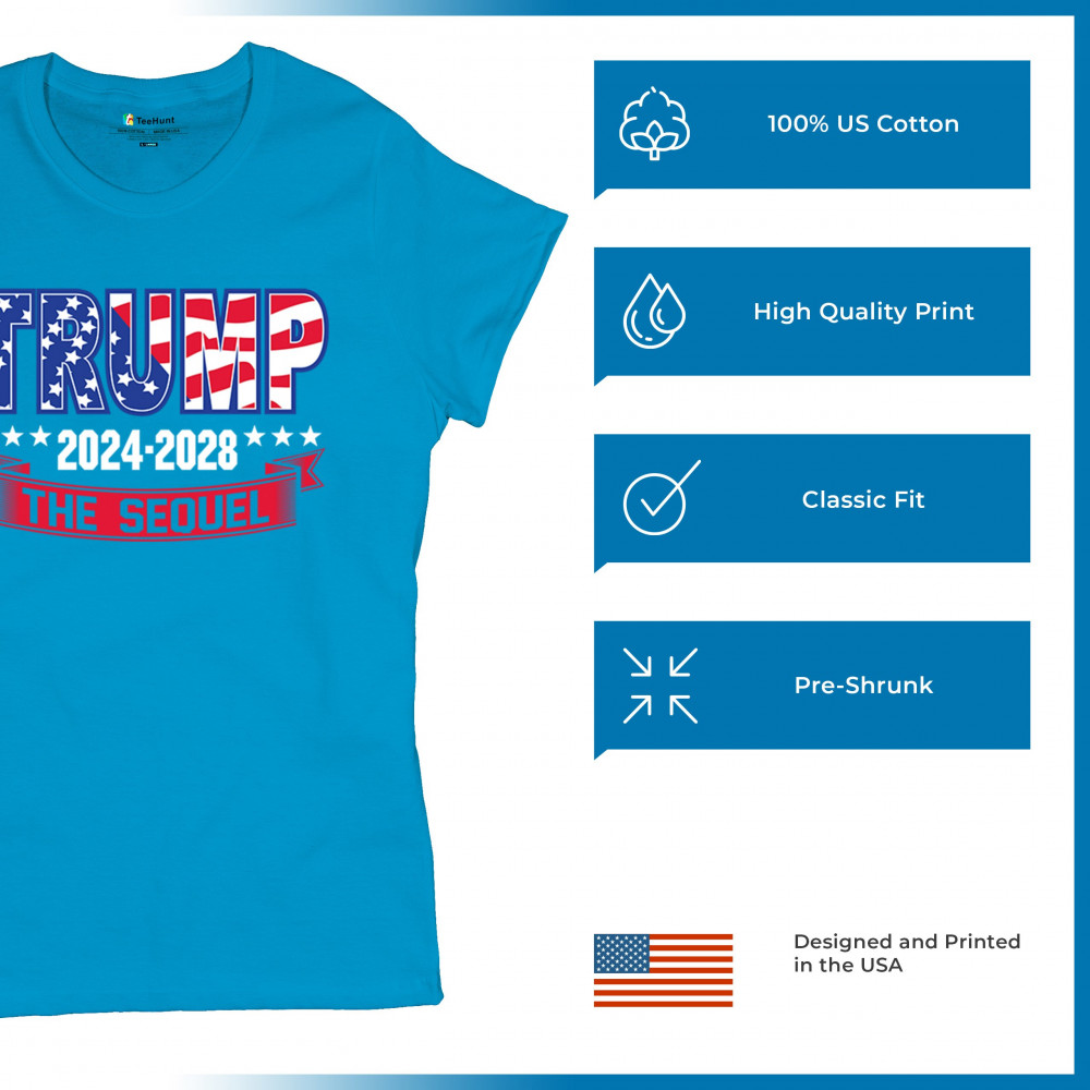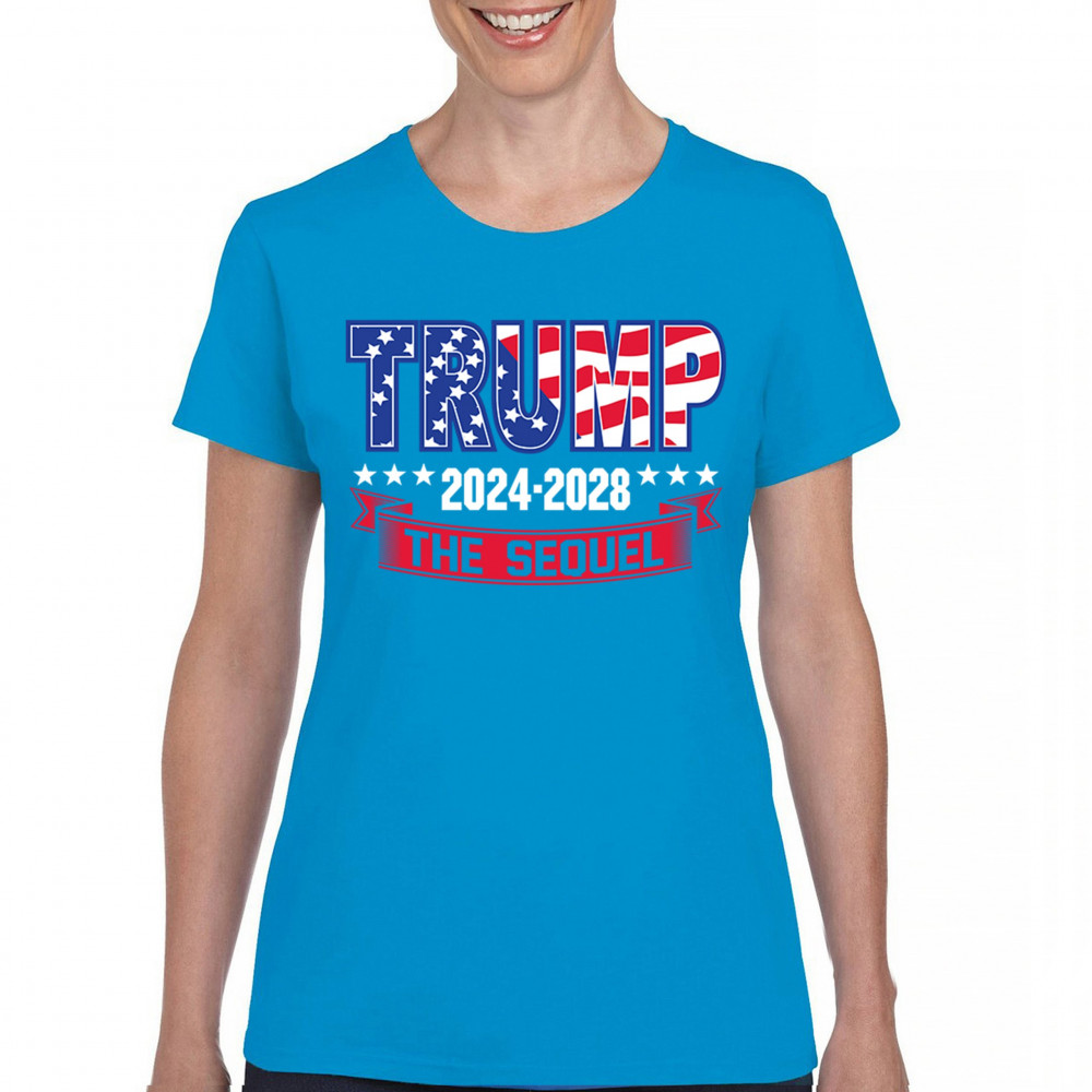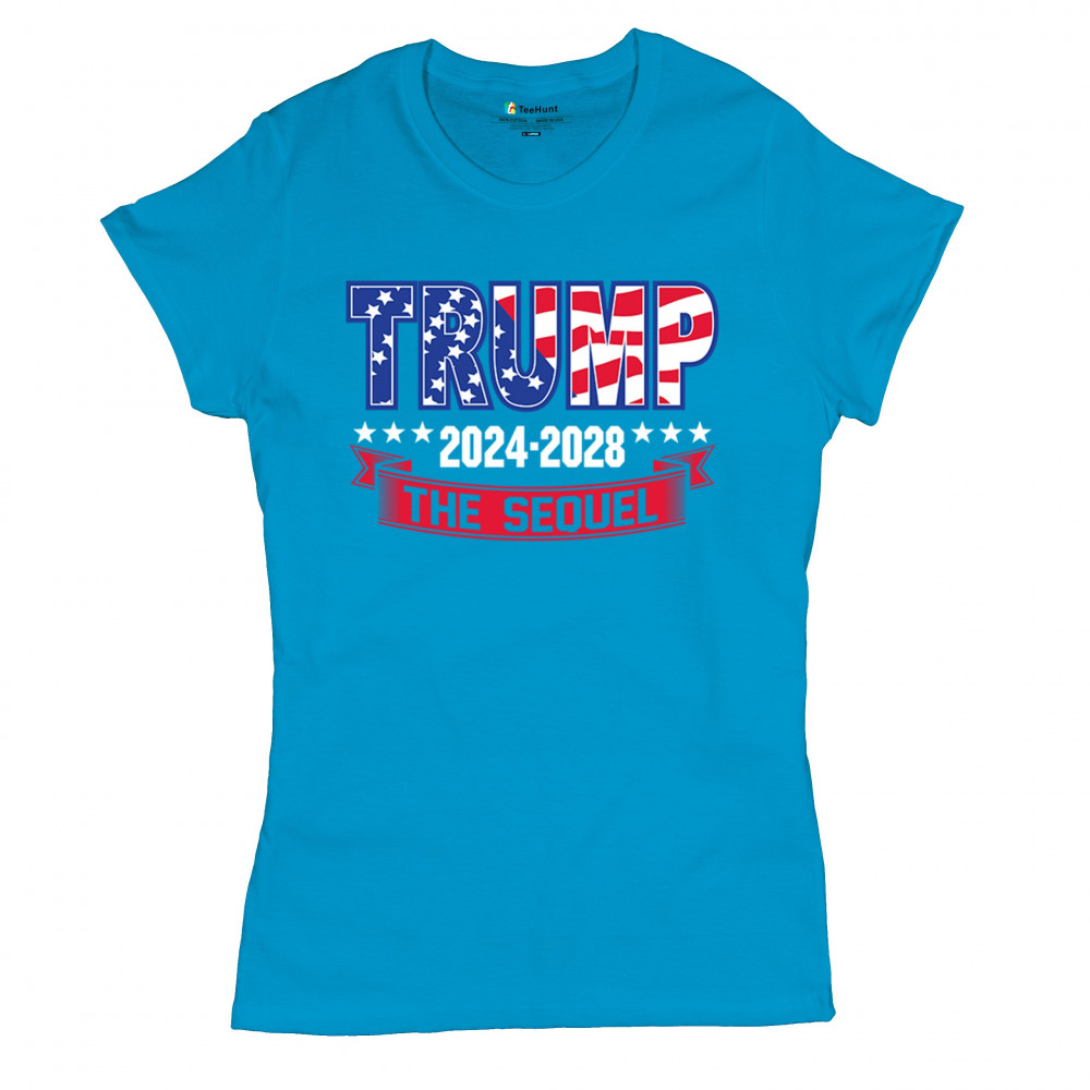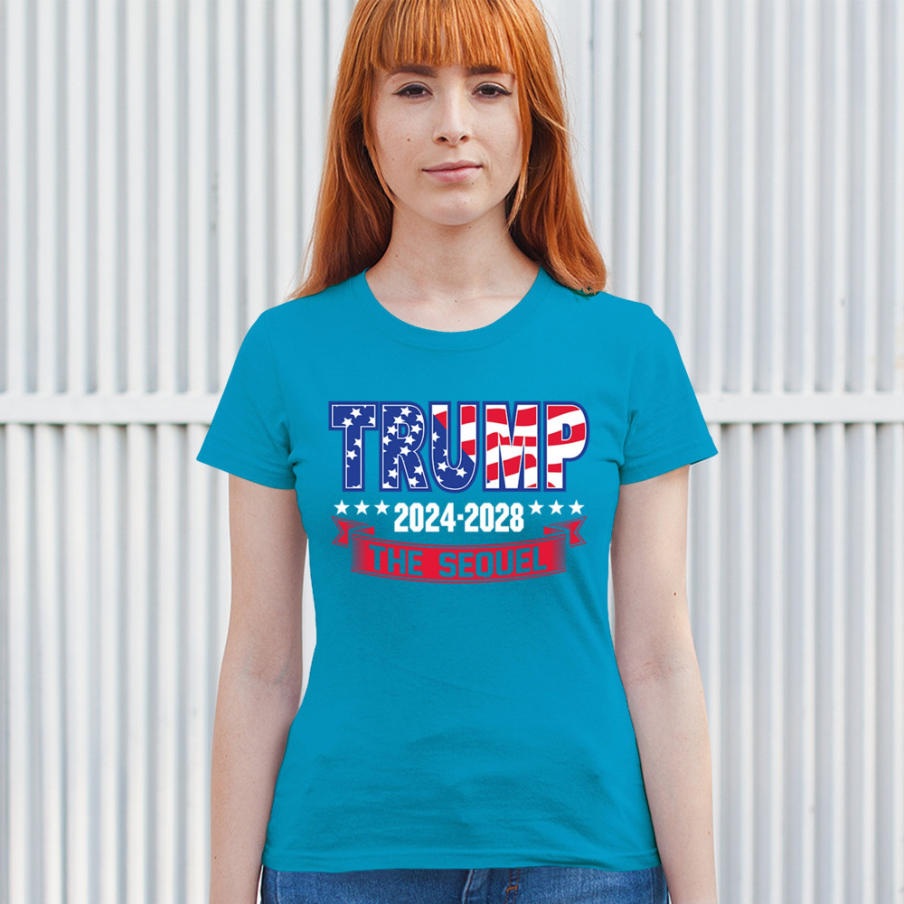 Stand with Trump for 2024-2028 in "The Sequel" design, celebrating America First, conservative values, and 4 more years of patriotic vision.