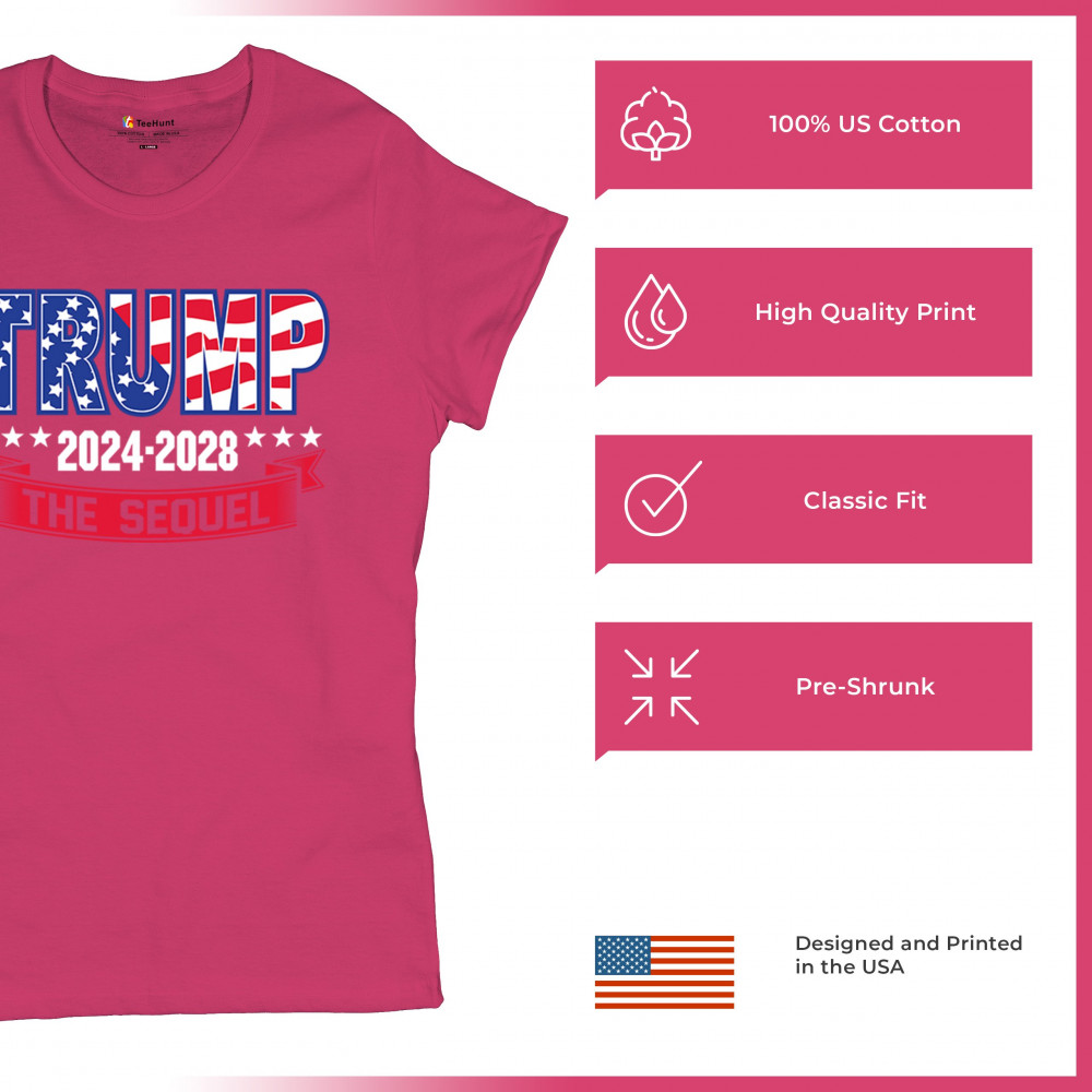 Stand with Trump for 2024-2028 in "The Sequel" design, celebrating America First, conservative values, and 4 more years of patriotic vision.