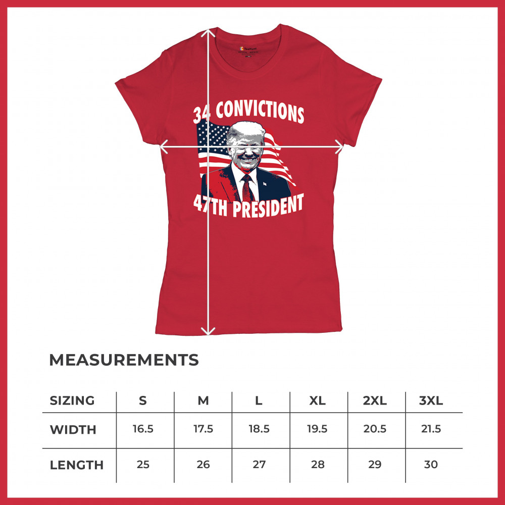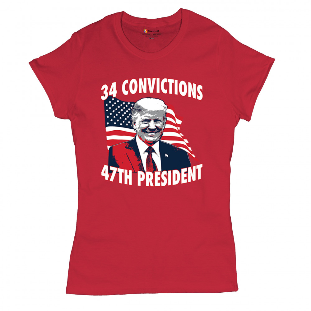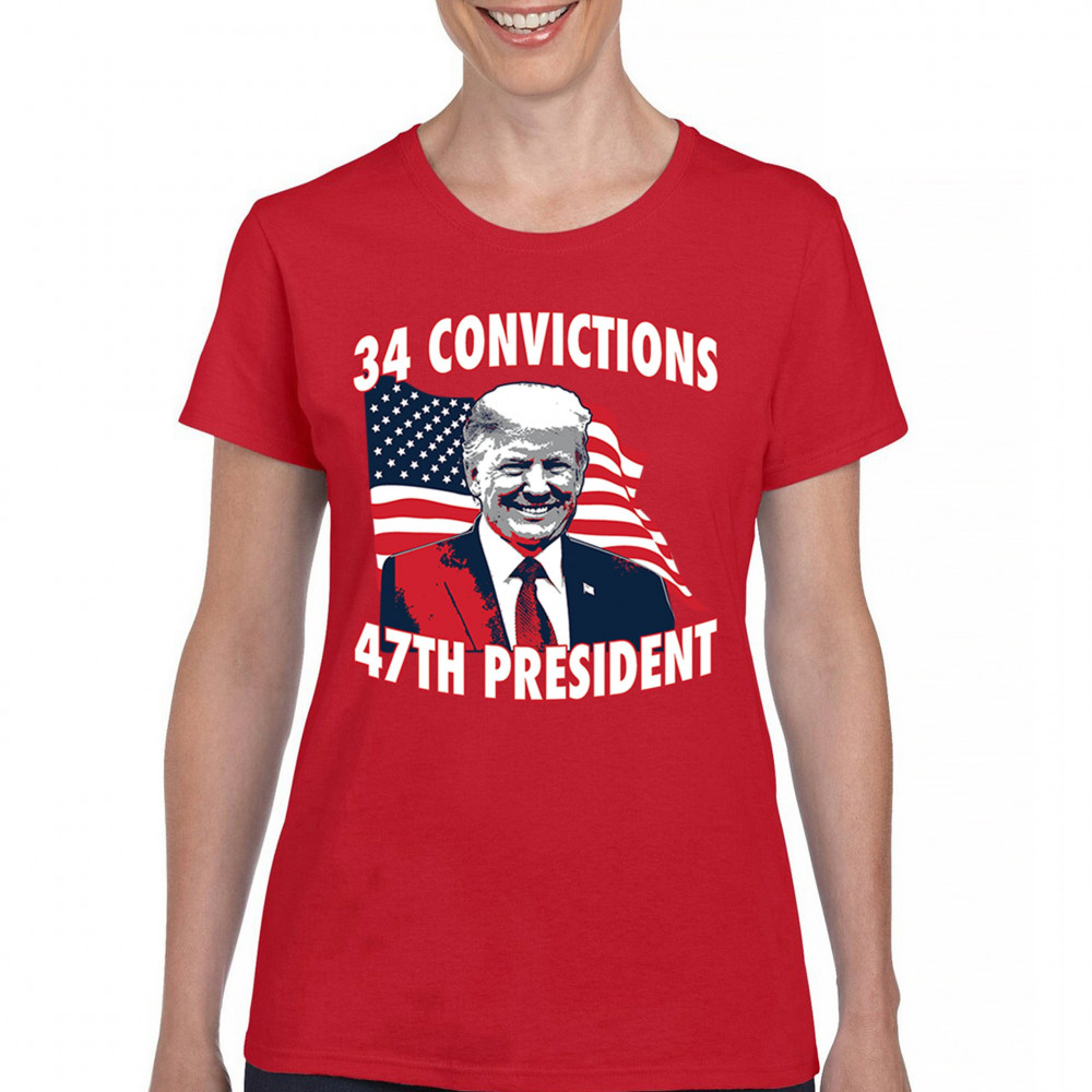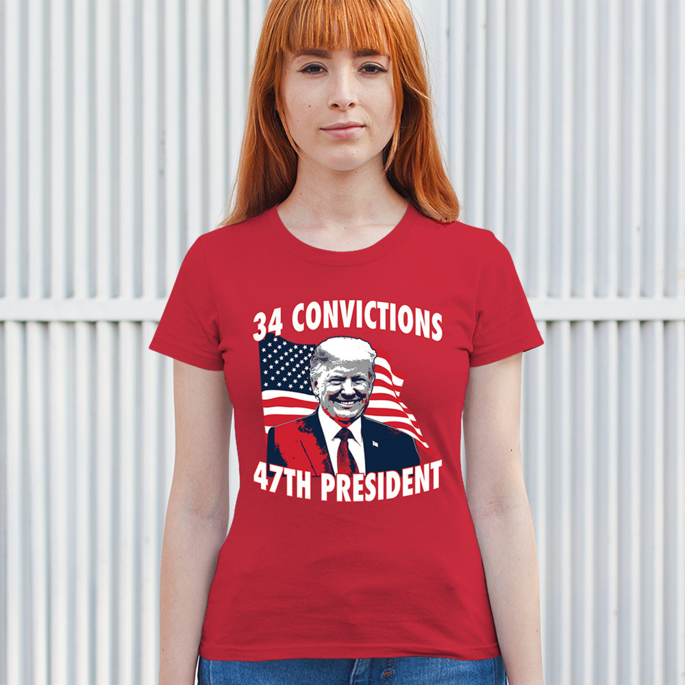 Show your support for Trump's 2024 campaign with the "34 Convictions, 47th President" design. Perfect for rallies, patriotic events, and conservative gatherings.