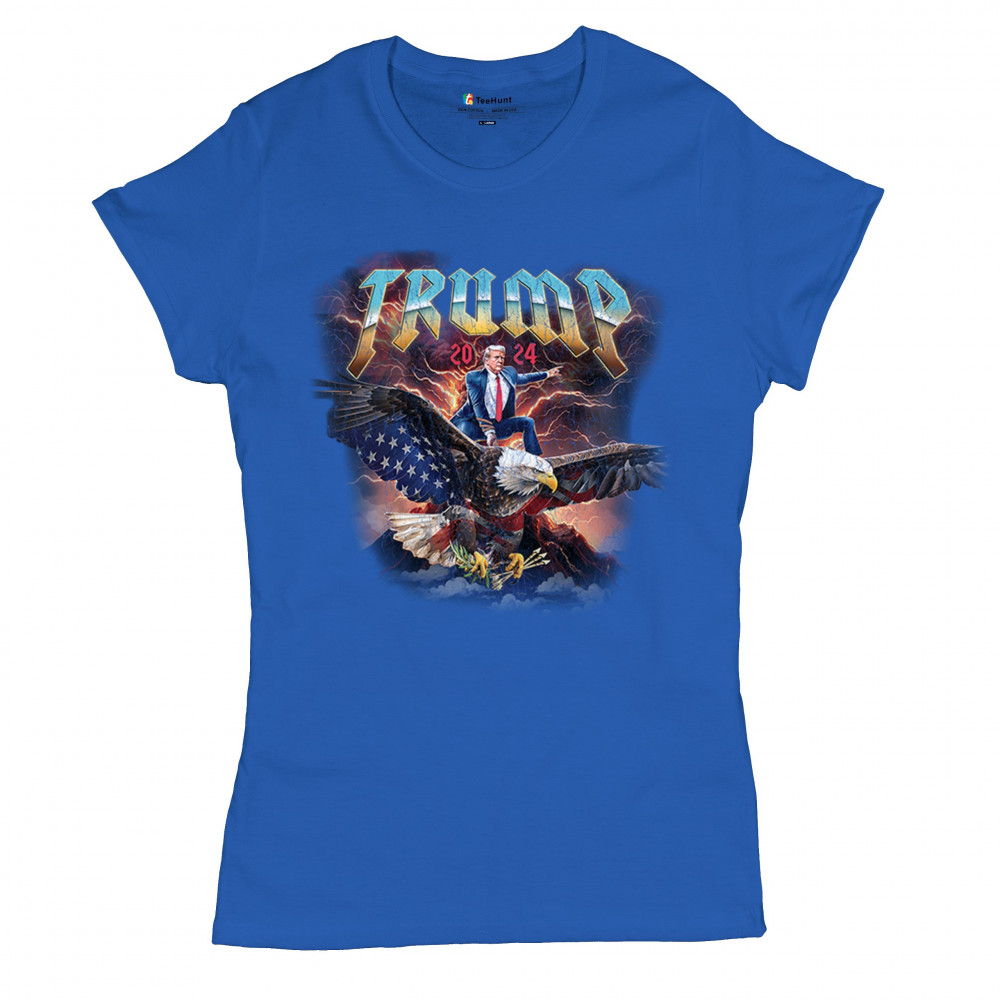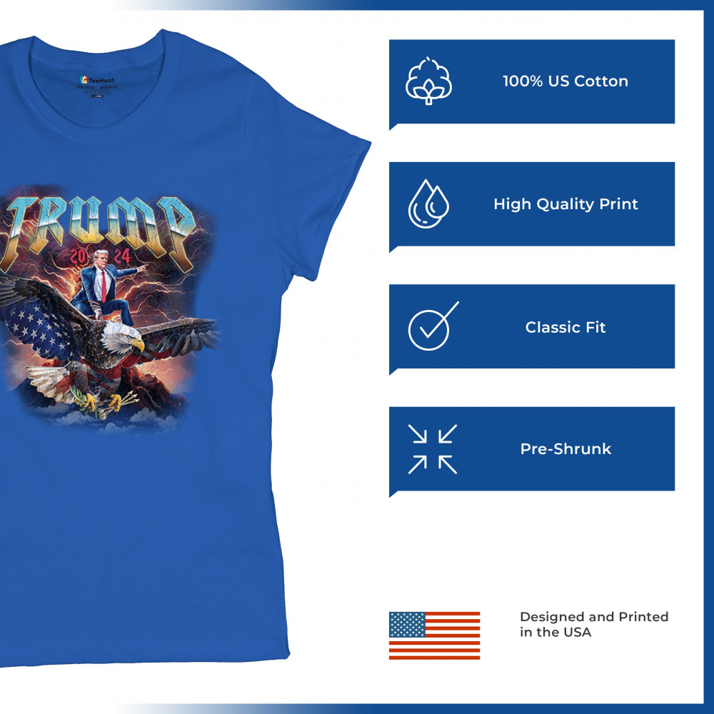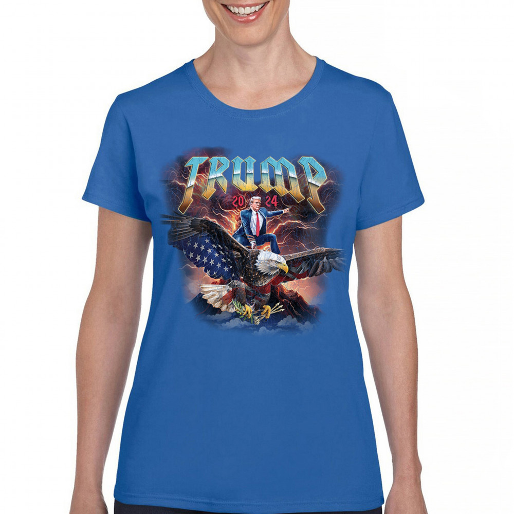 Stand out with our "Trump 2024" design featuring Trump riding an eagle. Perfect for rallies and patriotic events. Show your support with pride and confidence.