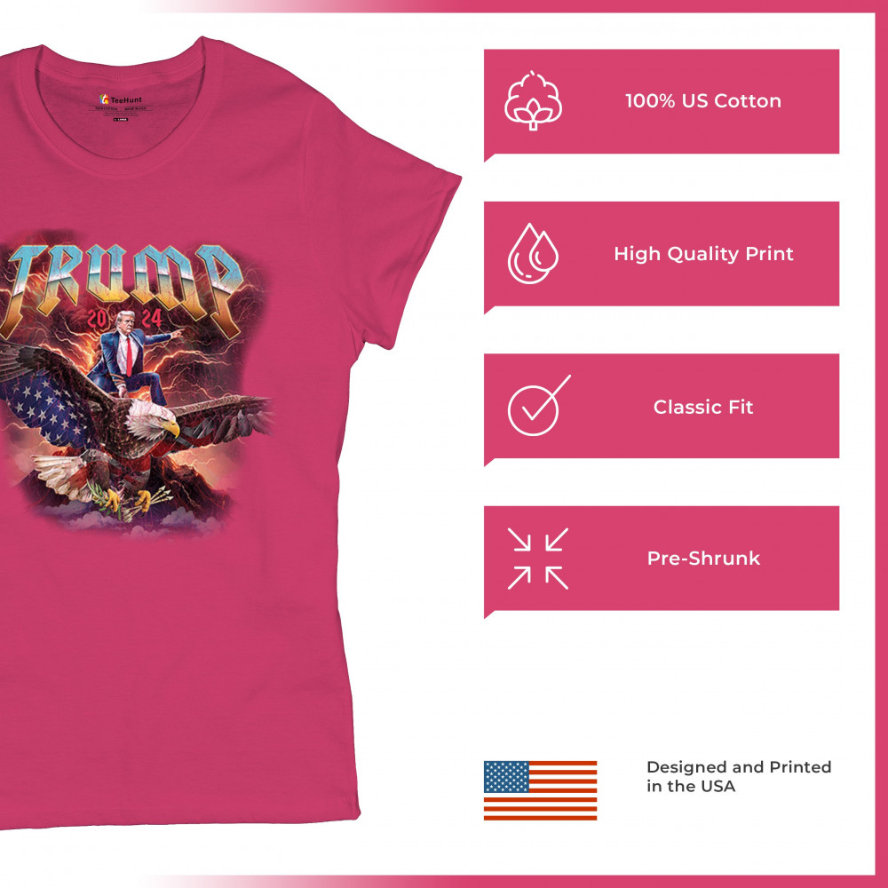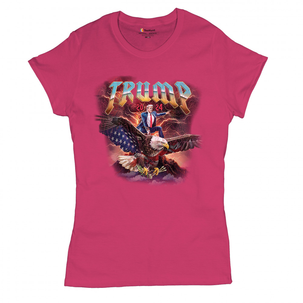 Stand out with our "Trump 2024" design featuring Trump riding an eagle. Perfect for rallies and patriotic events. Show your support with pride and confidence.