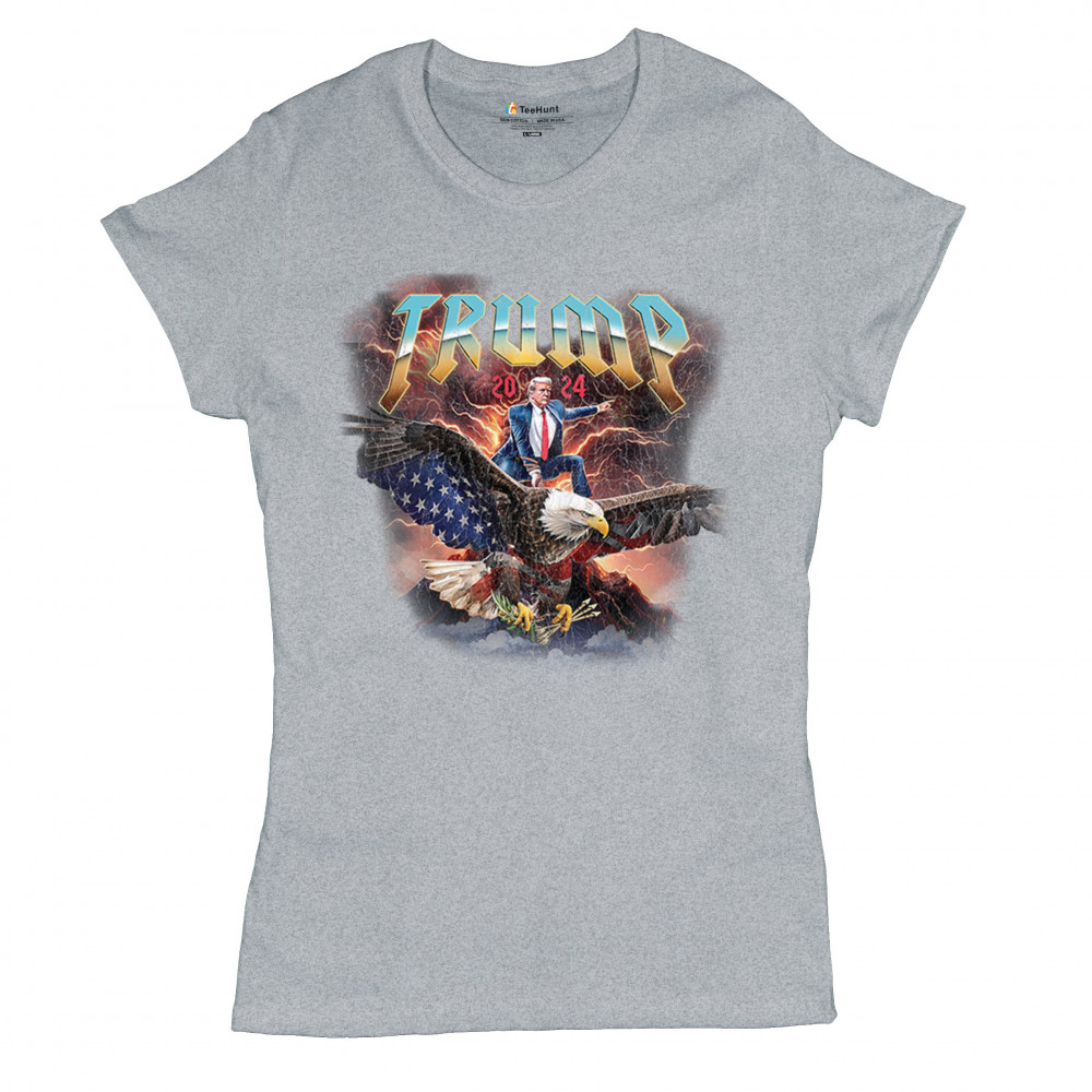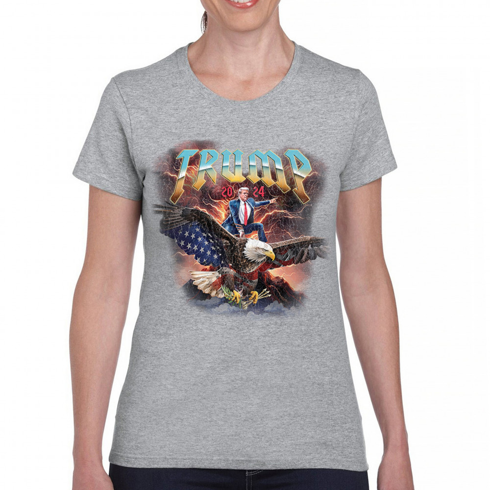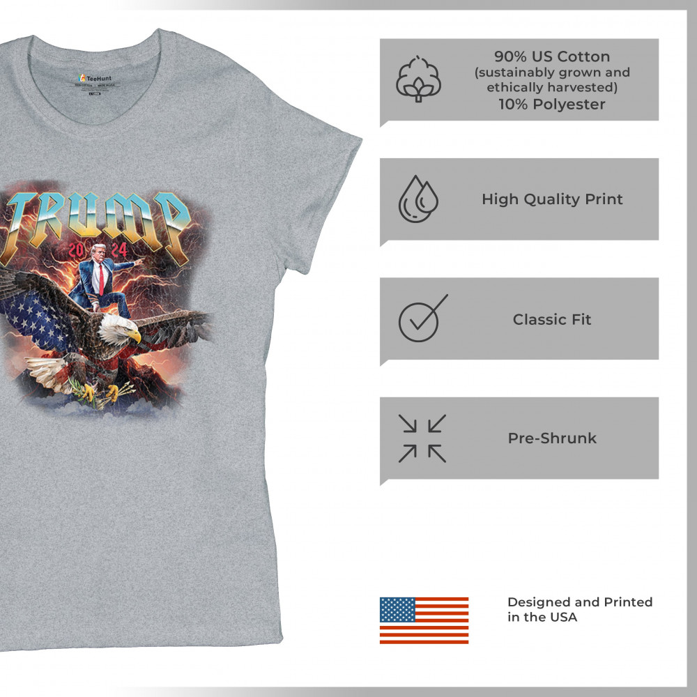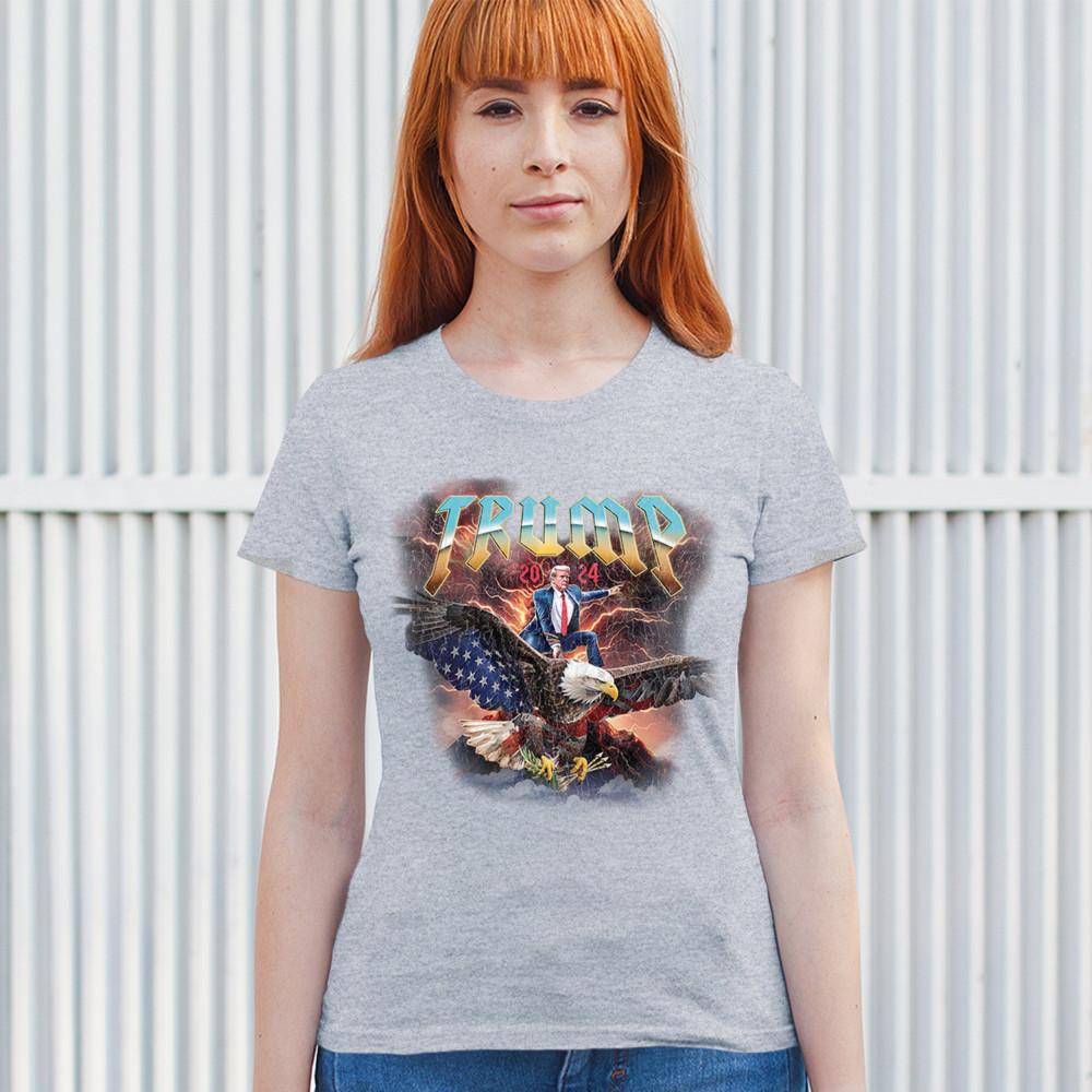 Stand out with our "Trump 2024" design featuring Trump riding an eagle. Perfect for rallies and patriotic events. Show your support with pride and confidence.