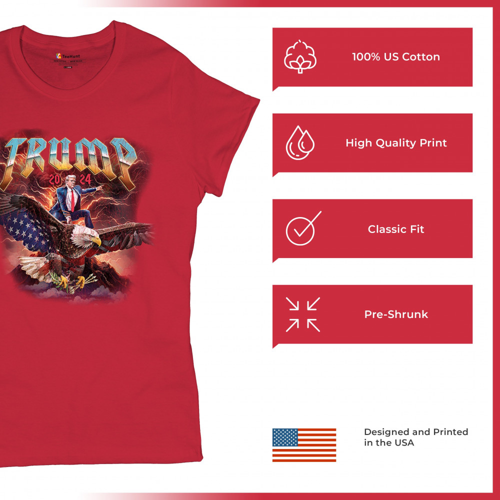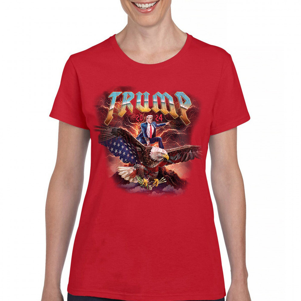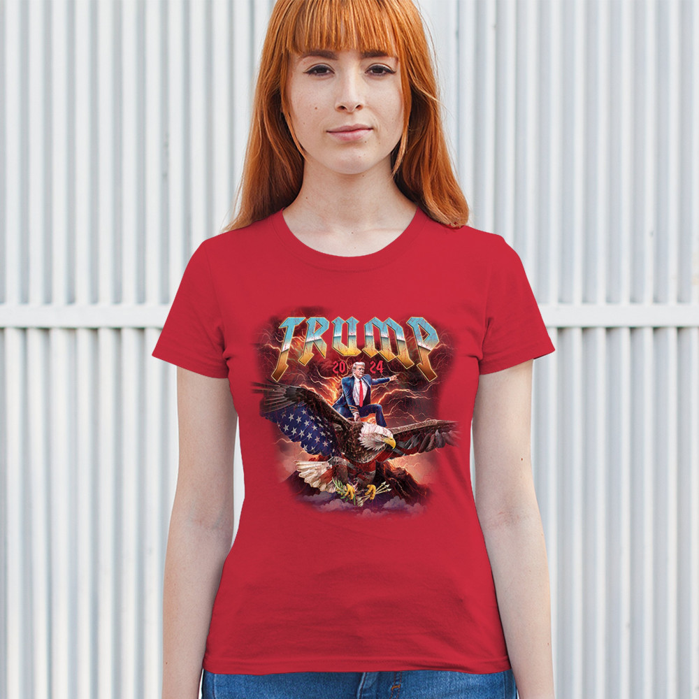 Stand out with our "Trump 2024" design featuring Trump riding an eagle. Perfect for rallies and patriotic events. Show your support with pride and confidence.