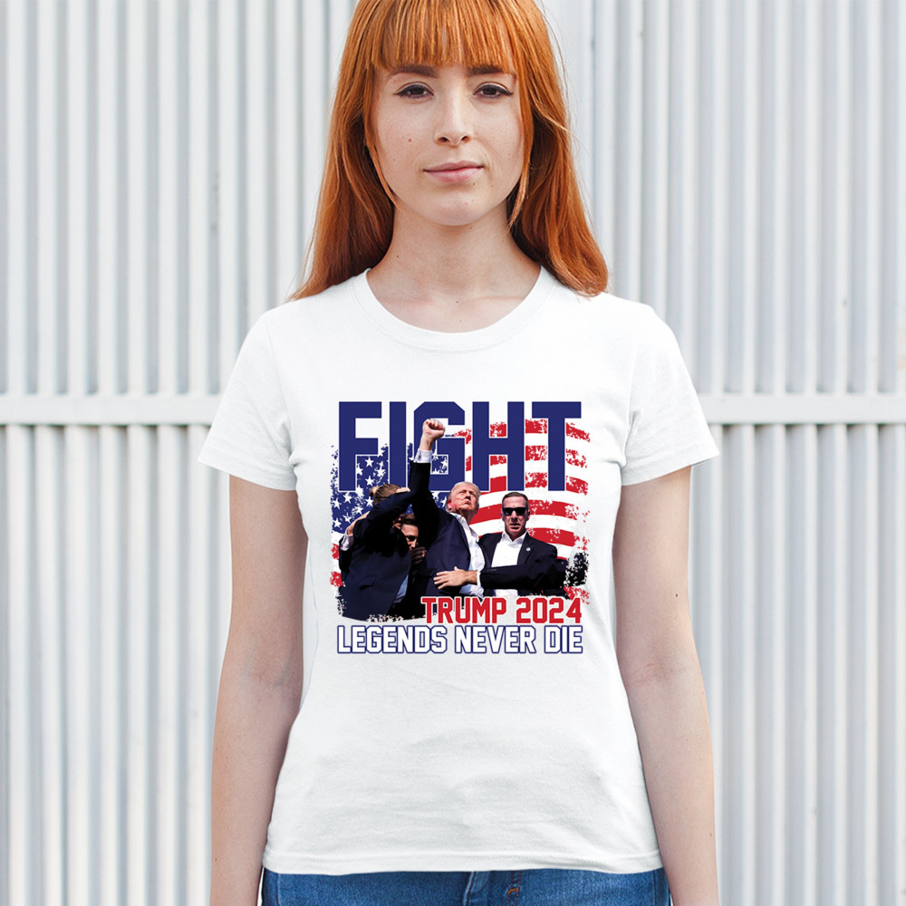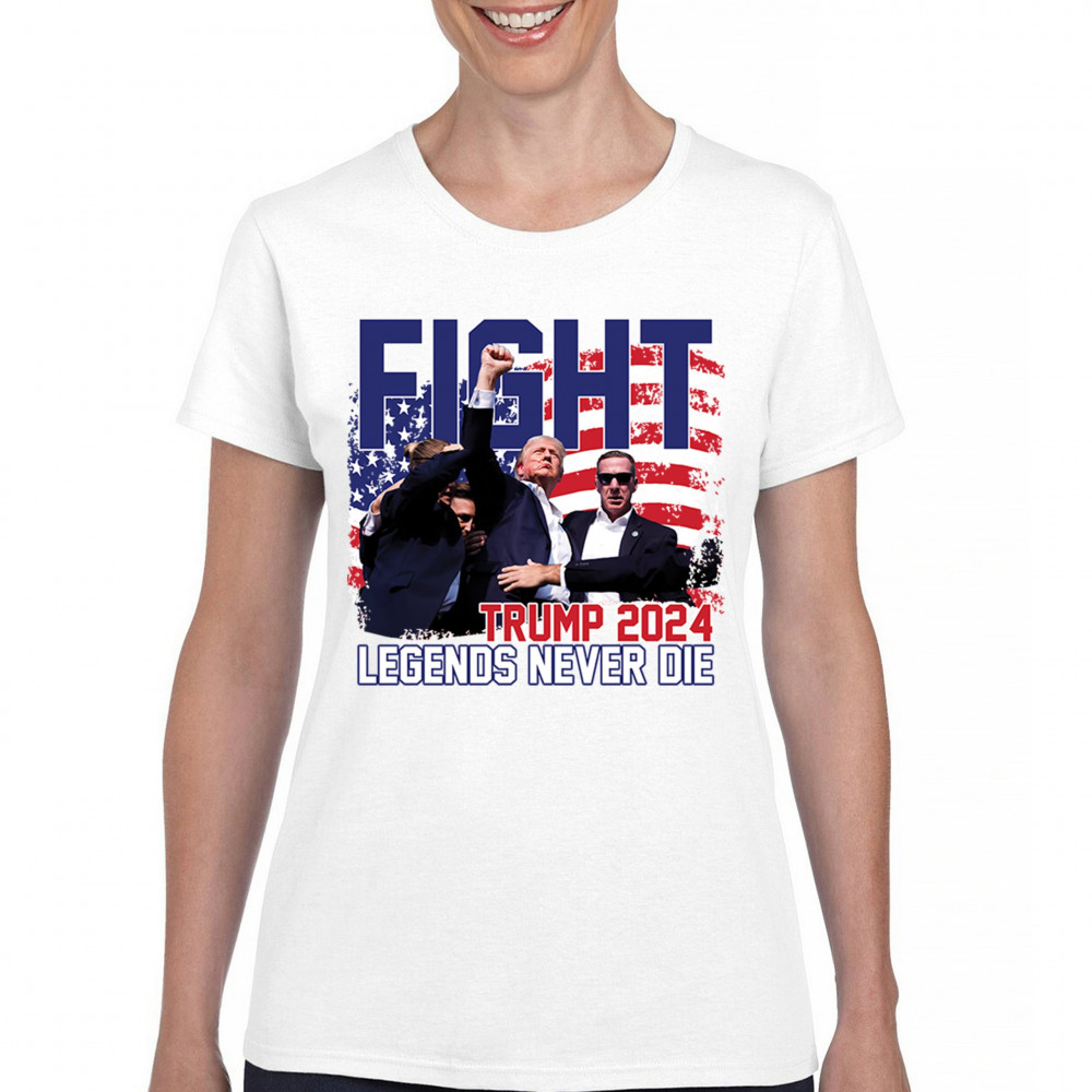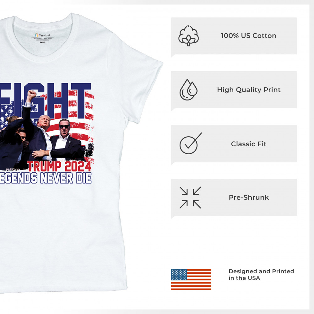 Show your Trump 2024 support with our bold "Fight" design, featuring "Legends Never Die" and a patriotic American flag. Perfect for rallies and everyday wear.