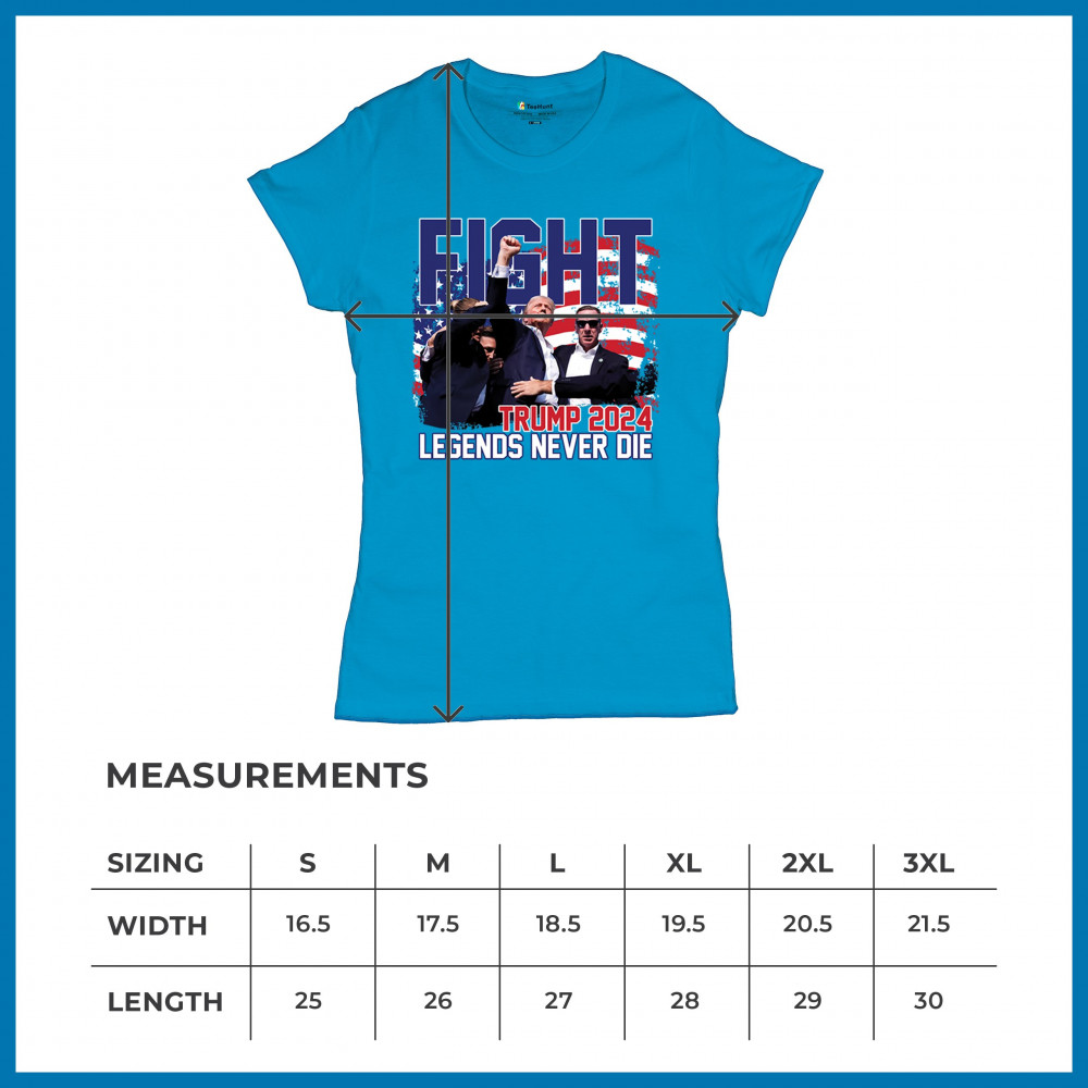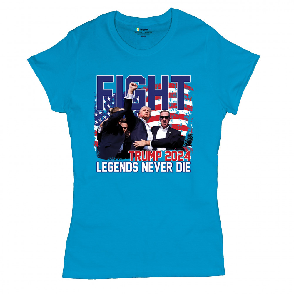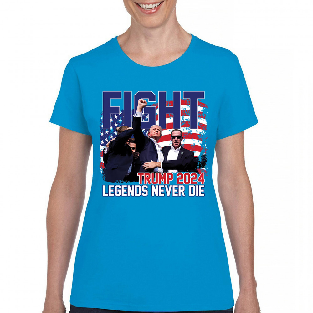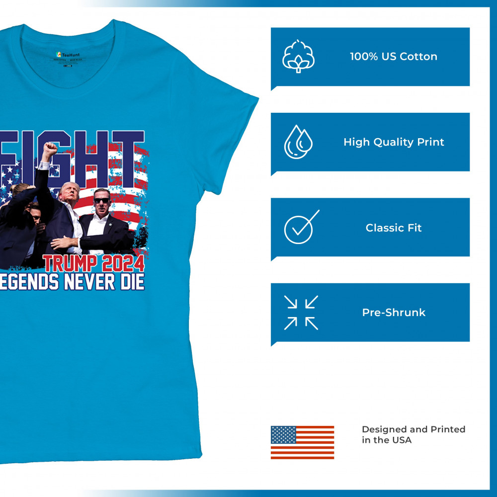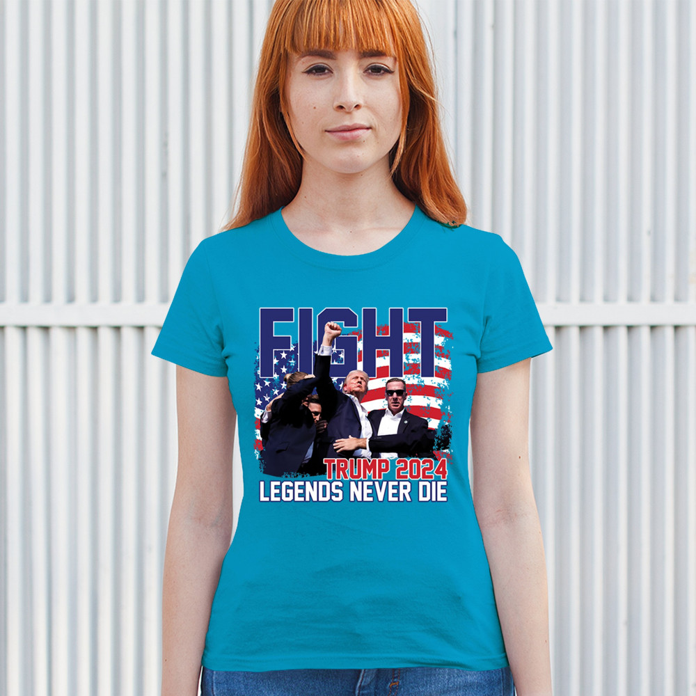 Show your Trump 2024 support with our bold "Fight" design, featuring "Legends Never Die" and a patriotic American flag. Perfect for rallies and everyday wear.