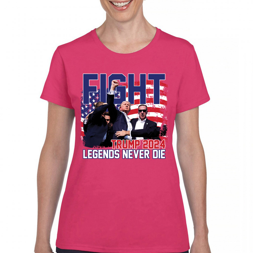 Show your Trump 2024 support with our bold "Fight" design, featuring "Legends Never Die" and a patriotic American flag. Perfect for rallies and everyday wear.